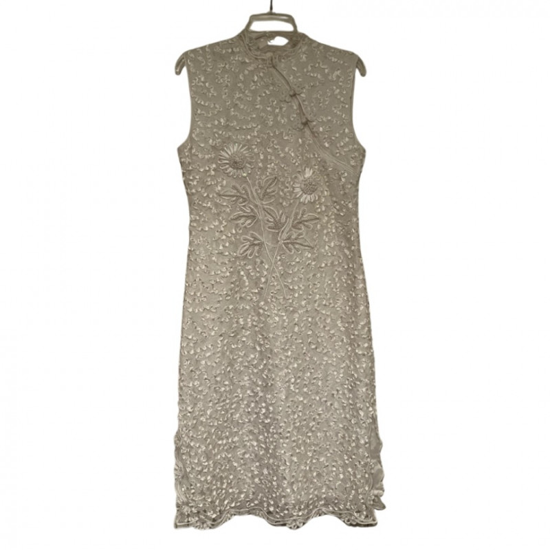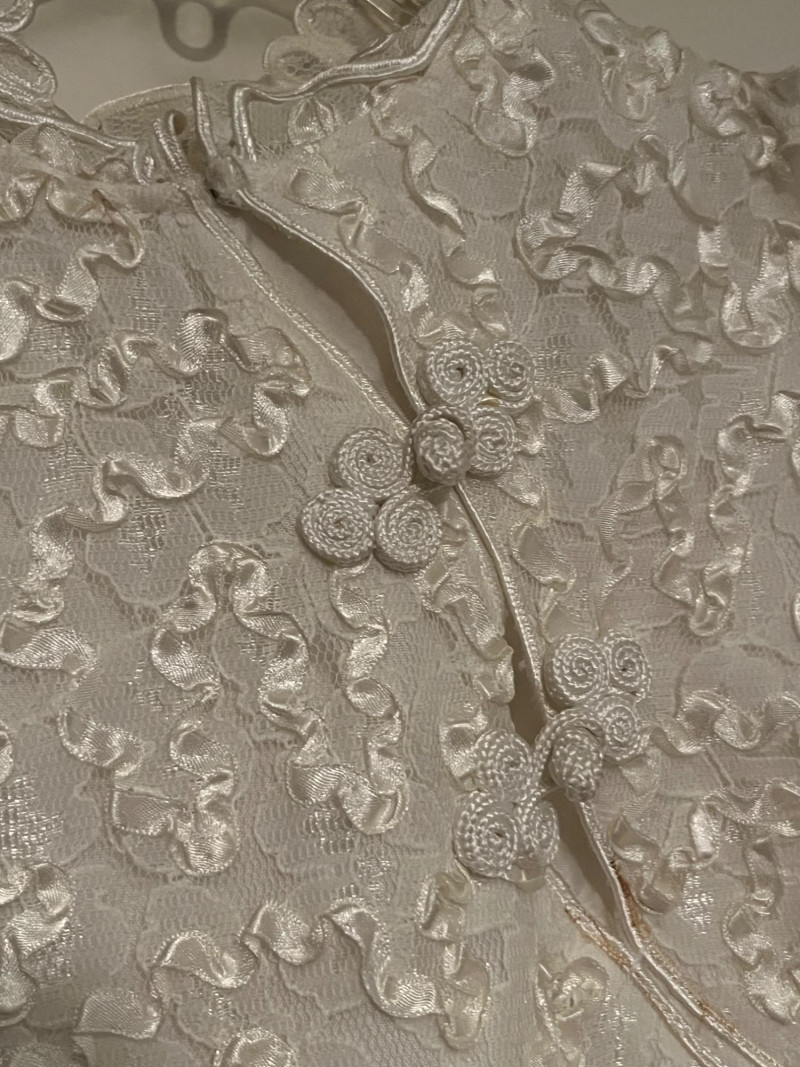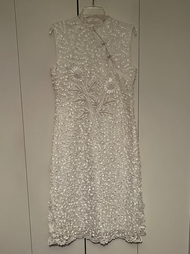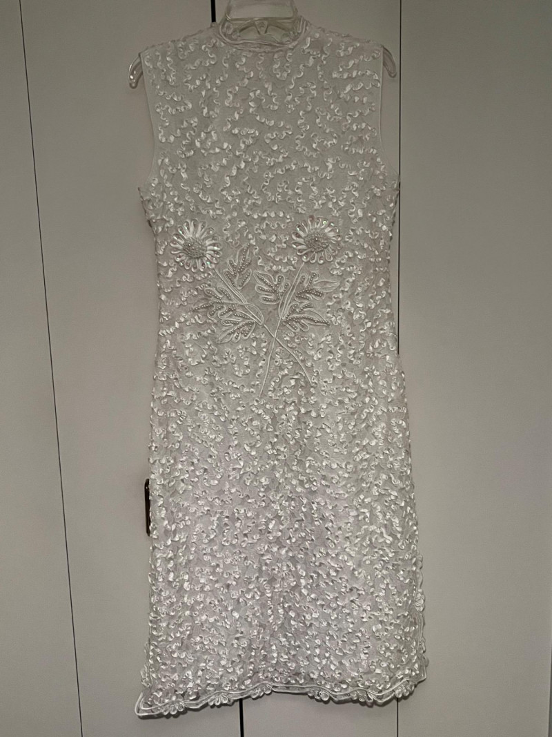 Beautiful beaded women’s dress. Styled like a cheongsam, this neckline has a distinctly Asian flair. The fabric throughout has folded ribbon over lace, with a center flower on the front and back side. There is a zipper on one side of the skirt for easier changing. Small stain on the button area. No size tags but estimated to be a women’s 4.