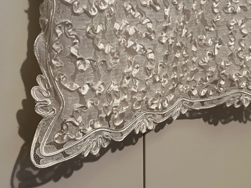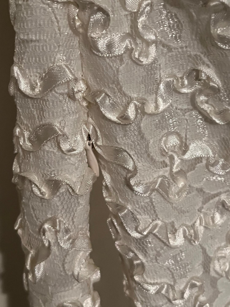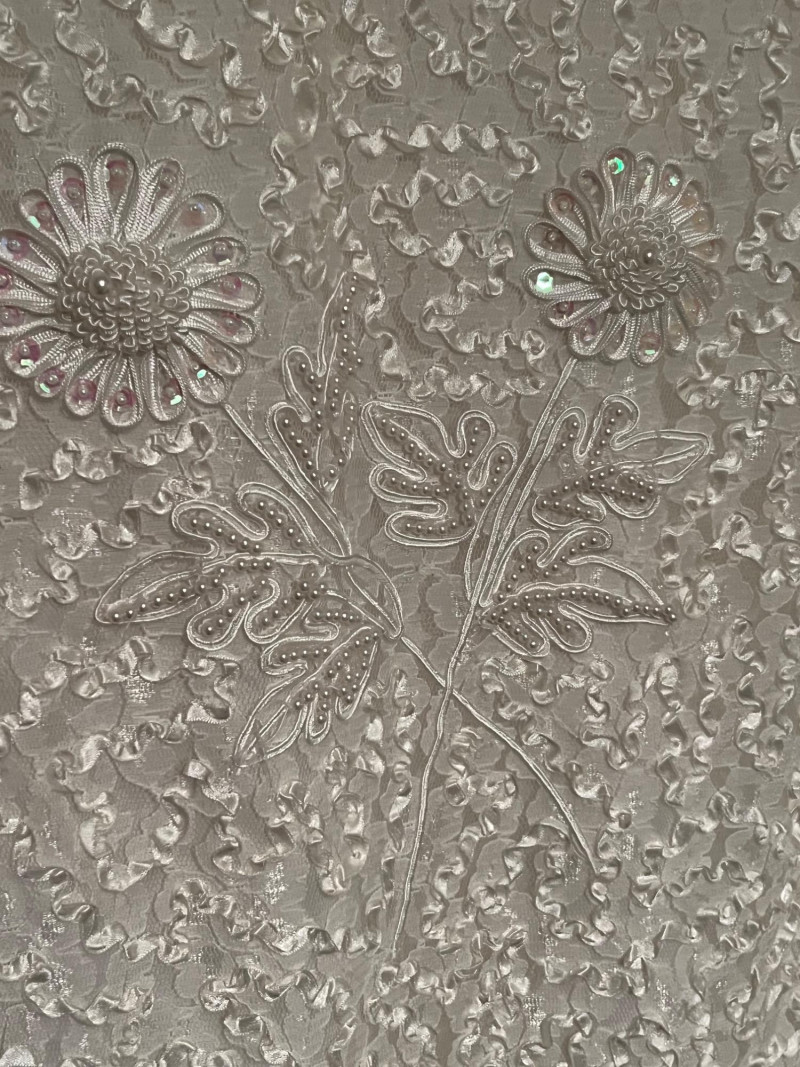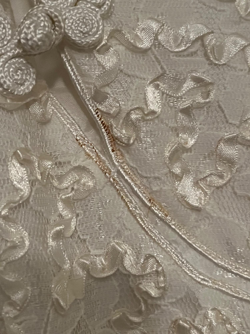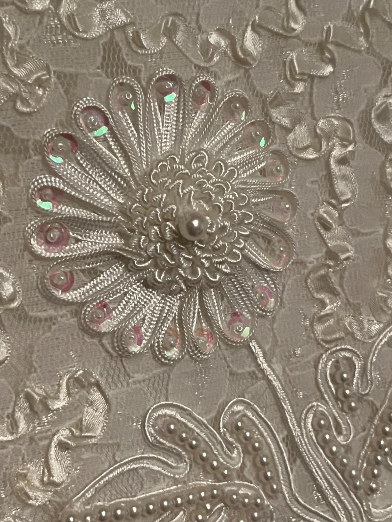Beautiful beaded women’s dress. Styled like a cheongsam, this neckline has a distinctly Asian flair. The fabric throughout has folded ribbon over lace, with a center flower on the front and back side. There is a zipper on one side of the skirt for easier changing. Small stain on the button area. No size tags but estimated to be a women’s 4.