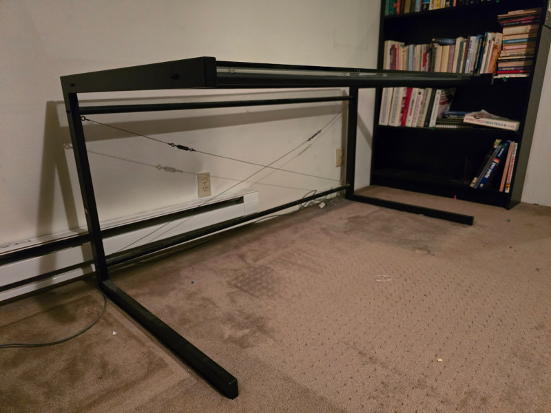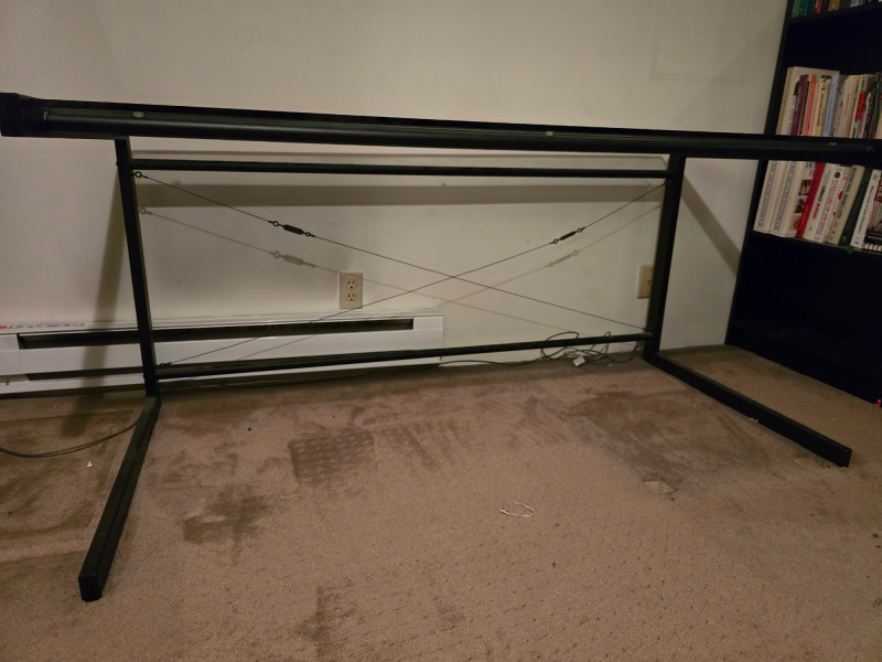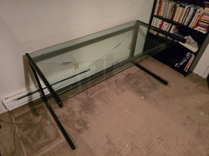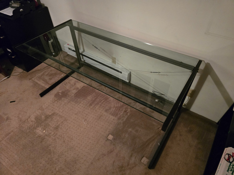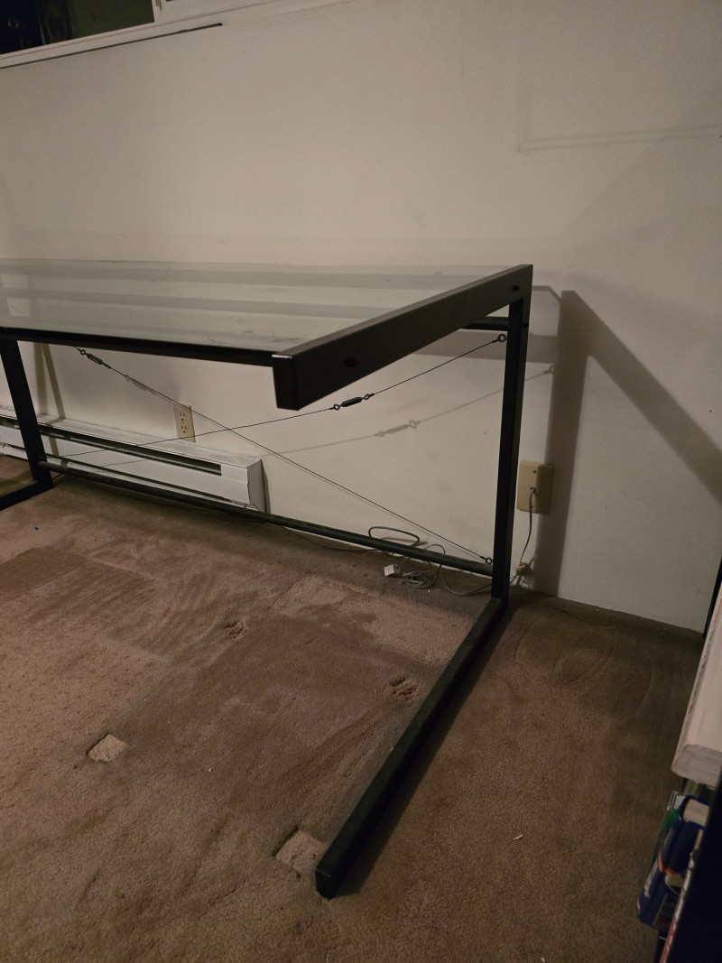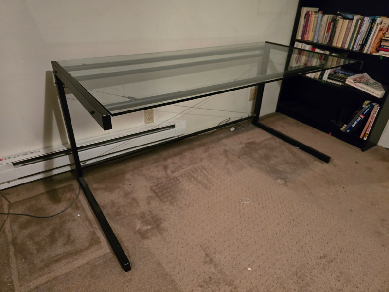 Minimalist modern glass and metal desk. Glass top is free from cracks or chips. Great size for anything from a laptop to a dual monitor desktop. Sleek design means there’s room to add storage underneath. A practical choice for the understated study nights.