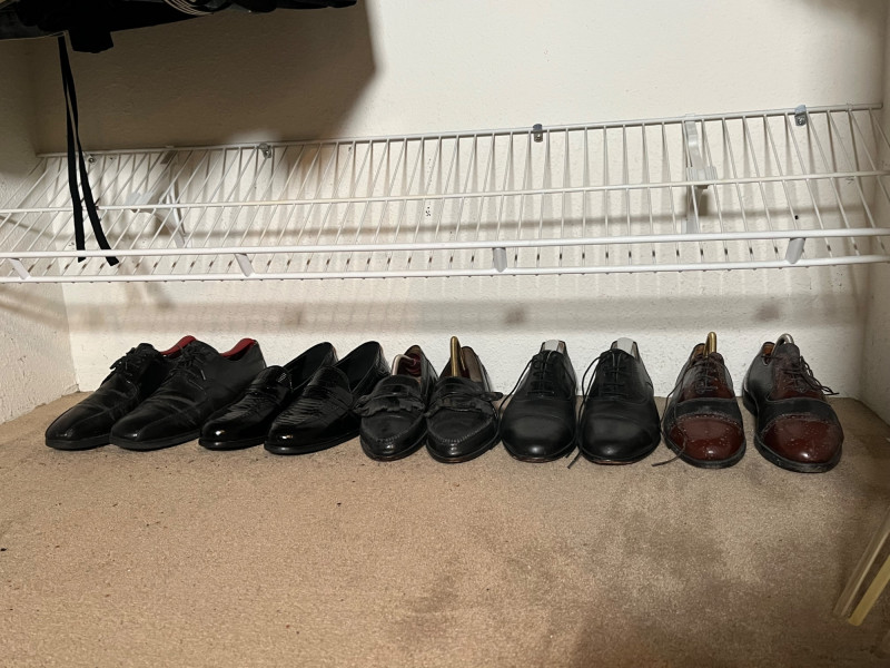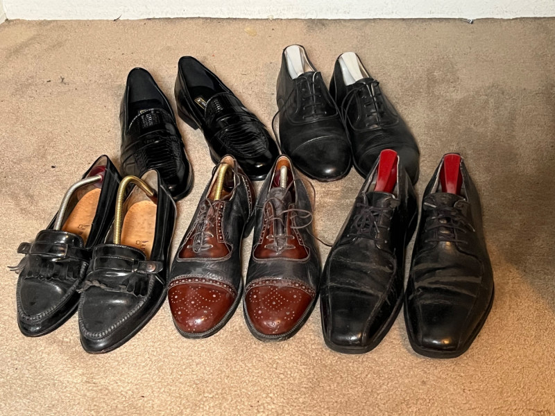 Lot of 5 pairs of men’s dress shoes. Shoes are size 7 - 7 1/2 men’s sizes. Pairs include forms help maintain the shape of the shoes when not worn. Variety of styles for every occasion- job interviews, to weddings, to court dates.