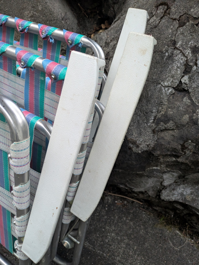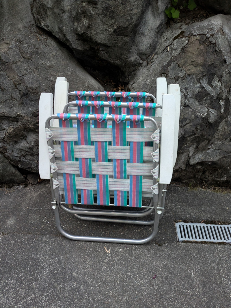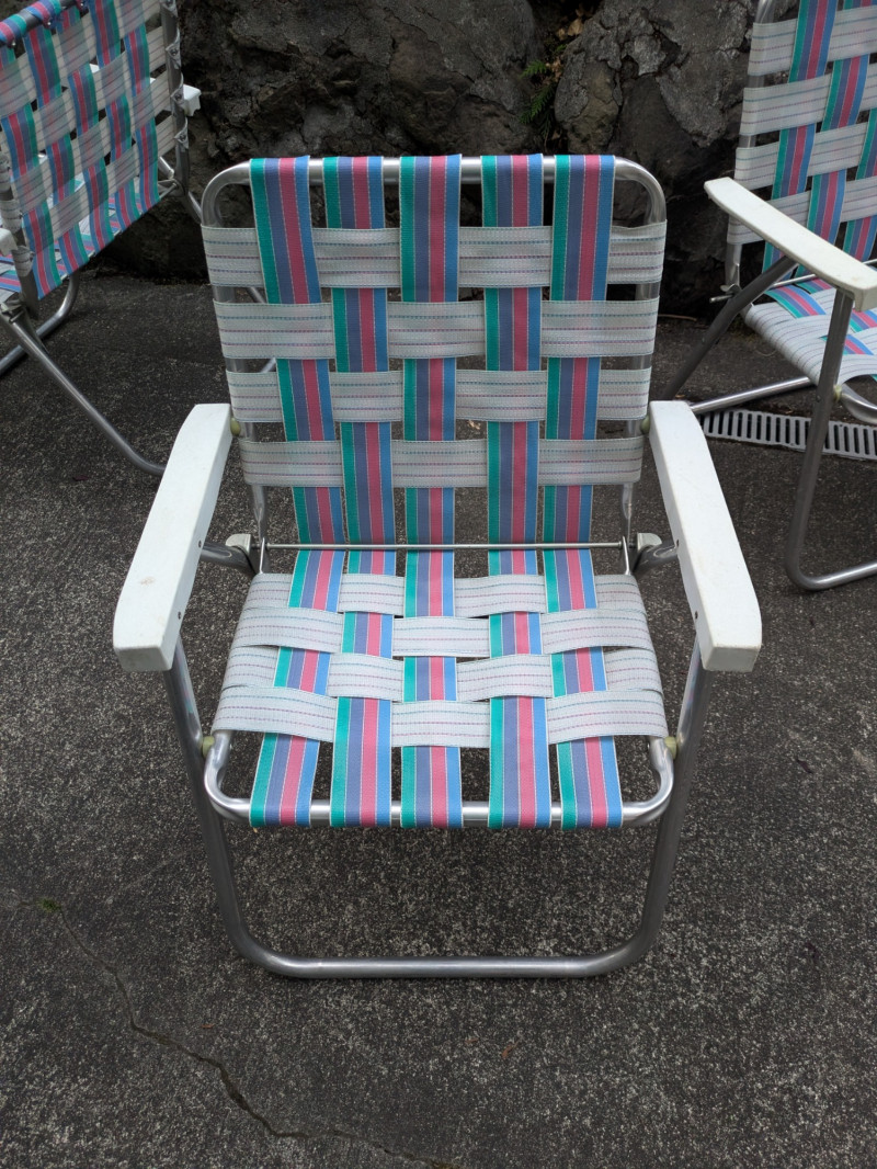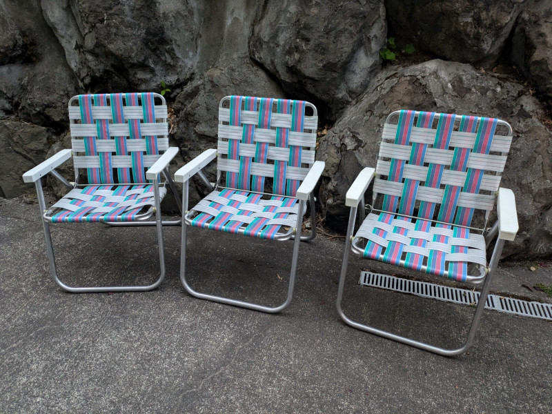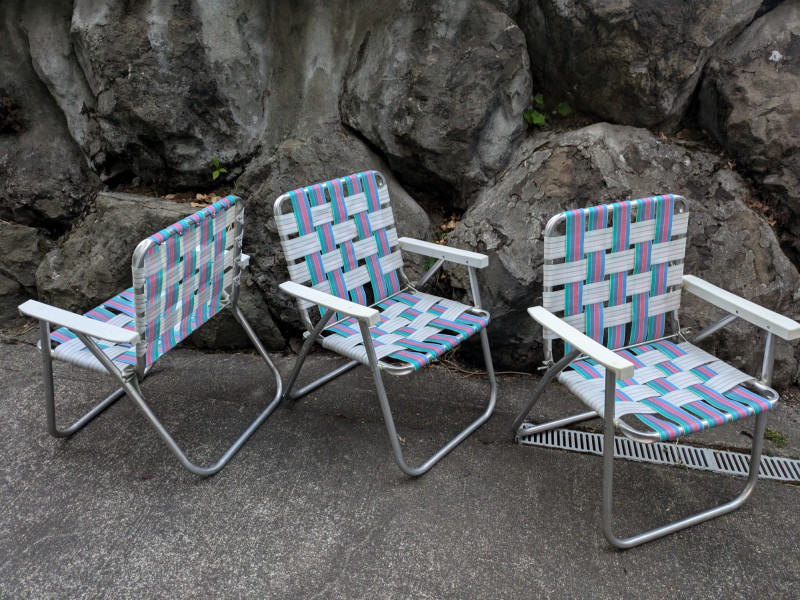set of 3 vintage outdoor folding chairs. No rips or tears in the weave, with iconic late 80s-early 90s colors. A staple of every backyard family BBQ, these chairs are the key to a season of good days, and great memories.