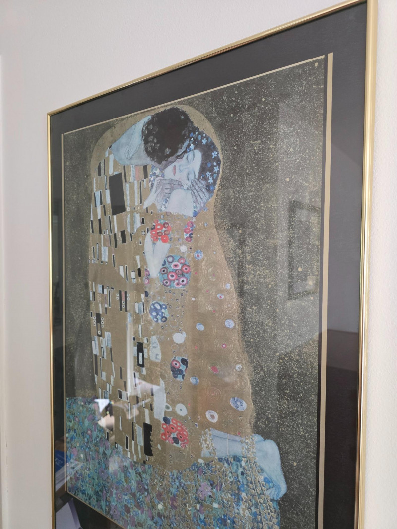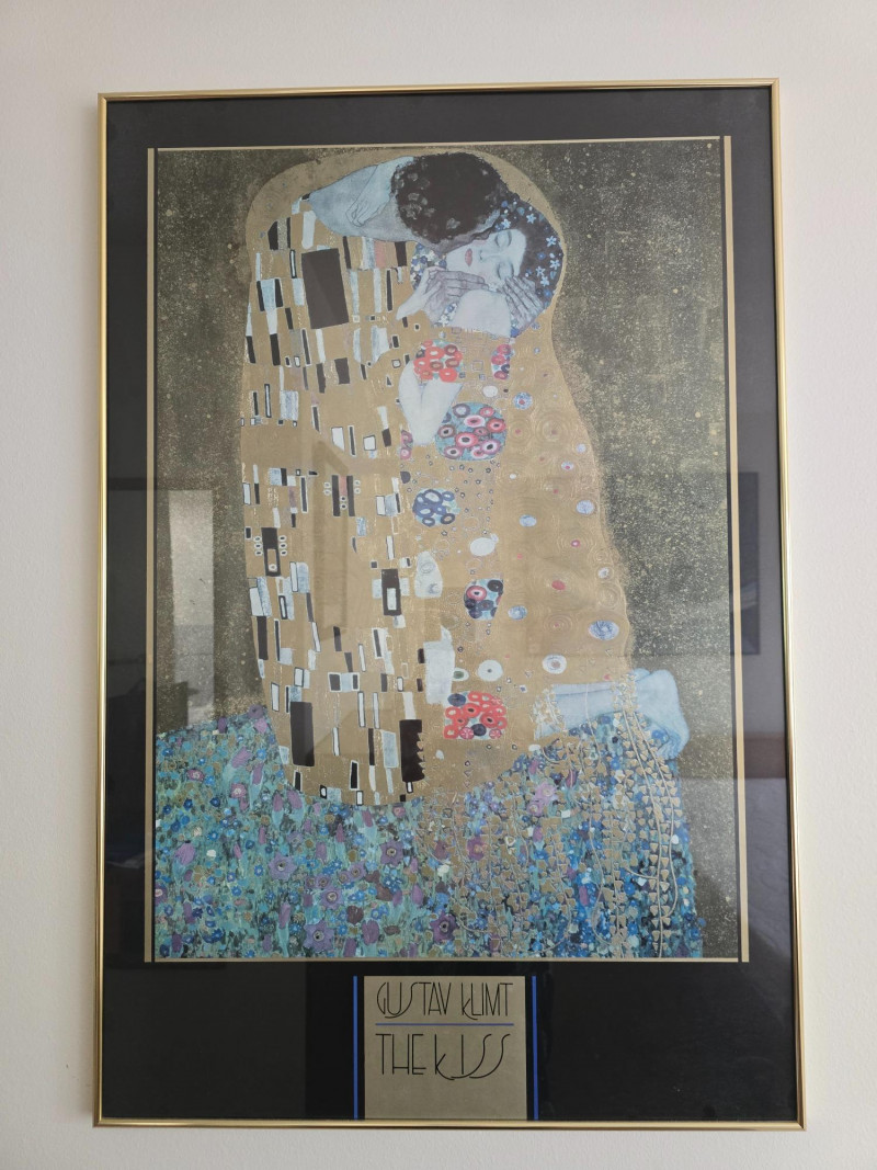 The Kiss is an oil-on-canvas painting with added gold leaf, silver and platinum by the Austrian Symbolist painter Gustav Klimt. It was painted at some point in 1907 and 1908, during the height of what scholars call his "Golden Period". The painting depicts a couple embracing each other, their bodies entwined in elaborate robes decorated in a style influenced by the contemporary Art Nouveau style and the organic forms of the earlier Arts and Crafts movement. This is a high quality reproduction framed print.