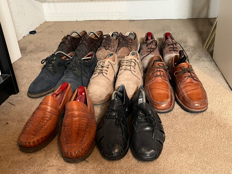 Lot of men’s casual shoes. Sizes range from men’s 7- 7 1/2. Variety of styles and colors to help get any wardrobe off the ground. Includes shoe forms to help the shoes maintain their shape when stored in a closet unworn. 8 total pairs of shoes.