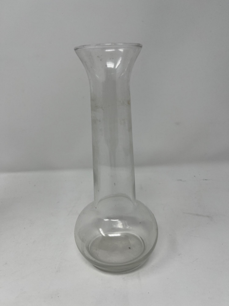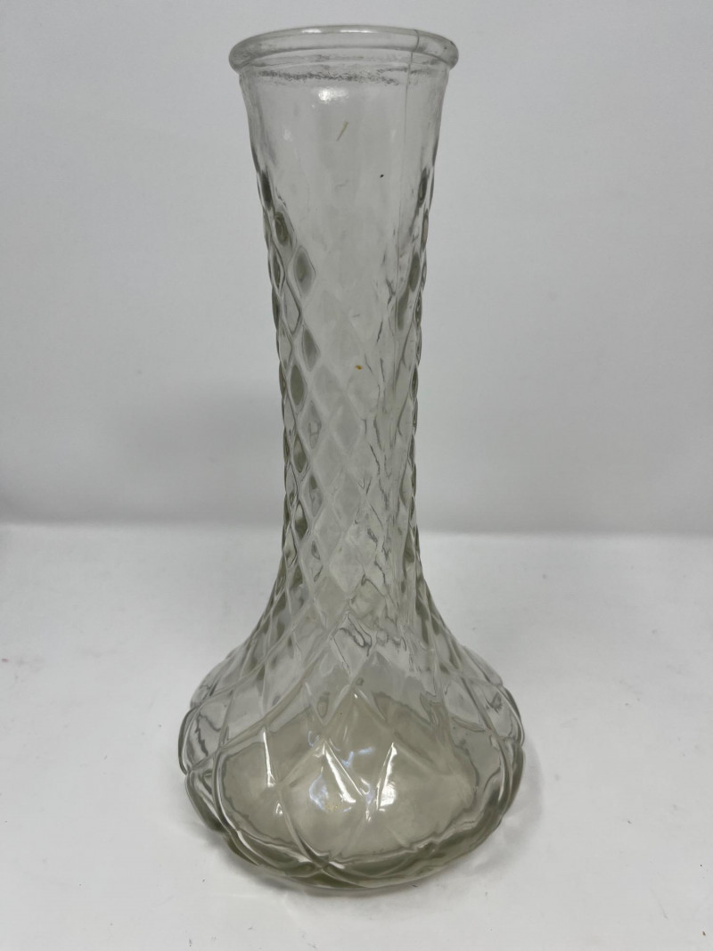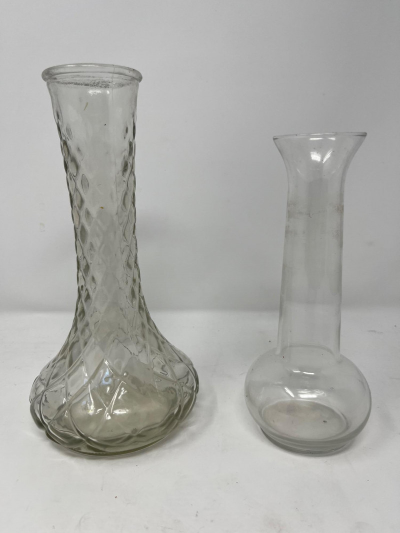 Lot of 2 small vases. Vase on the left has underside markings that say "Hossier Glass" as well as the numbers "4095" and "15". The smaller of the two is unbranded or dated in any way.