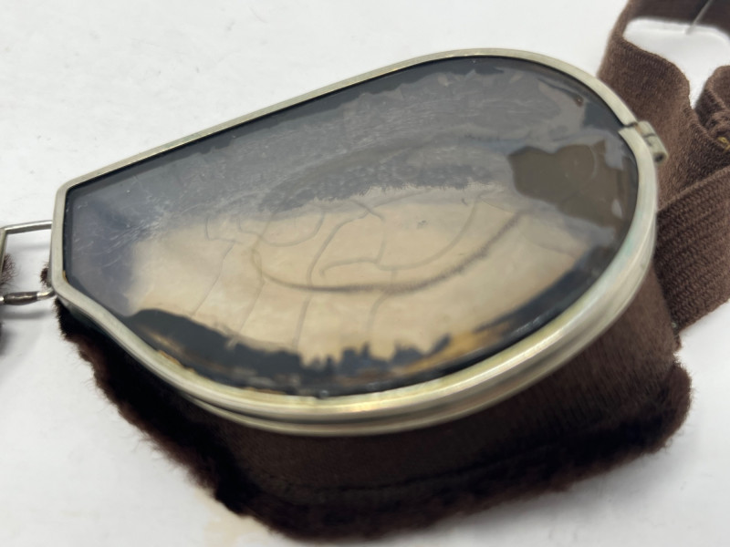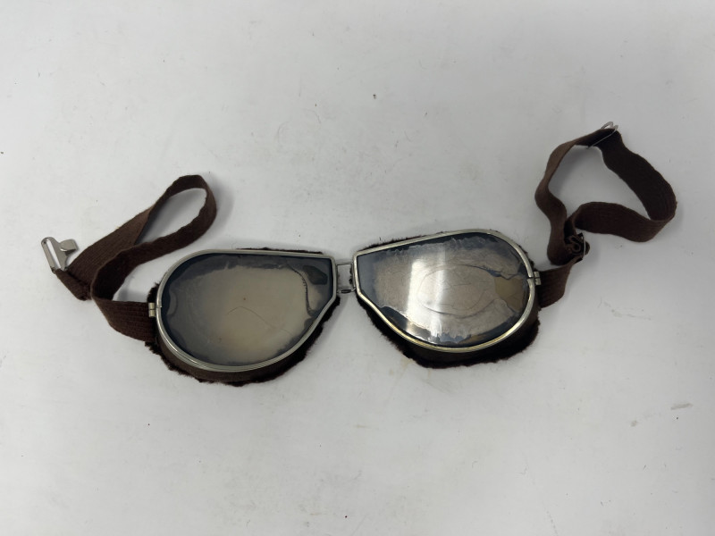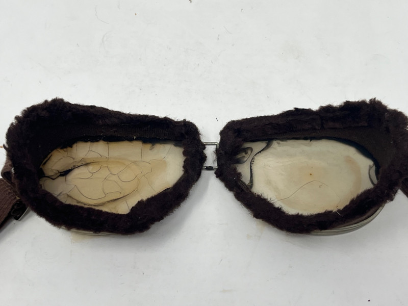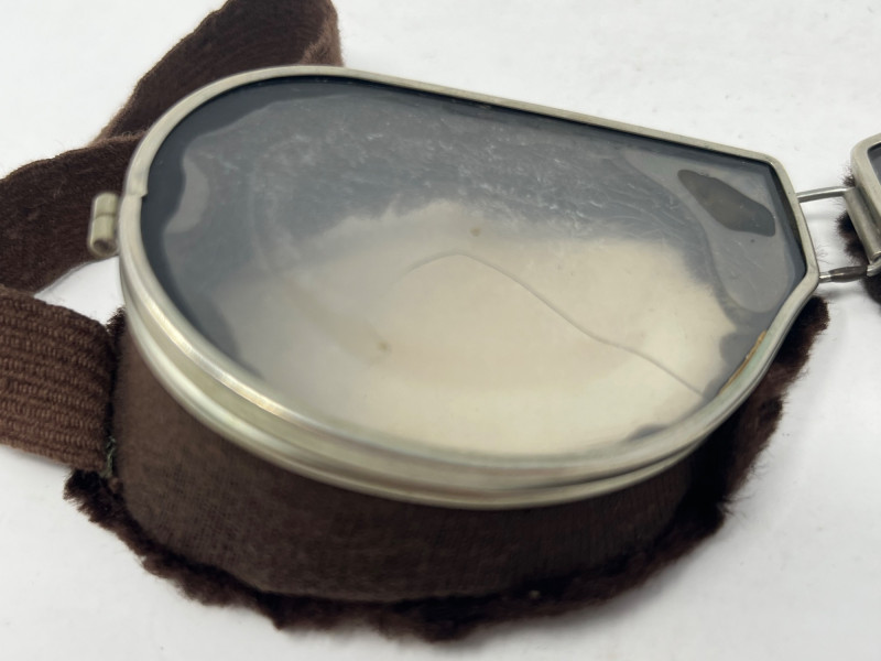 Vintage goggles used by pilots circa 1920s-30s. A rare piece of history, these were the goggles worn by aviators of Germany around the era of WWII. The securing hook is damaged, but can easily be repaired. The lens have damage and discoloration, making them unsuitable to take the the skies again.