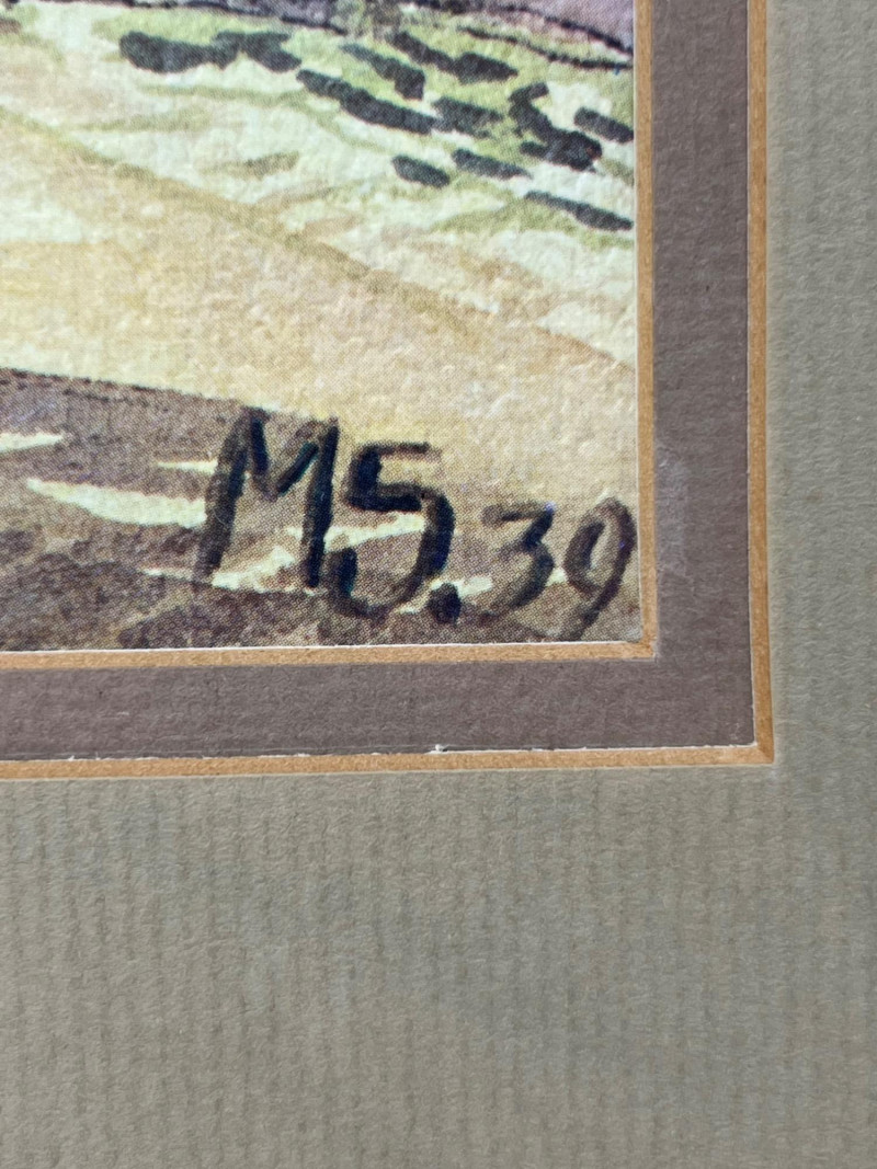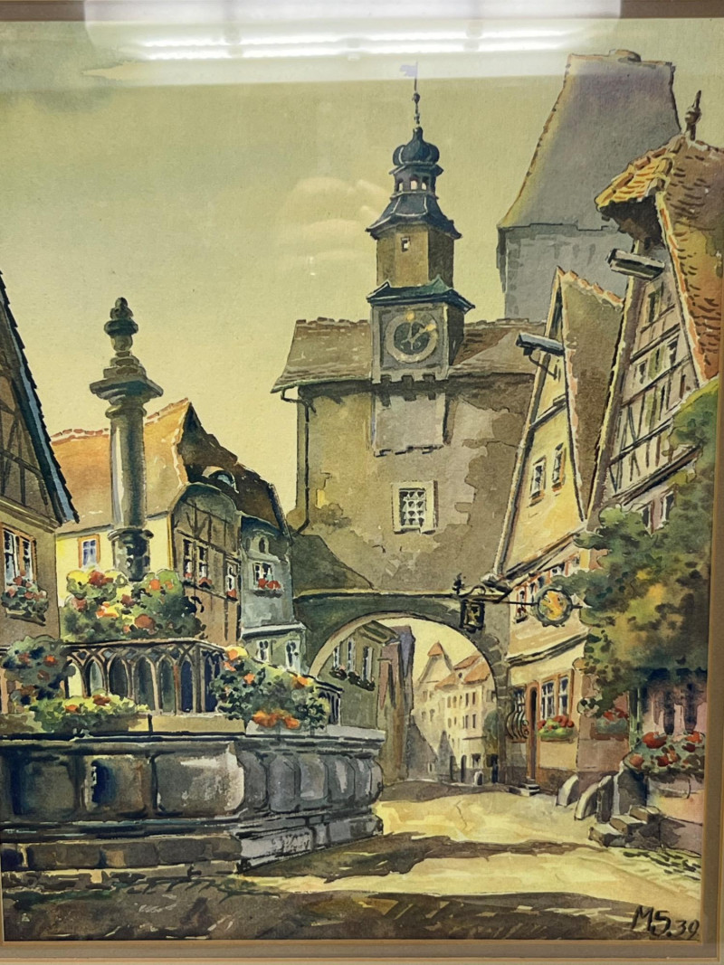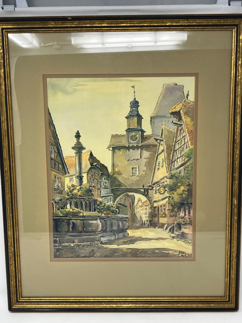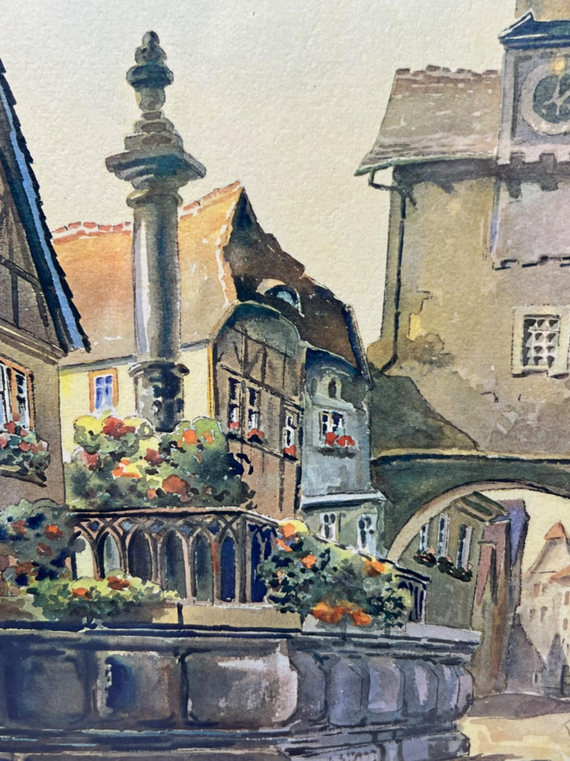 Watercolor print of Plonlein Square located in Rothenberg ob der Tauber in Germany. Signed M 5.39 in the lower right corner, the artist is unknown. Details come alive in with a blend of muted browns and structuring lines, giving a dreamy storybook-like aesthetic. This piece is not to be missed by any watercolor lover or world traveler.