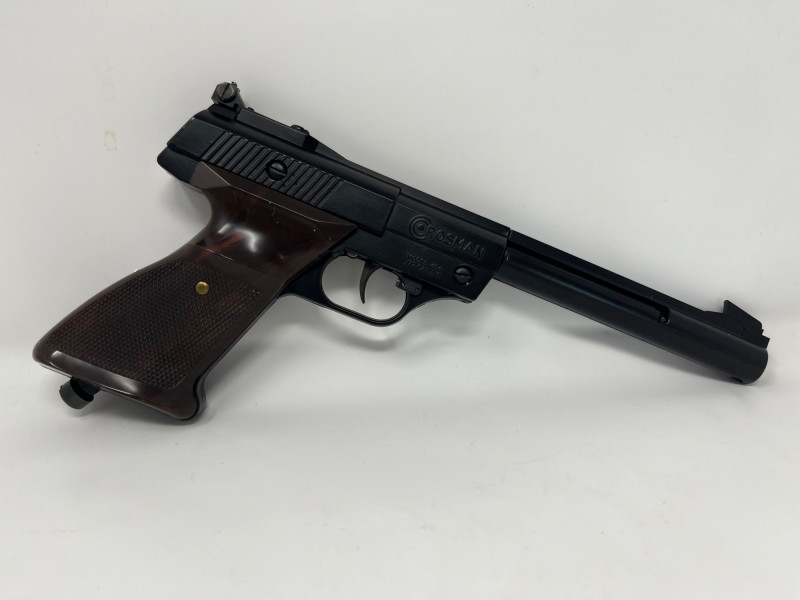 Vintage Crosman 16 shot Semi-auto .177 caliber CO2 powered BB pistol. Weighs 1 lb 14oz with an 11” length. Ambidexterous contouring of the grip for both left and right handed shooting. Includes the original box and manuals.