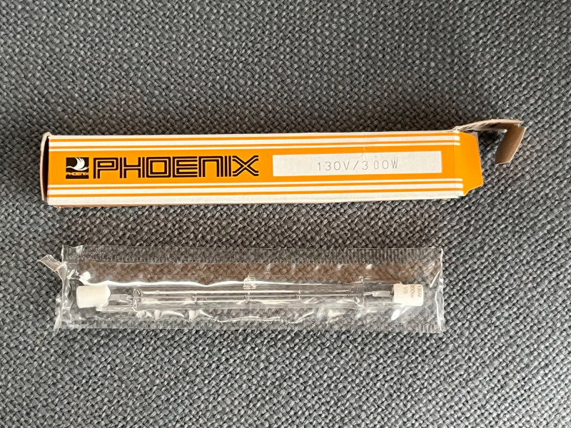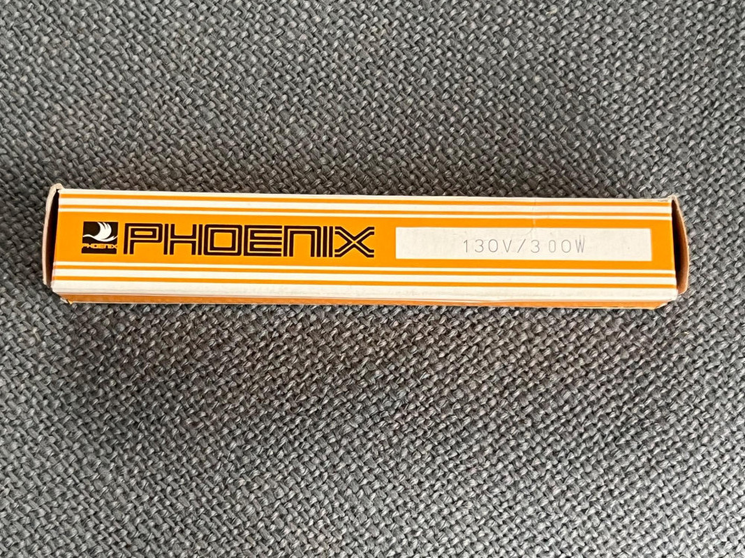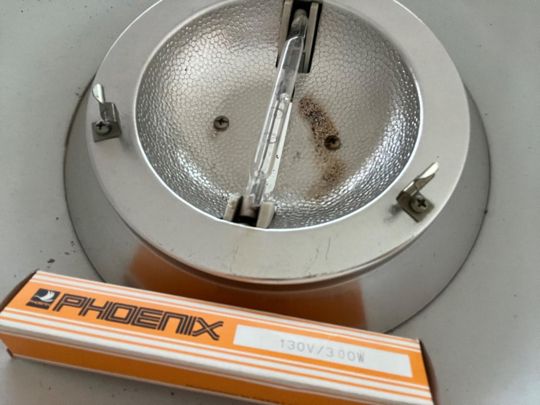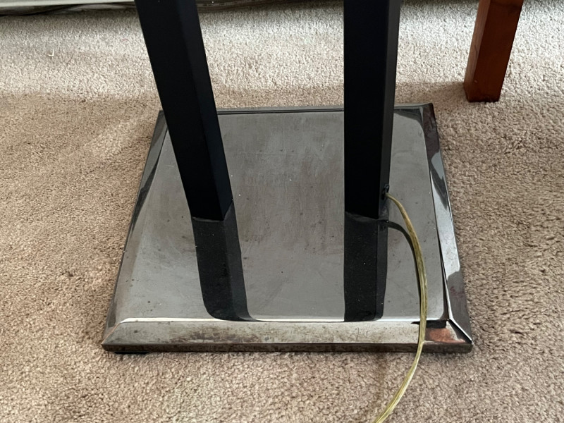 Vintage floor lamp with a dimmer peddle on the electrical cord. Lightbulb is a 130V/300W T 3 double-ended halogen lamp. Unopened lightbulb from UK brand Phoenix included in this lot. Great post modern design for any modern or vintage style that needs to lighten up bit.