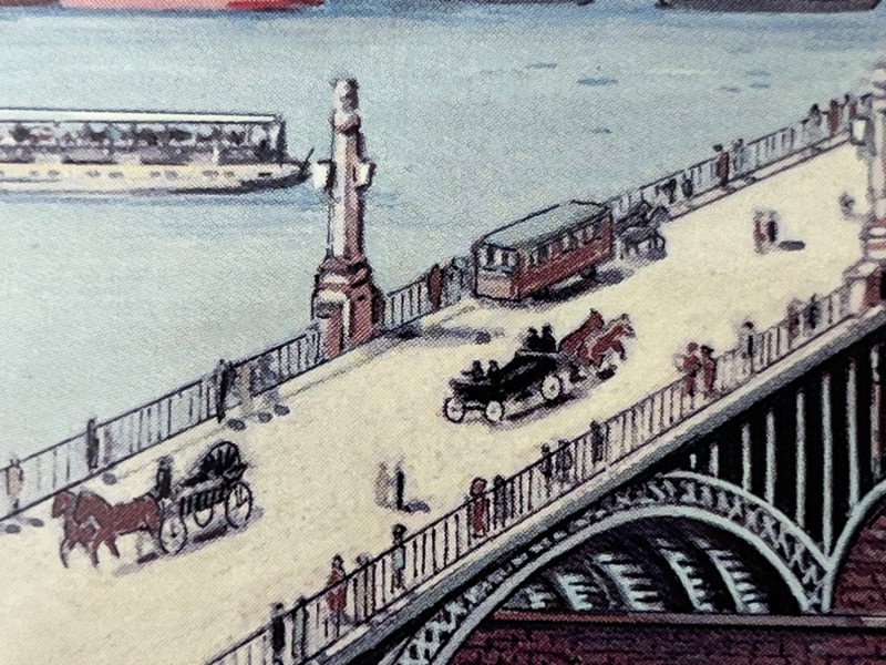 Vintage matted and framed print of a panoramic water scene overlooking Mainz, Germany. Unsigned and undated, this piece is estimated to depict a scene of Mainz Germany in the late 1800s. Several ships and a castle feature prominently in the landscape. Framed by Cascade Frames in Seattle, this piece is incredibly well preserved. A handwritten sticker is on the back with the following writing: "Mainz Panorama n.d. varr. v. prilo 1890 View from Castle on Mainz Left with City Hall (translated from German) Mainzer gut stubb"