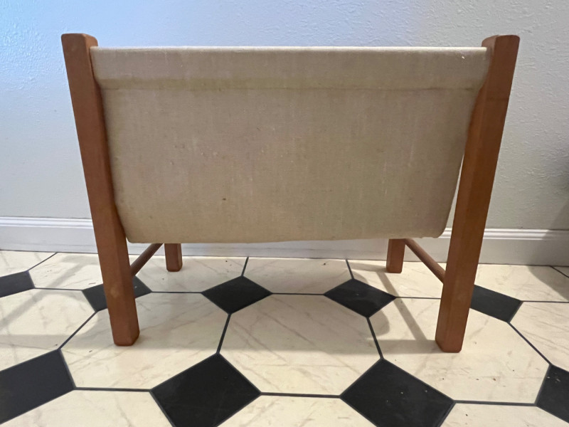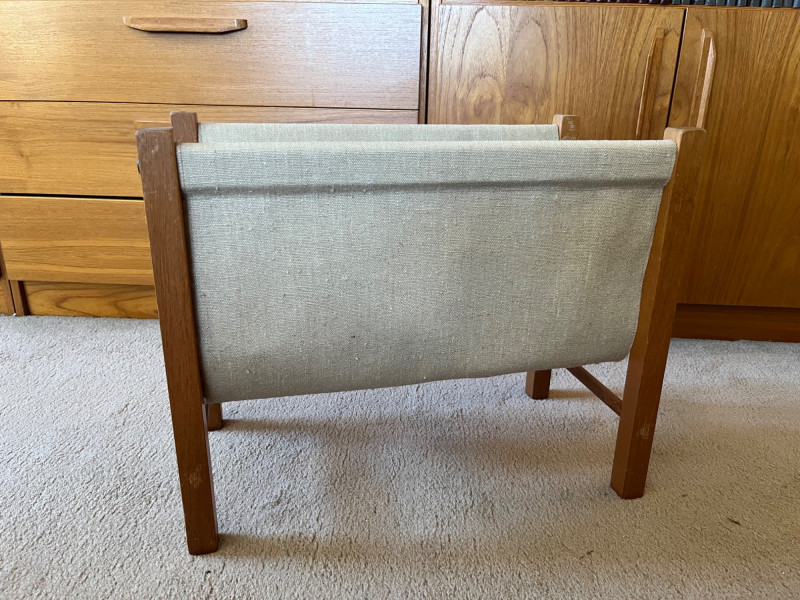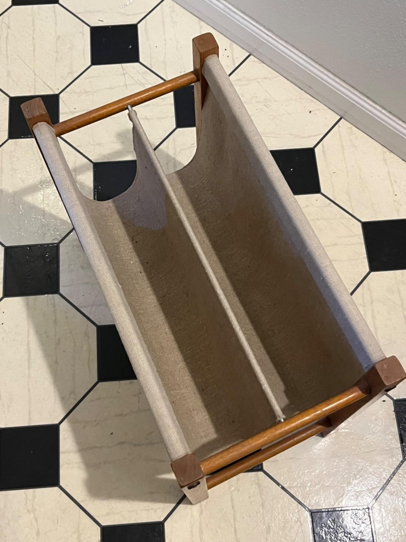 Vintage mid century modern magazine rack. Sturdy wood frame with fabric lining. The fabric is not synthetic, is believed to be wool. Great condition with no tears in the fabric or cracks in the wood- light wear on the surface.