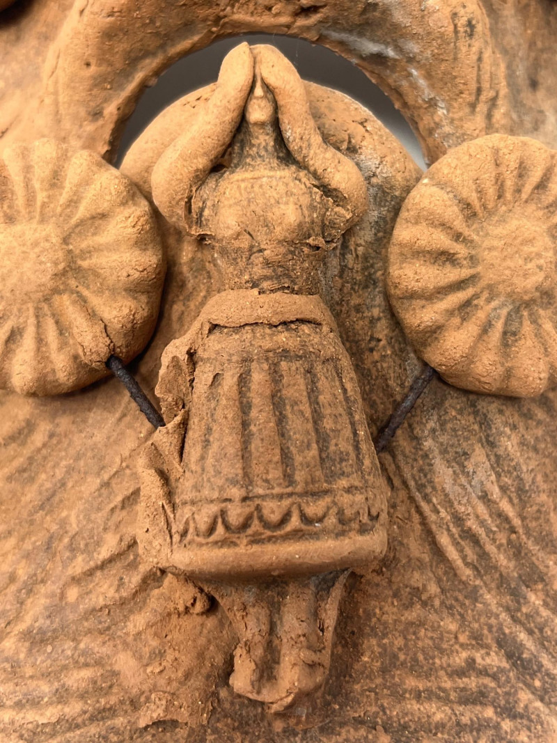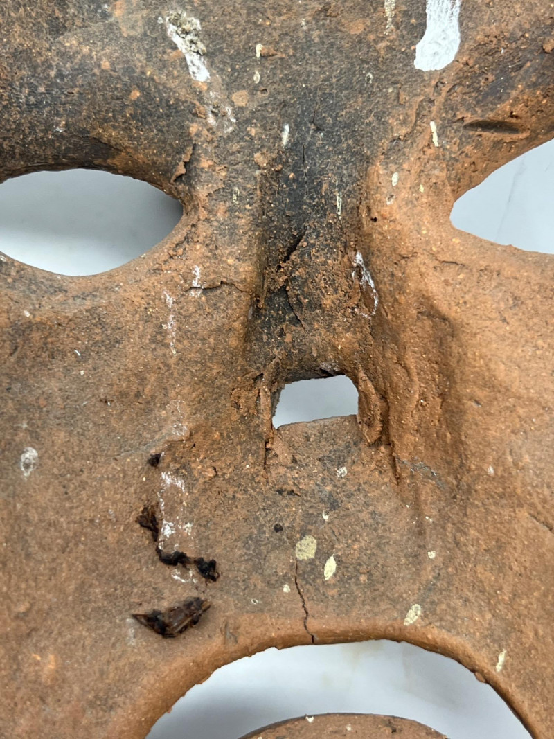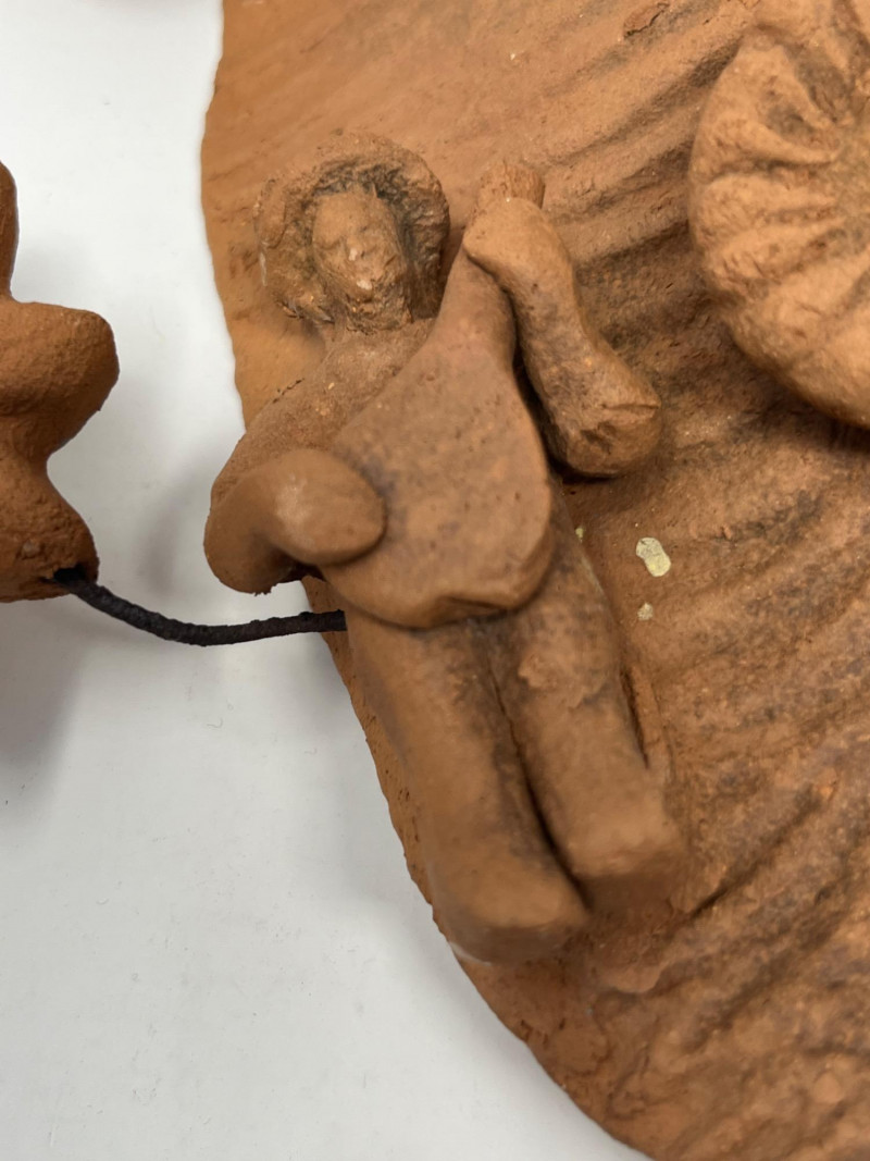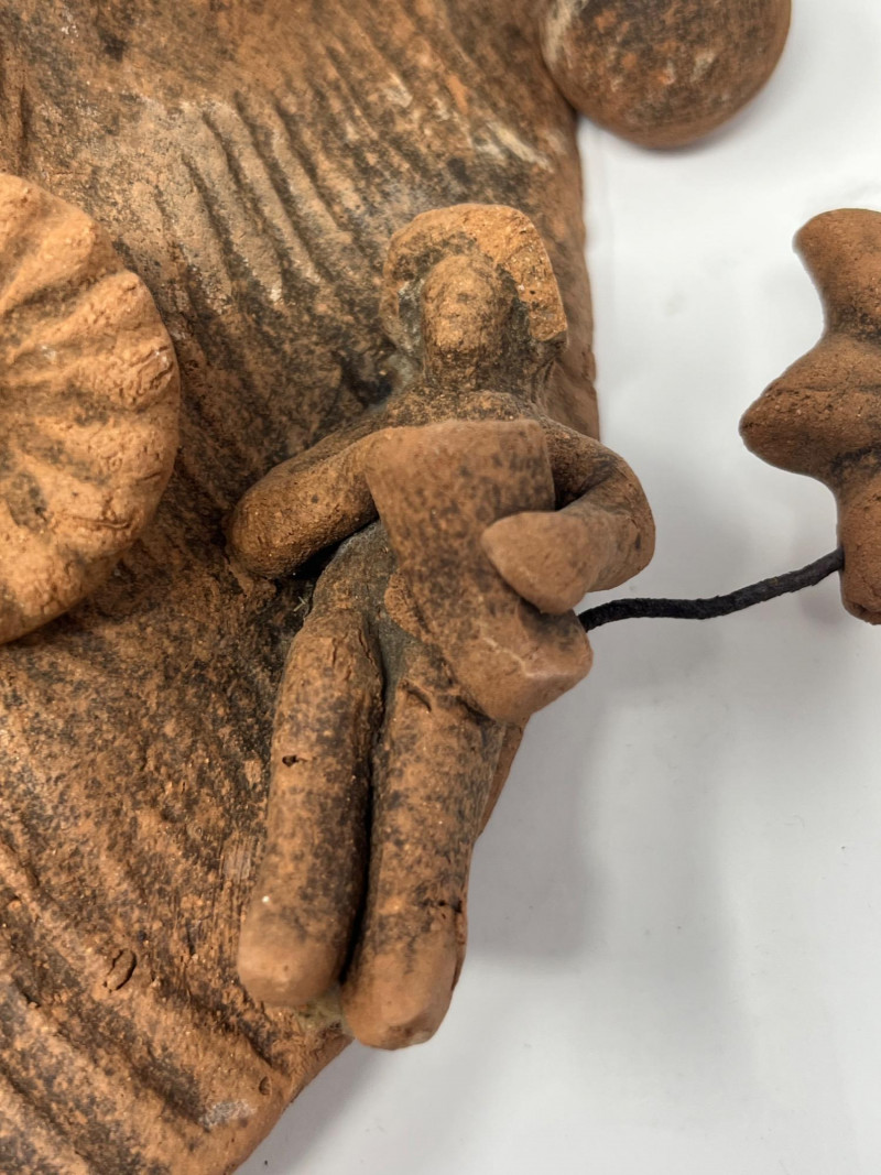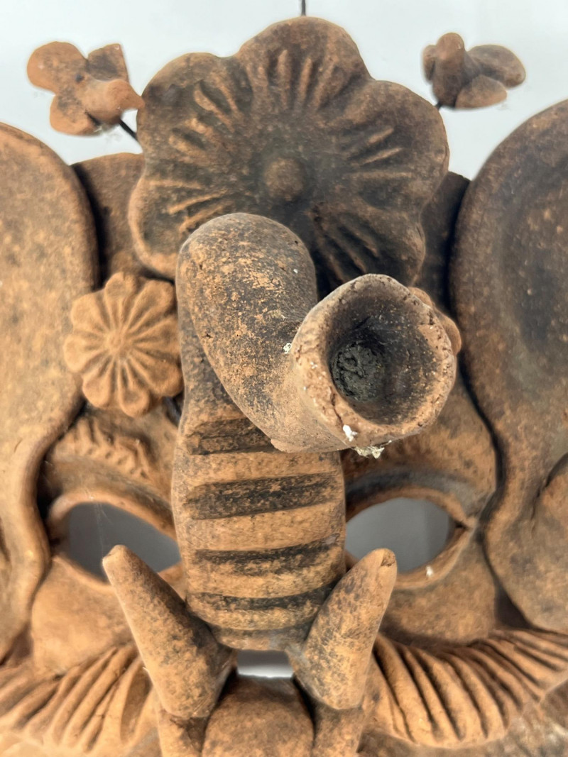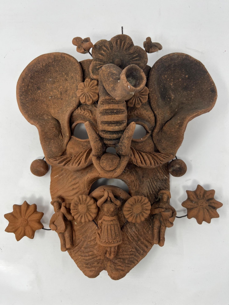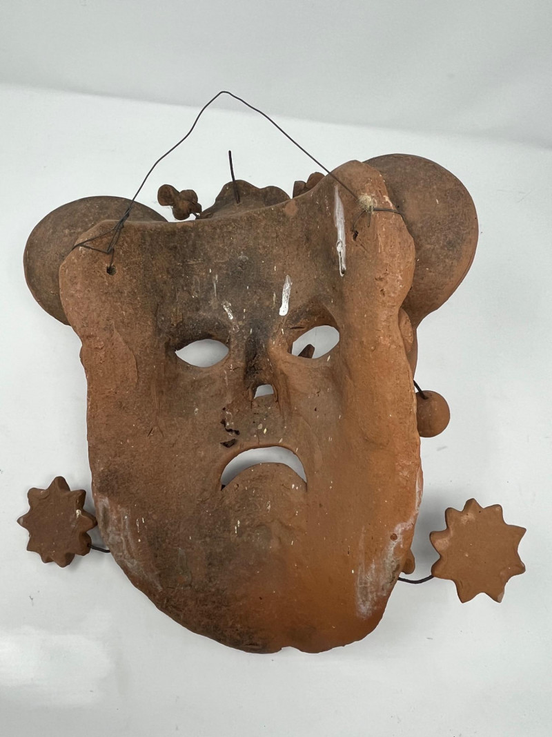A rather thick and sturdy clay face mask. Handmade with Asian themes. Unbranded or signed by the artist. Small cracks around the nose area backside, but no compromise to the integrity. A great piece for eccentric decoration.