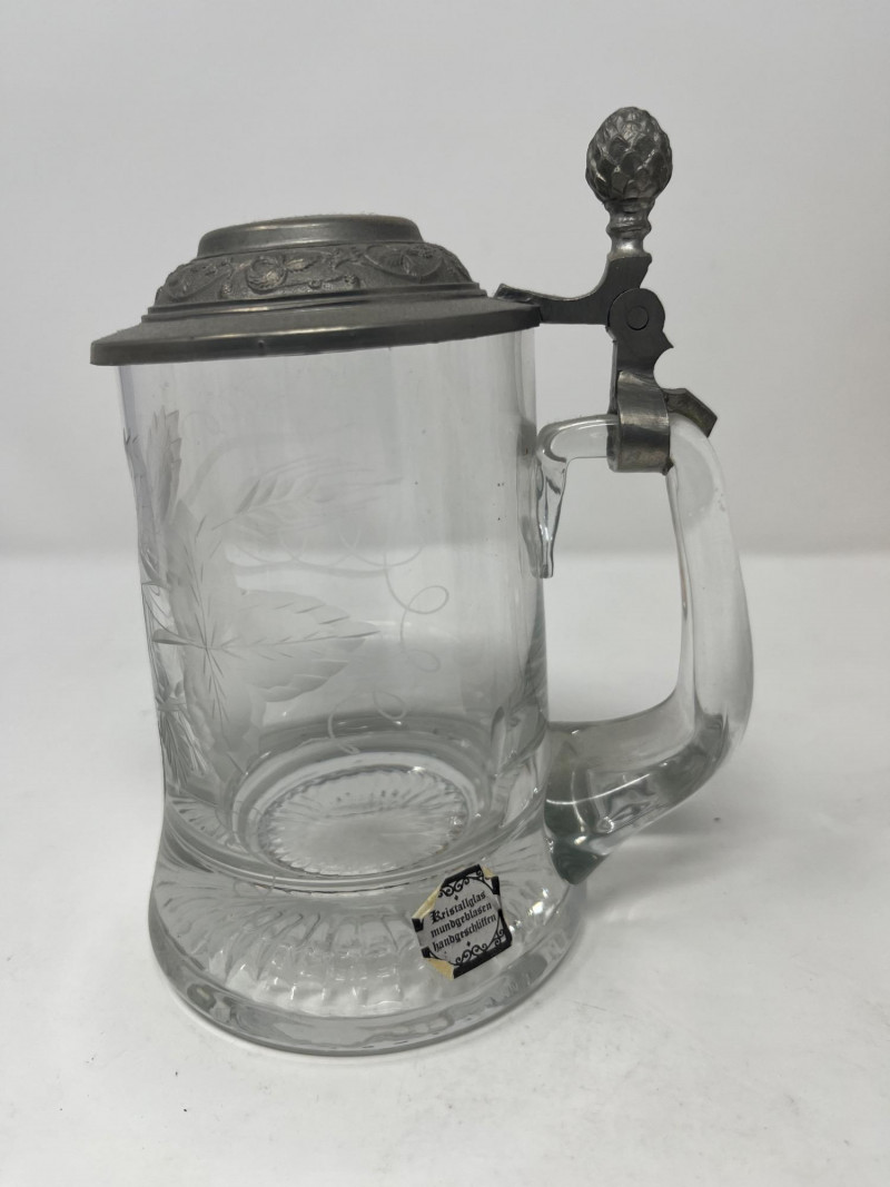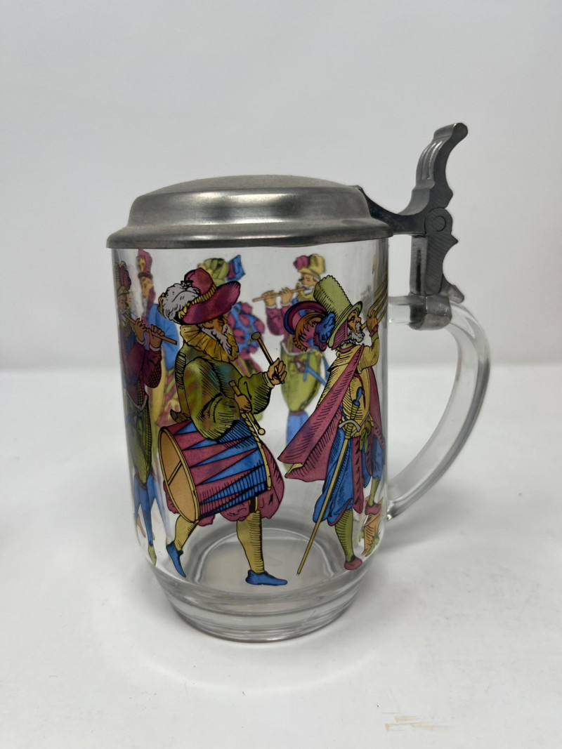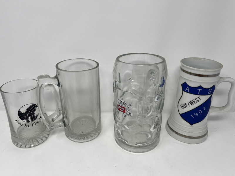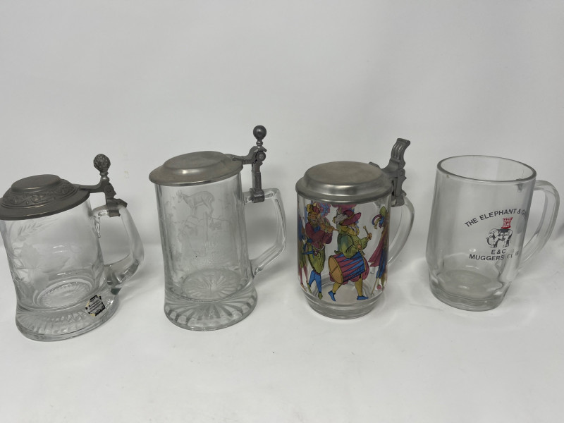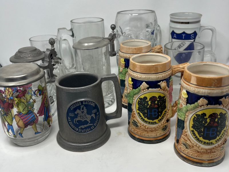 Bulk lot of misc. beer steins. Some have lids and some are not lidded. Made from glass, metal, and ceramic. Includes 3 matching steins in the lot.