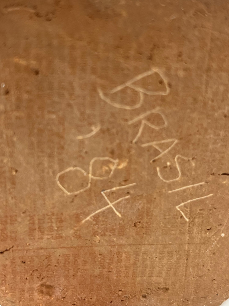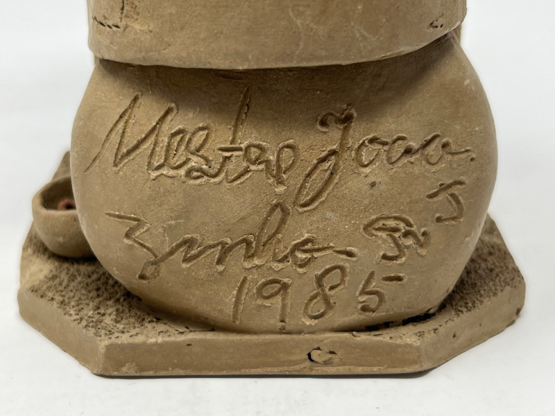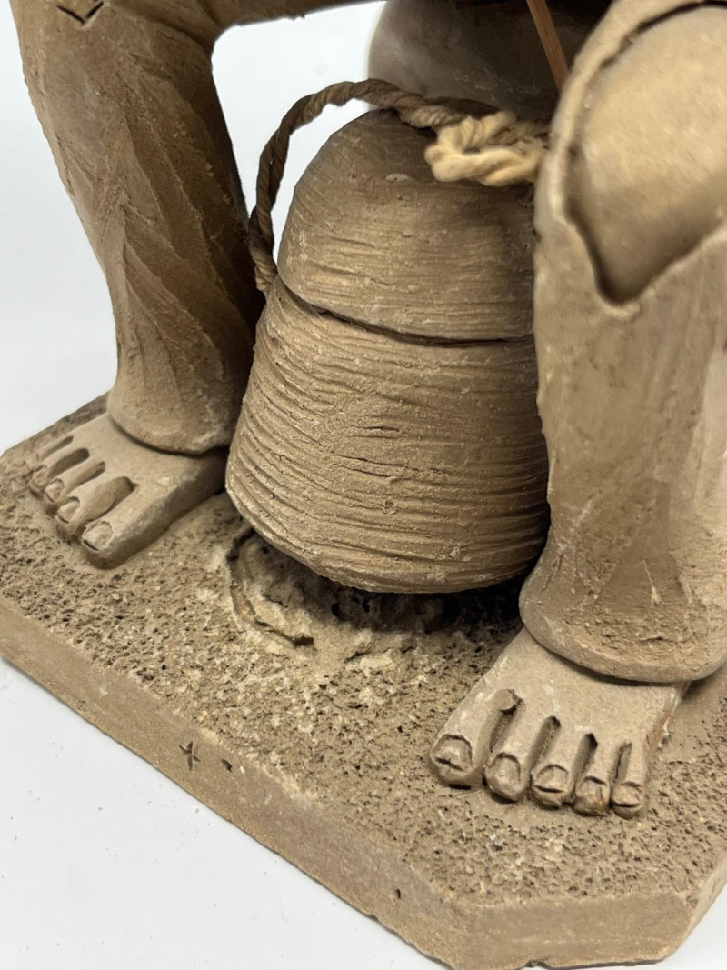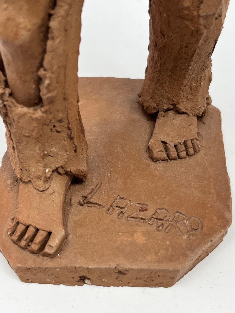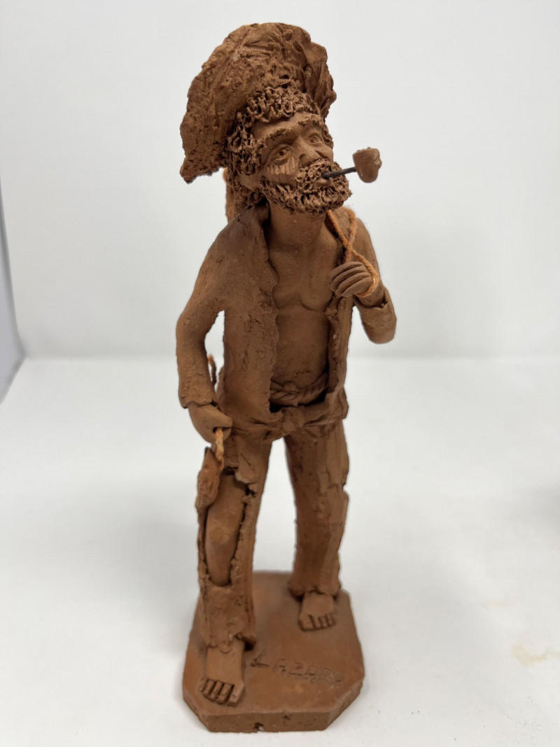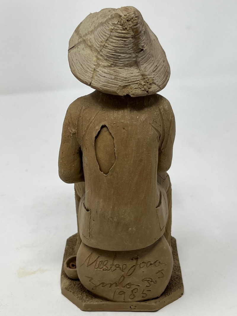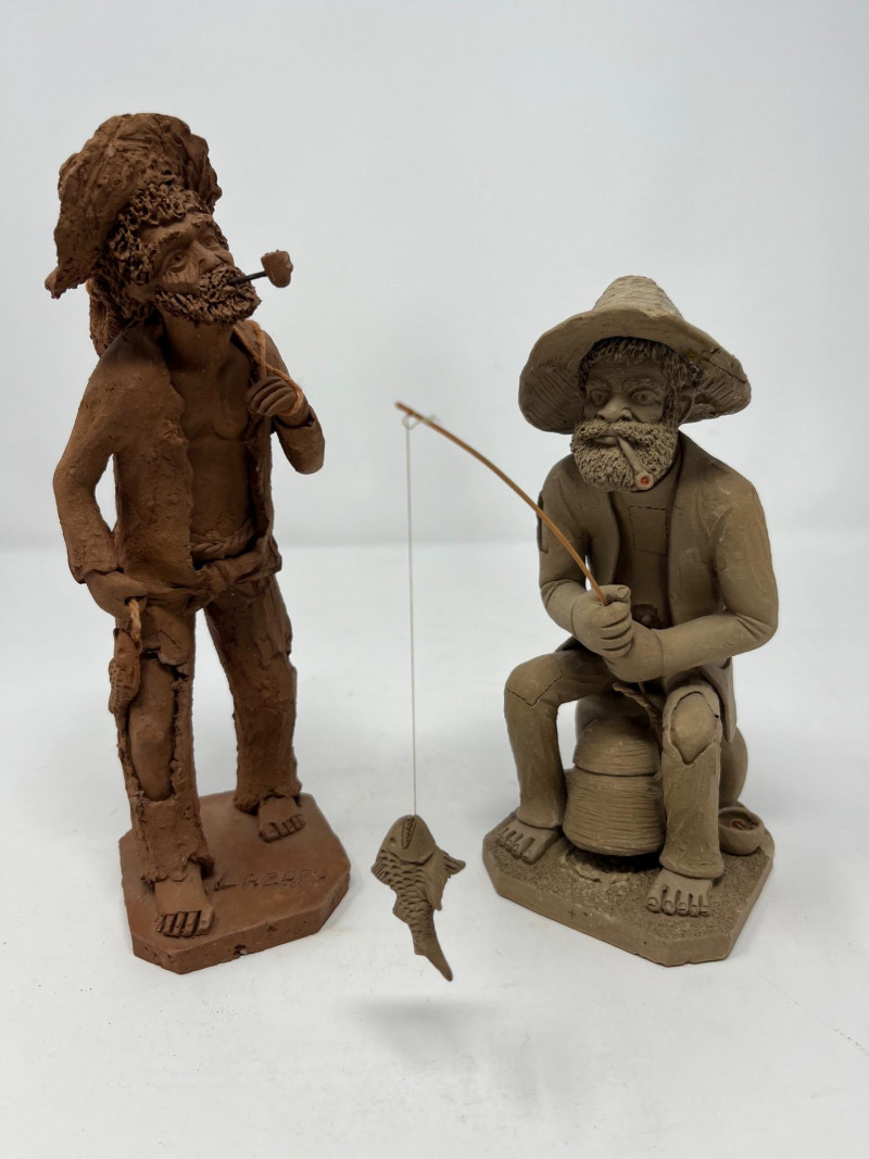 Lot of 2 clay sculptures of fishermen. Standing man hasname Lazaro written on the base & Brasil '84 written on underside. Sitting fisherman has a signature and the year 1985 written on the back of his seat. Sitting fishermans hat is broken as well as the jar at his feet- sold as-is.
