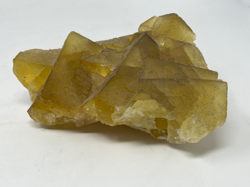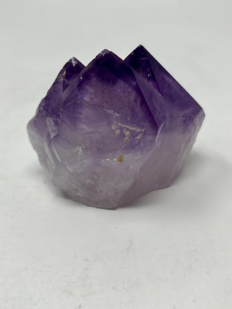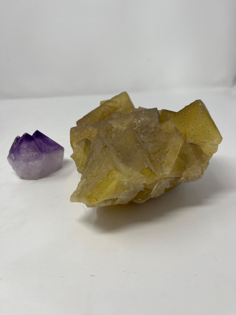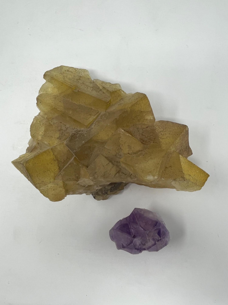 Lot of 2 crystals: - Medium-sized purple amethyst. (Approx measurements 3”x3”x2”) - Large-sized yellow fluorite. (Approx measurements 8.5”x6.5”x3.5”)