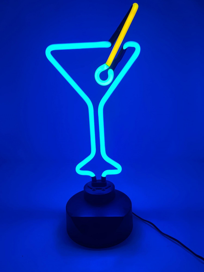 Martini Neon Lamp. Electric plug-in lamp with a button on the back of the base to turn on and off. Great for any home bar or barcart to add a swanky nightlife vibe. Lightweight with a cord that is approx. 60" long.