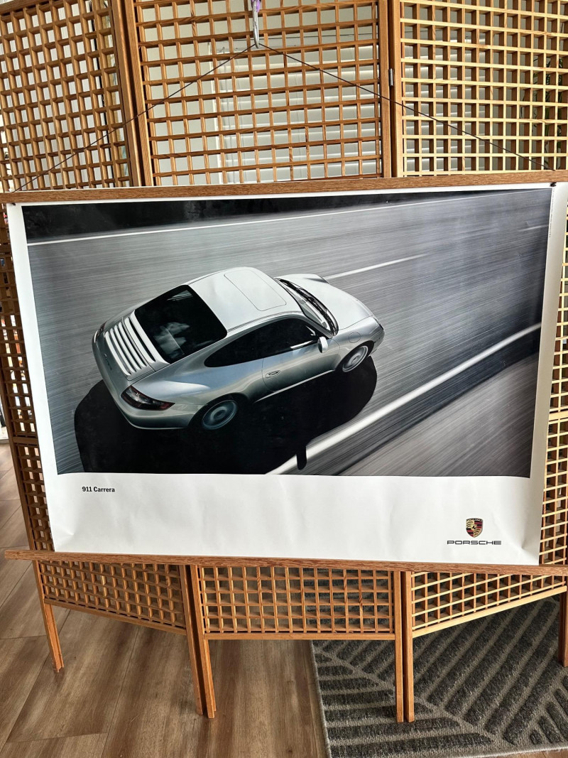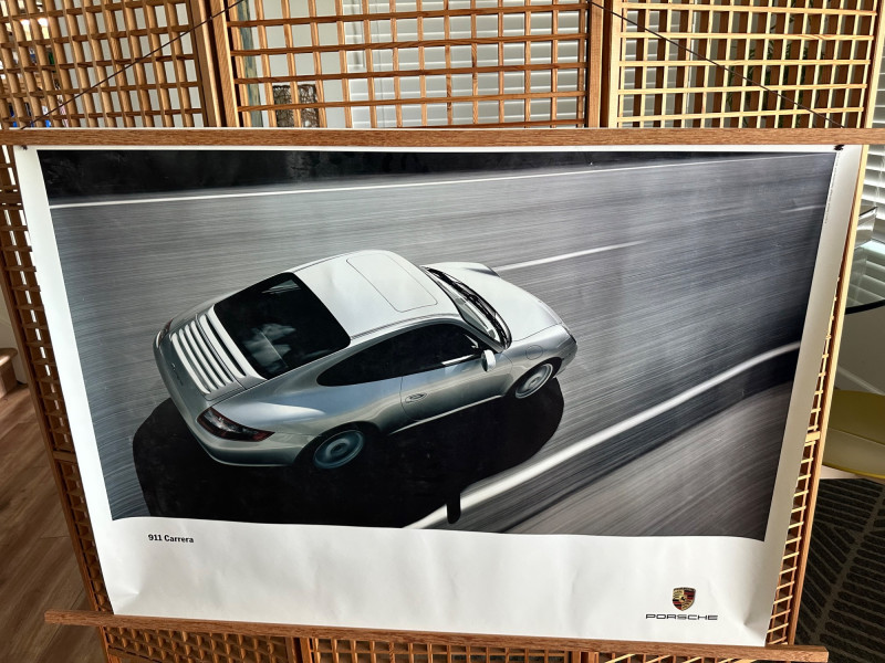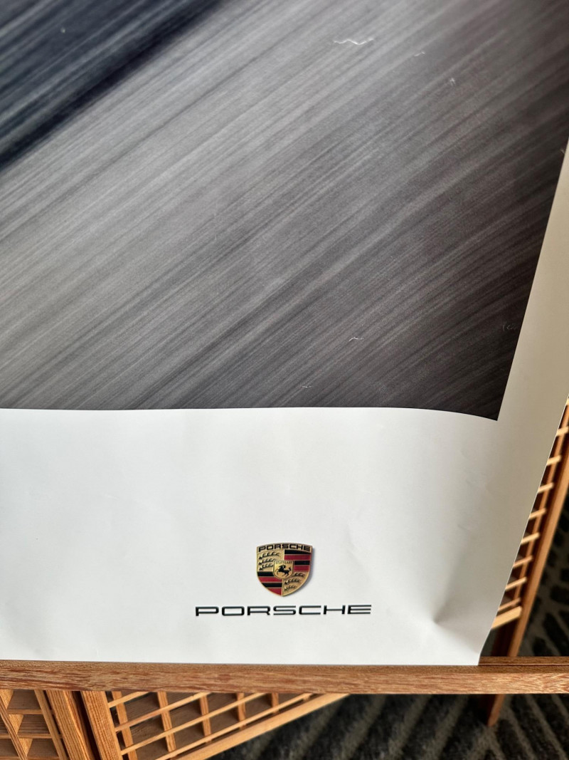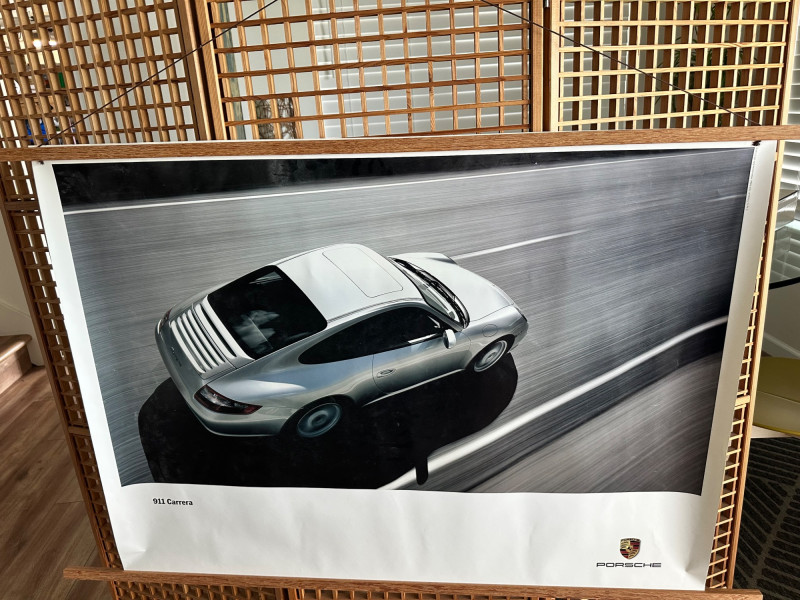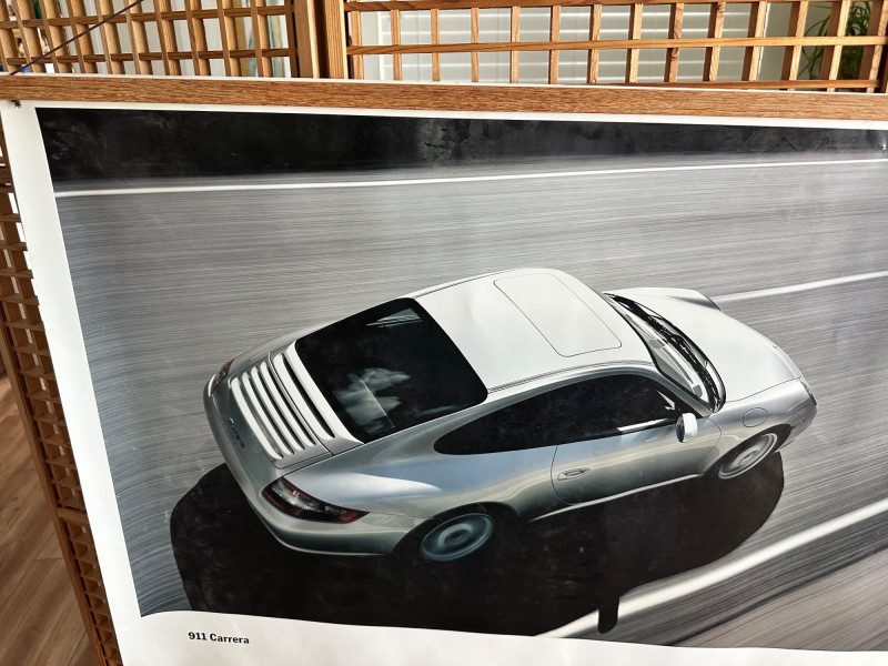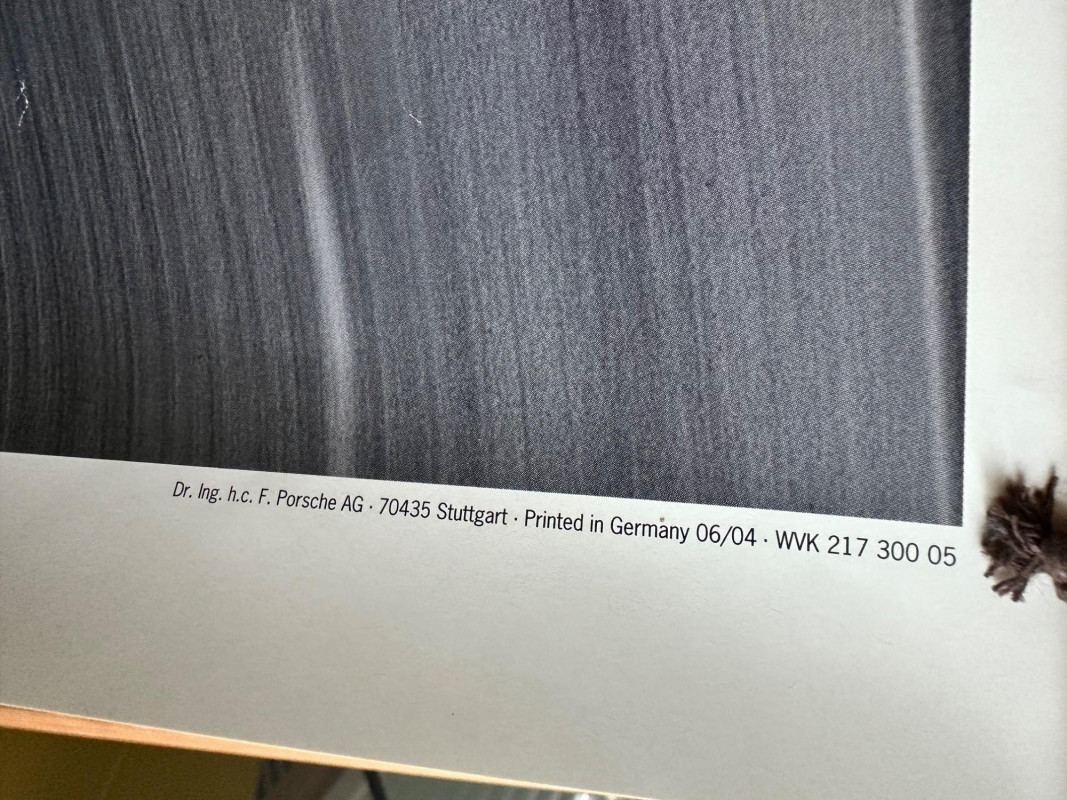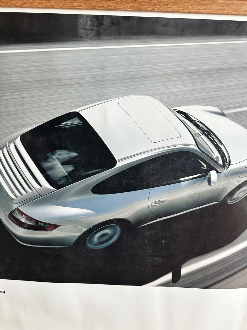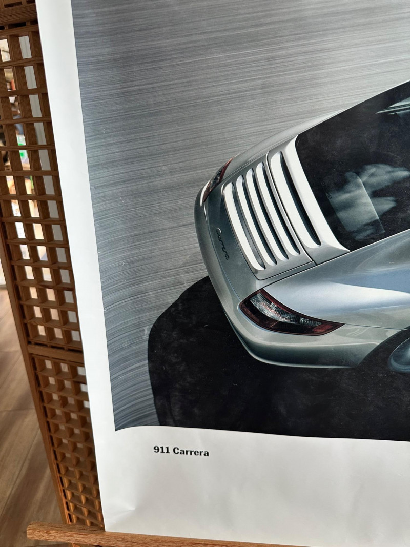 Porsche 911 Carrera Advertising Poster Dimensions: Approx. 24" x 36" A silver Porsche 911 Carrera blazes down a highway in this official promotional poster, captured from an elevated angle that highlights its aerodynamic silhouette and signature rear-engine stance. The motion-blurred backdrop amplifies the sense of velocity, while the Carrera’s sleek contours take center stage. Printed in Germany by Dr. Ing. h.c. F. Porsche AG, Stuttgart (06/04, WVK 217 300 05), this piece is a genuine factory-issued tribute to one of the brand’s most enduring icons. The lower edge features the “911 Carrera” model designation on the left and the Porsche crest with “PORSCHE” on the right—making it unmistakably authentic and unapologetically fast.