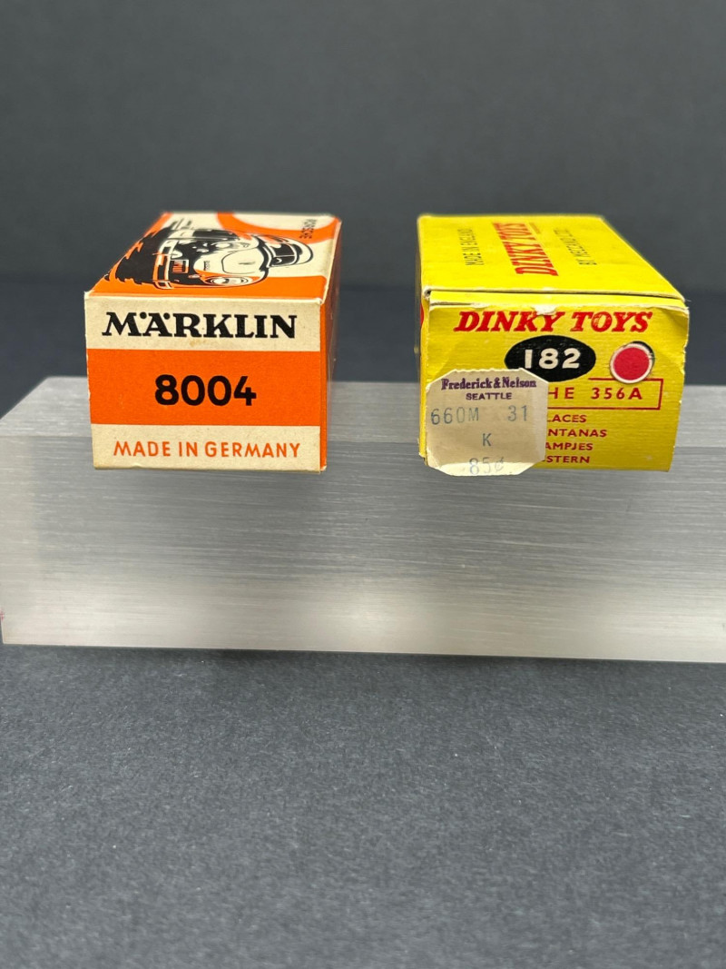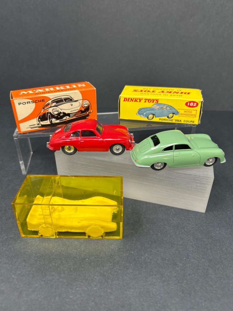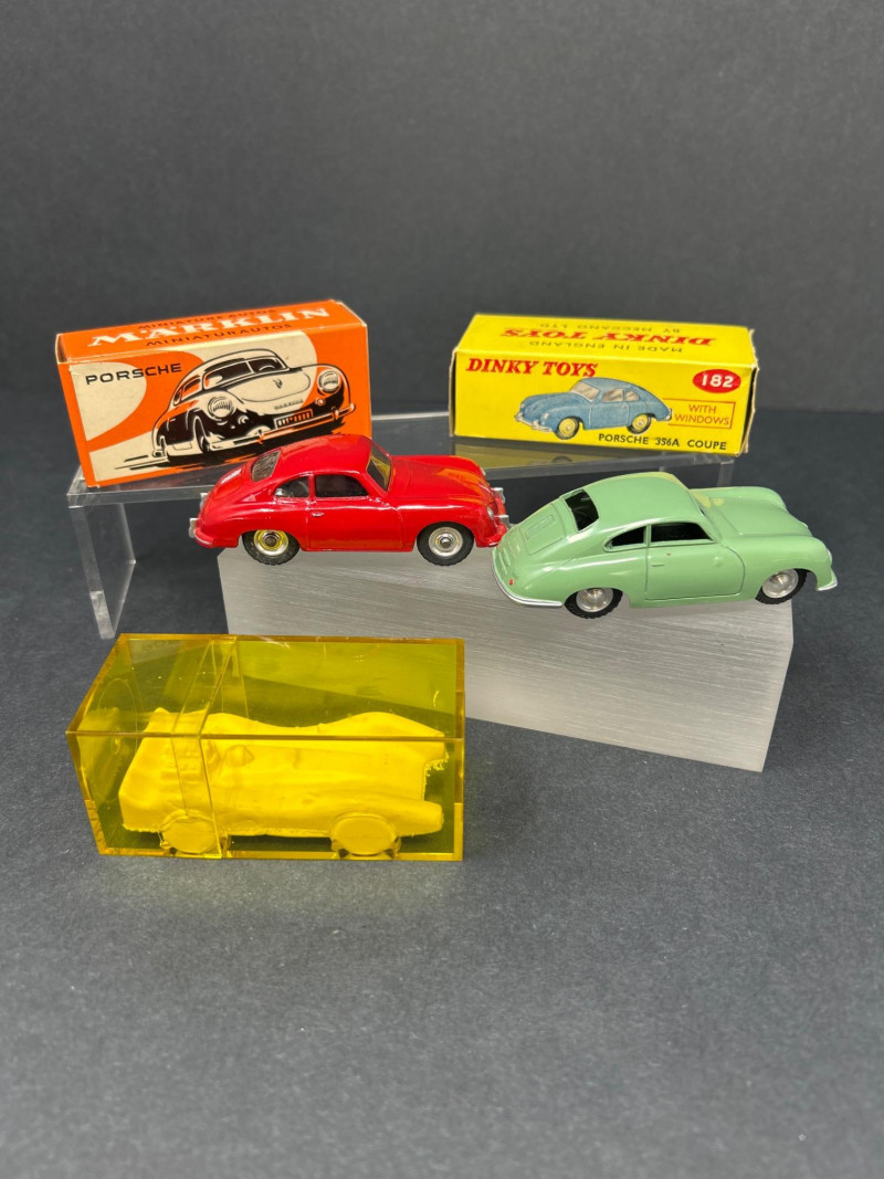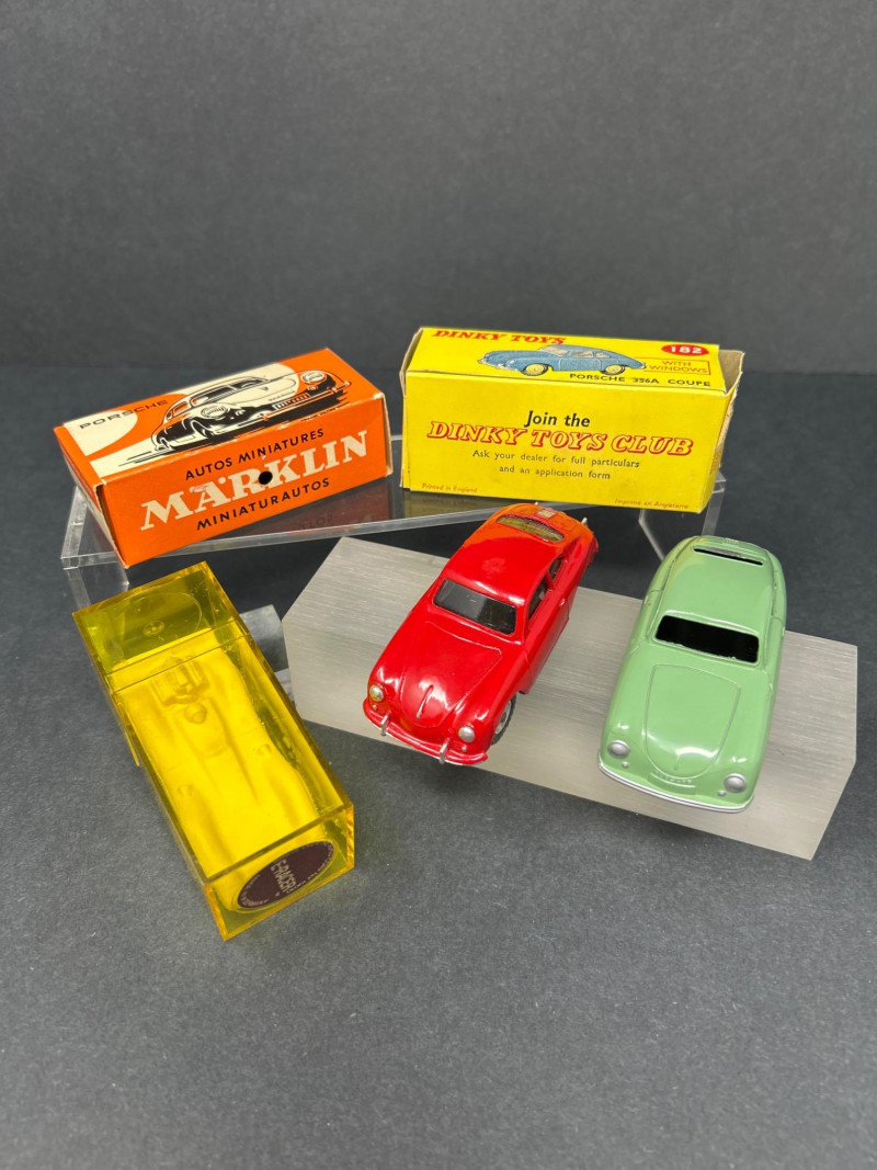 Märklin • Dinky Toys • Plexi-Case Novelty A playful trio of mid-century Porsche collectibles, blending precision casting with nostalgic charm: Märklin Red Porsche 8004 – Made in Germany, this die-cast model boasts crisp detailing and classic Märklin weight. A standout for European toy collectors. Dinky Toys Green Porsche 356A (No. 182) – Produced in England, this mint green coupe captures the sleek silhouette of Porsche’s early post-war icon. Includes original illustrated box. Vintage Porsche Eraser in Yellow Plexi Case – A novelty piece with retro flair, molded in rubber and housed in a transparent display shell. From showroom replicas to desk-side whimsy, this lot offers a cross-section of Porsche’s miniature legacy—ideal for die-cast devotees and vintage curators alike.