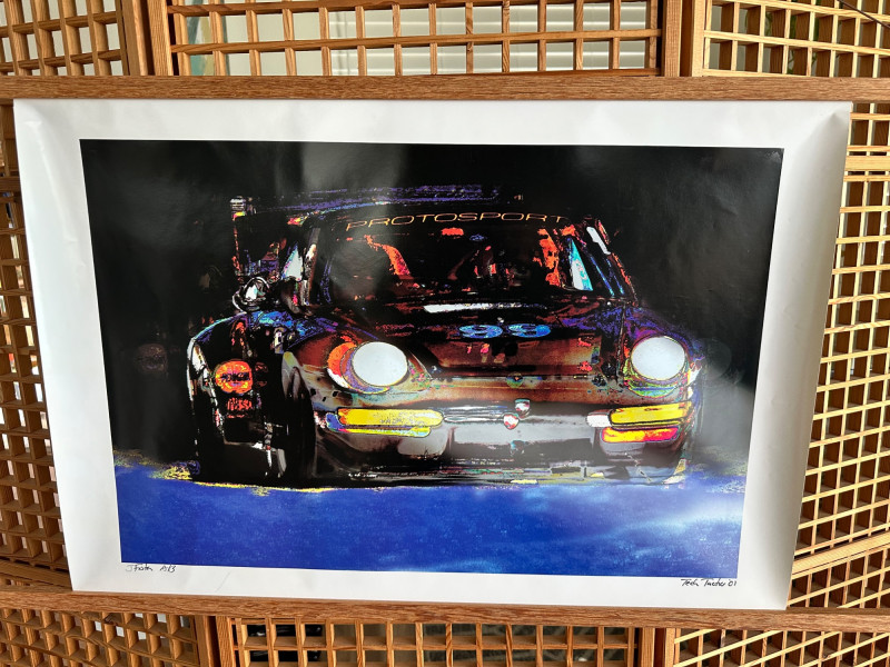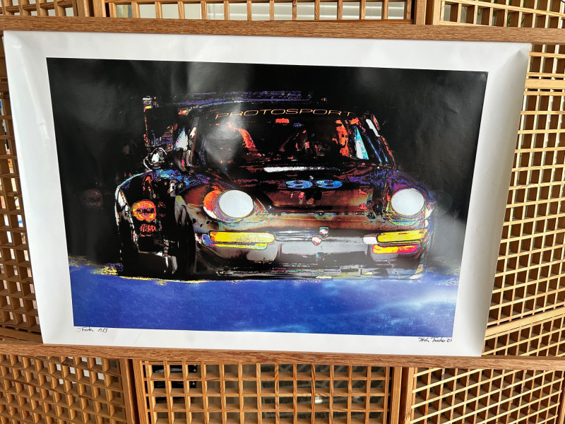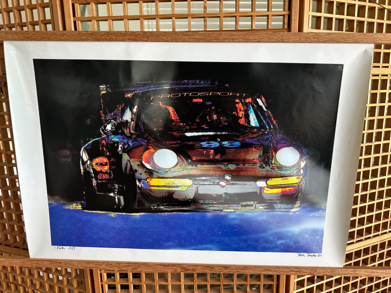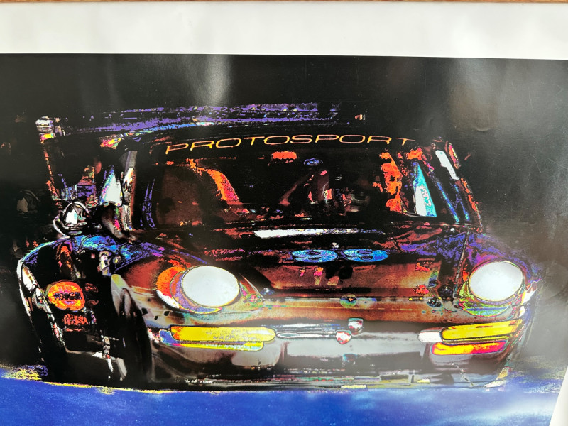 A poster featuring the 993 GT2 in full racing stance, front-facing with “PROTOSPORT” windshield banner. Titled Tech Tactic 01 by artist J. Foster, this high-gloss print blends photography and digital enhancement to evoke the thrill of night racing. This poster would have been issued in conjunction with a Porsche Club of America event (Tech Tactics). Porsche 993 GT2 Artist: J. Foster Title: Tech Tactic 01