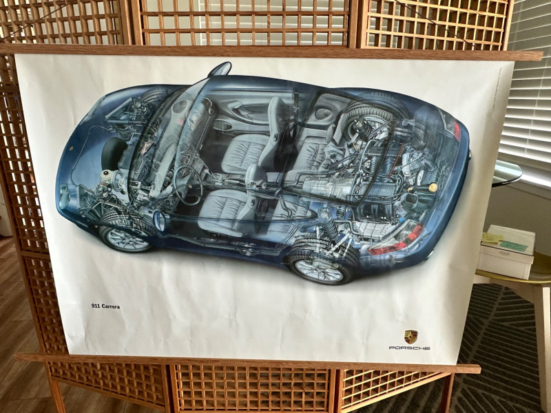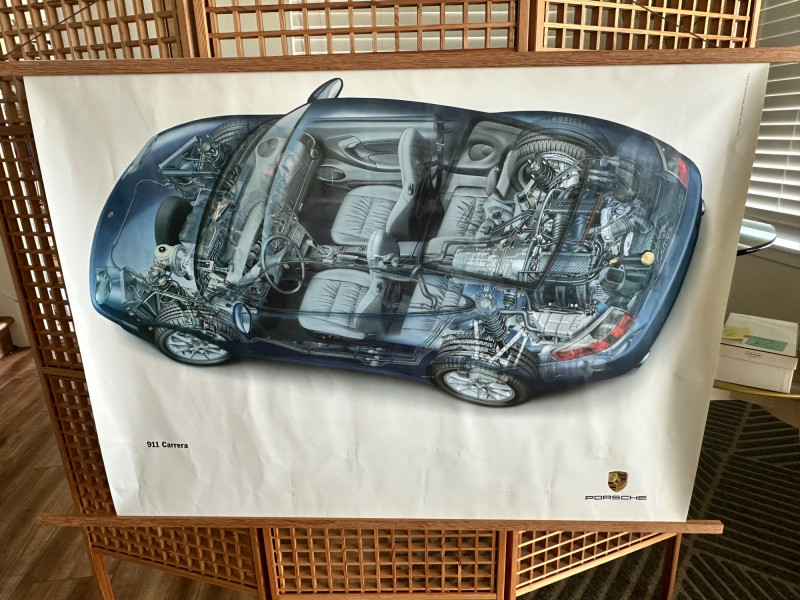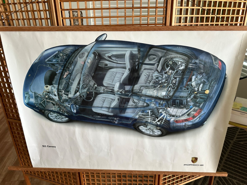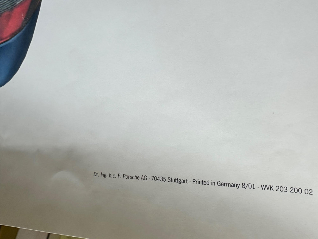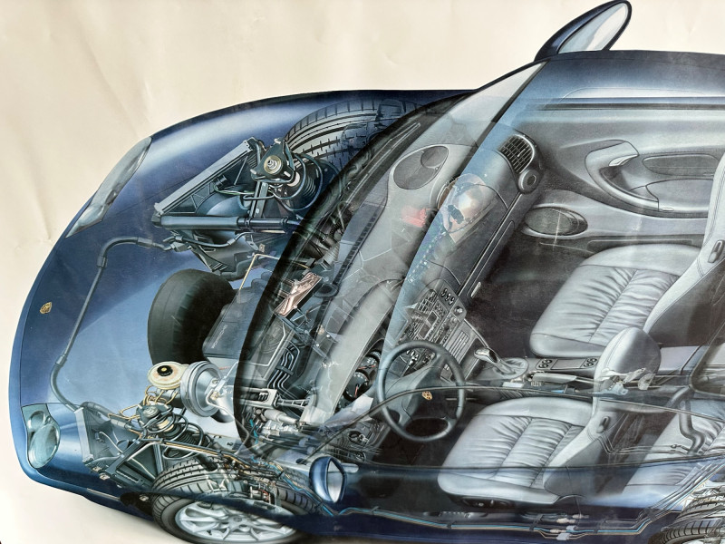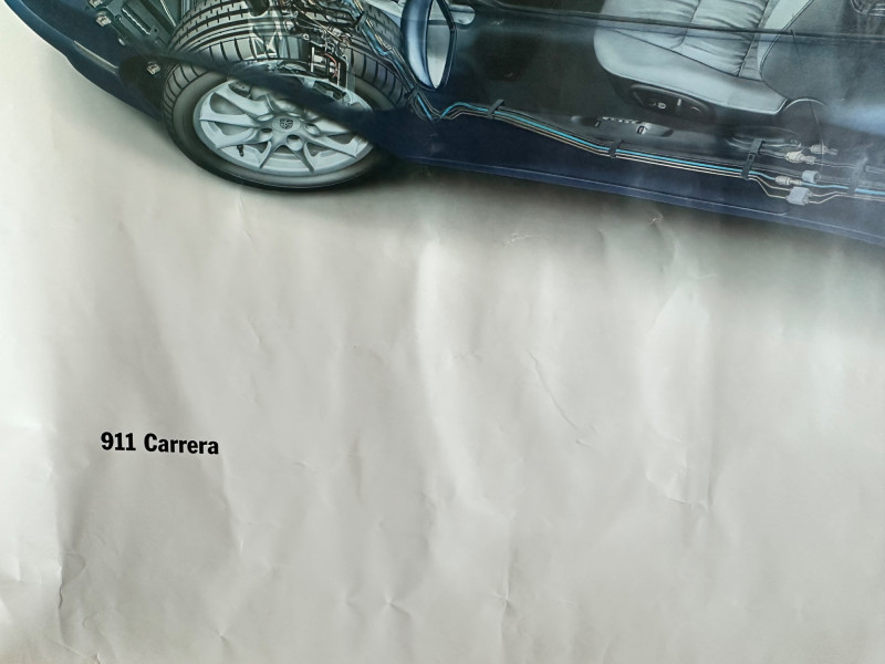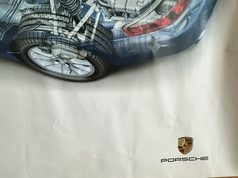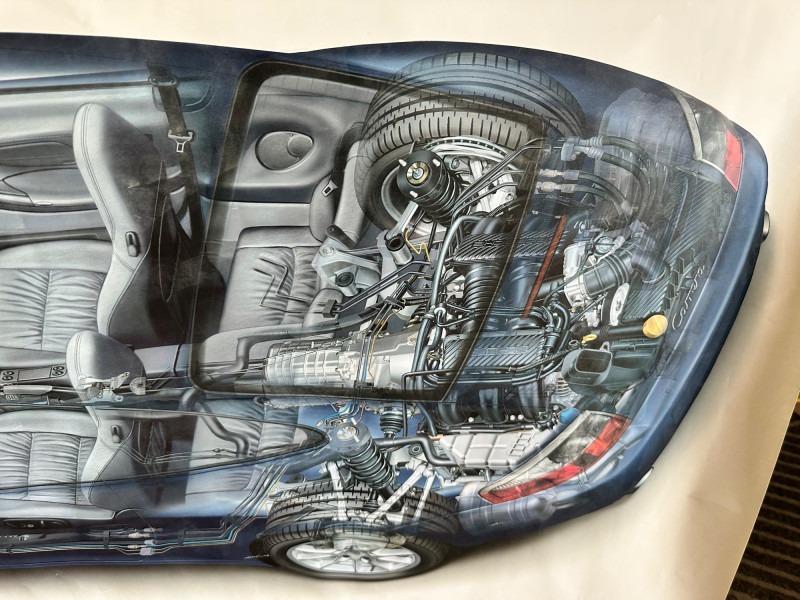 Factory-issued Porsche poster featuring a semi-transparent technical illustration of the 911 Carrera, revealing its internal engineering in stunning detail. From the rear-mounted engine and transmission to the suspension and seating layout, this cutaway design offers a rare glimpse into the mechanical artistry behind one of Porsche’s most iconic models. Printed in Germany by Dr. Ing. h.c. F. Porsche AG, Stuttgart (8/01), WVK 203 000 02. A must-have for collectors, engineers, and design enthusiasts. Collector Notes: Model: Porsche 911 Carrera Format: Technical cutaway illustration Print Code: WVK 203 000 02 Printed: August 2001, Stuttgart, Germany Dimensions: Approx. 30" W x 40" H Condition: Light wear consistent with archival display Features: Transparent overlay of mechanical systems, Porsche branding