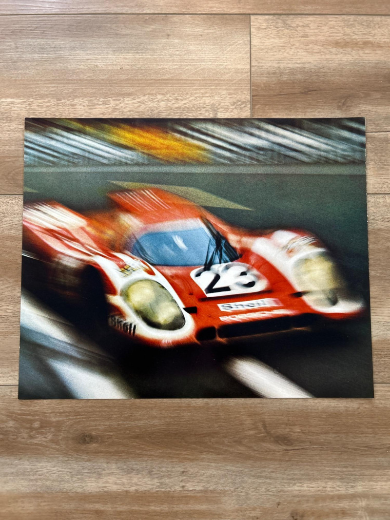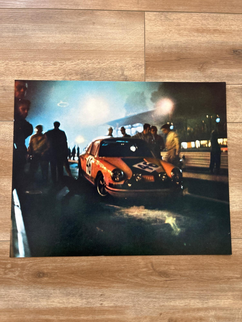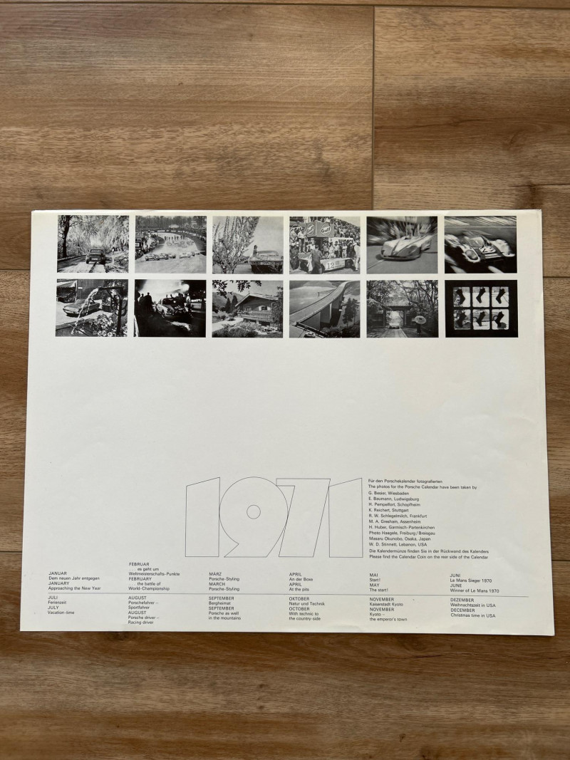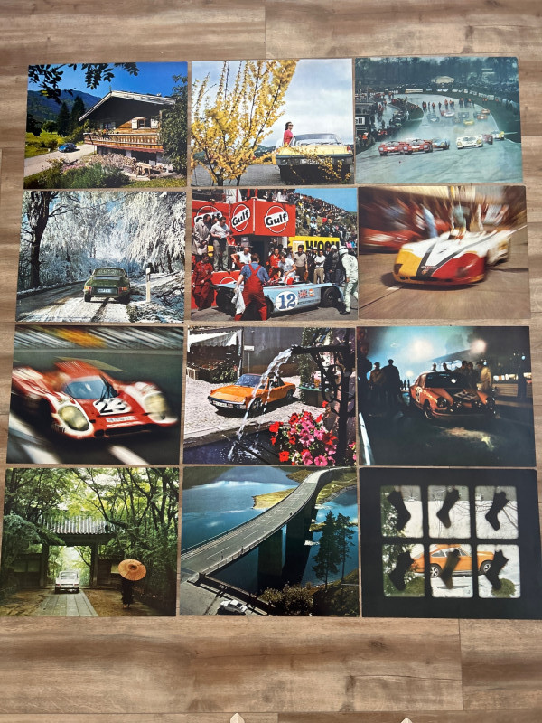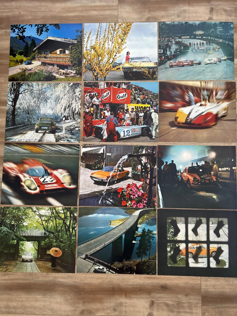 This complete set of 1971 Porsche calendar inserts captures the brand’s golden era in bold, oversized prints. Each image (approx. 18" × 14.5") showcases a different scene—racing drama, scenic drives, and lifestyle vignettes—designed to celebrate Porsche’s design legacy and cultural impact. Includes: 12 original calendar inserts, each with a distinct vintage photograph Year: 1971 Subjects: Porsche 911 and 914 models in aspirational, event-based, and scenic settings Style: Richly saturated, cinematic compositions with strong collector appeal Dimensions: Approx. 18" W × 14.5" H each Condition: Vintage wear consistent with age; sold as-is Background: Part of Porsche’s iconic annual calendar series, the 1971 edition reflects the brand’s shift toward modernism and motorsport prestige. These inserts were produced in limited runs and are prized for their photographic quality and historical relevance.