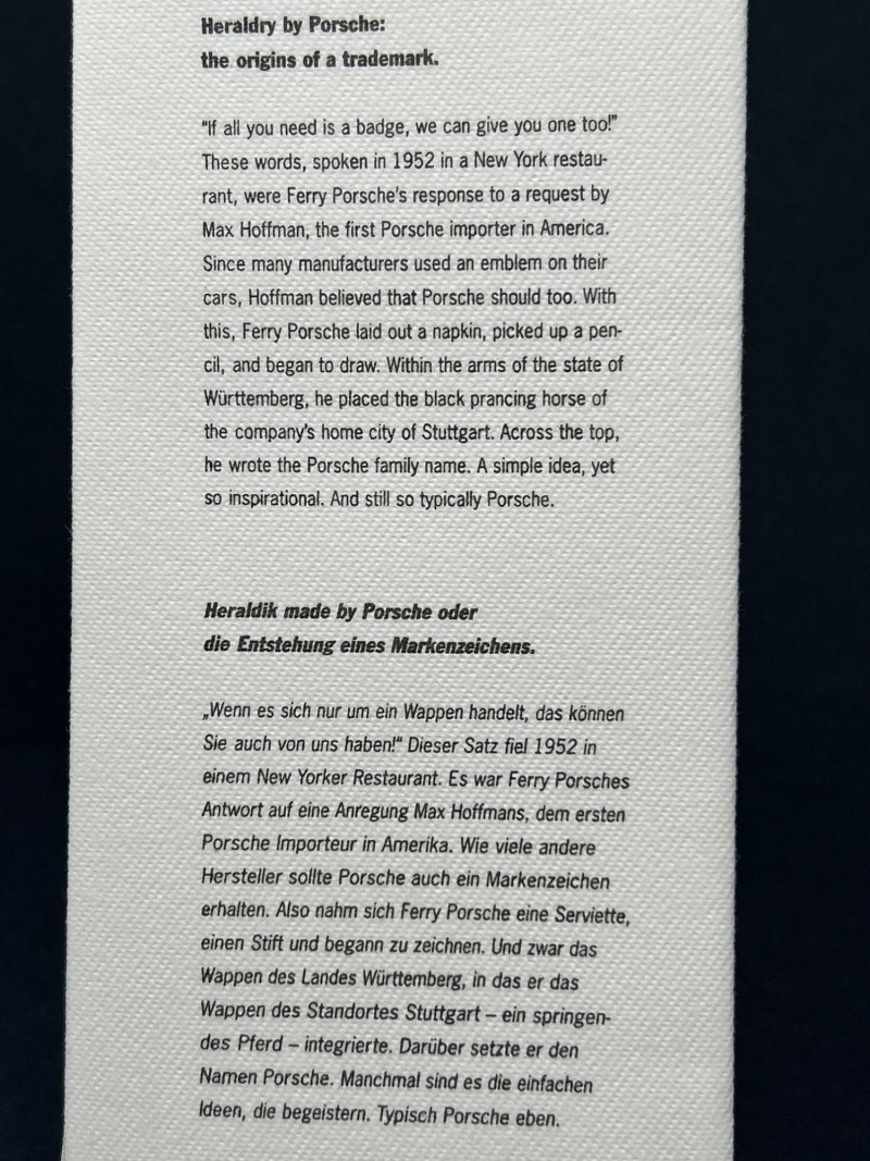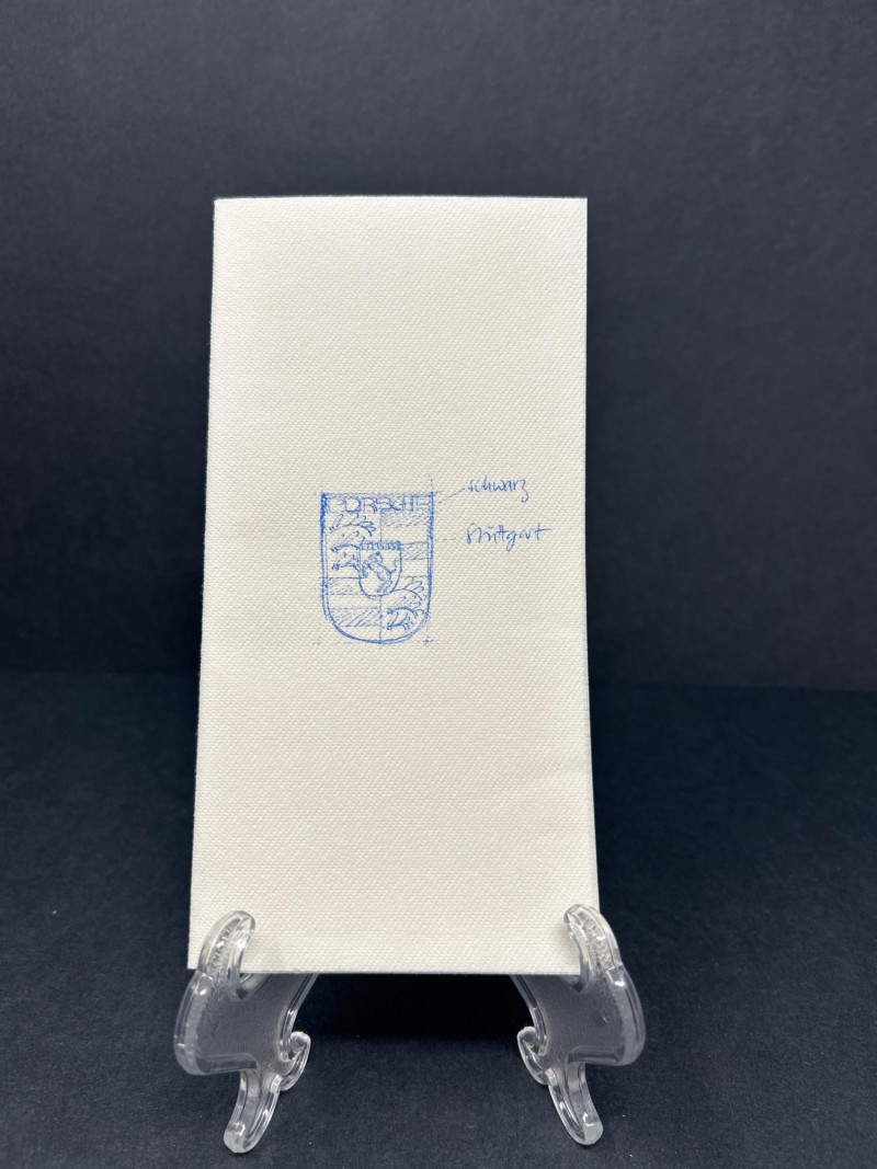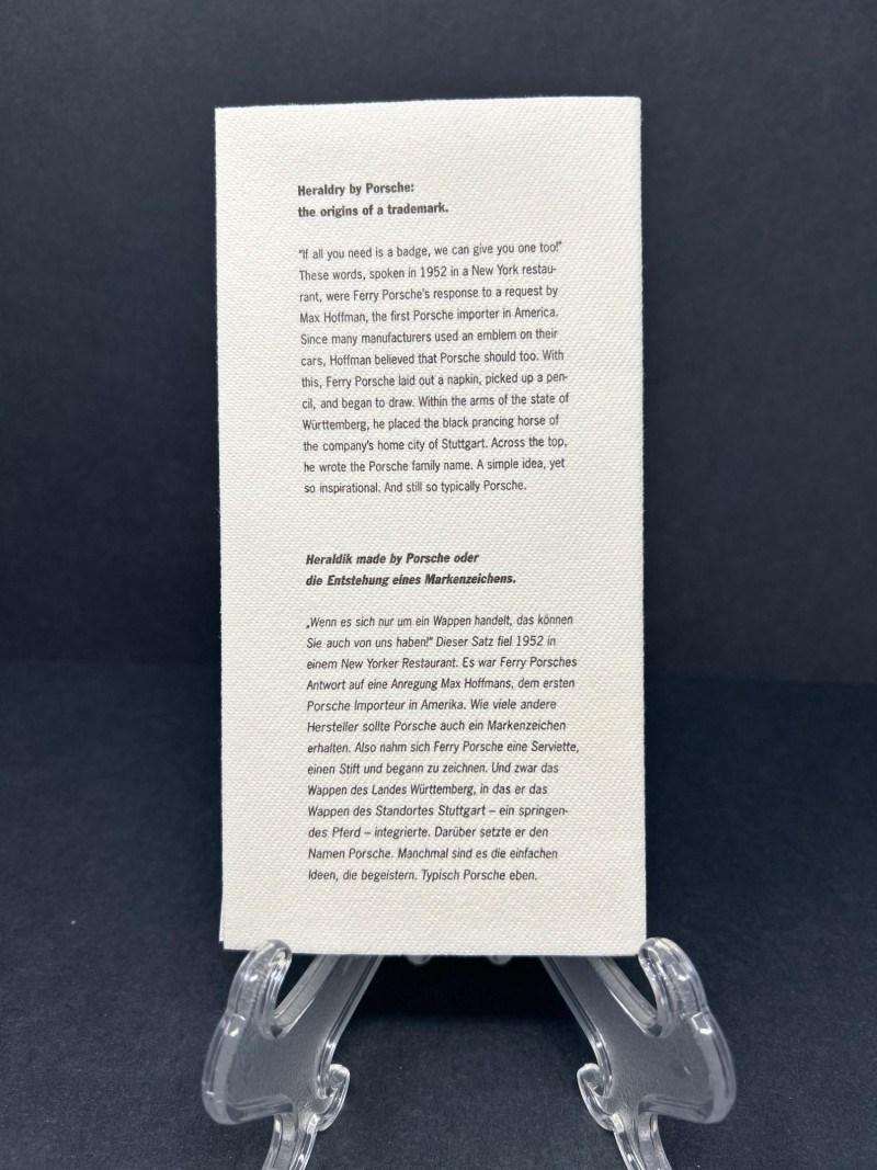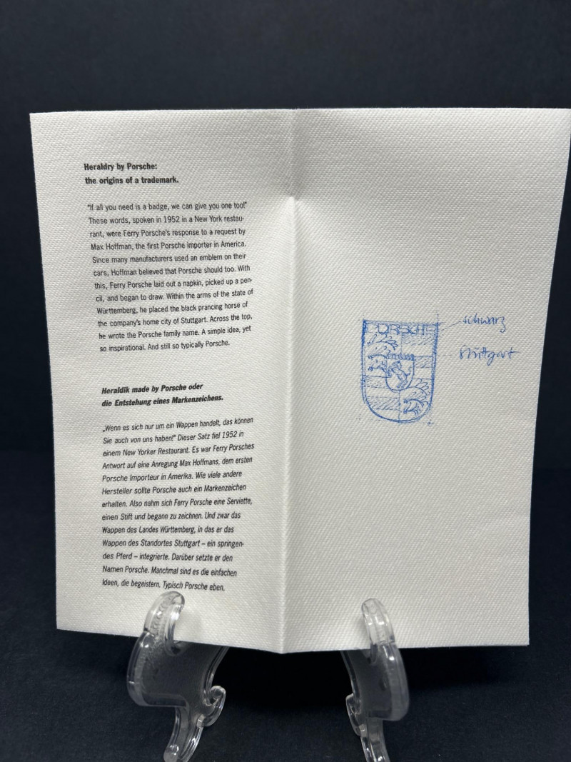 A folded white napkin featuring a printed crest used in early concept work for the Porsche logo, accompanied by handwritten notes: “Schwarz” (black) and “Stuttgart.” This piece is a prototype representation, not the original napkin from the 1951 meeting, but it reflects the visual and thematic elements that shaped Porsche’s iconic emblem. The crest combines heraldic symbols from Württemberg and Stuttgart, echoing the design choices made by Ferry Porsche and Franz Xaver Reimspiess. Included is a bilingual printed card detailing the logo’s origin story, offering context and storytelling value for display.
