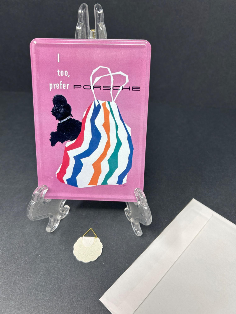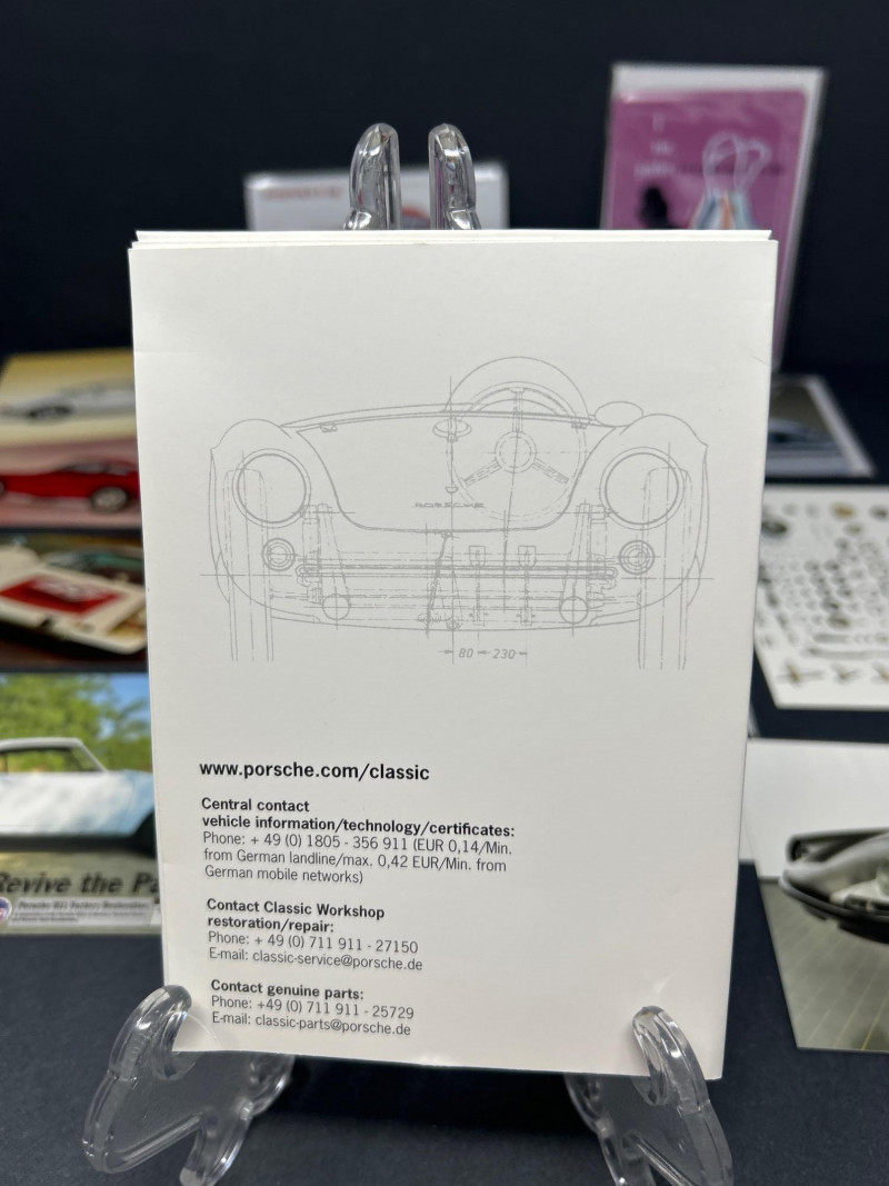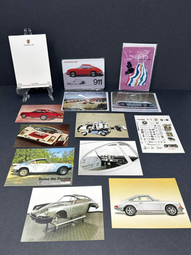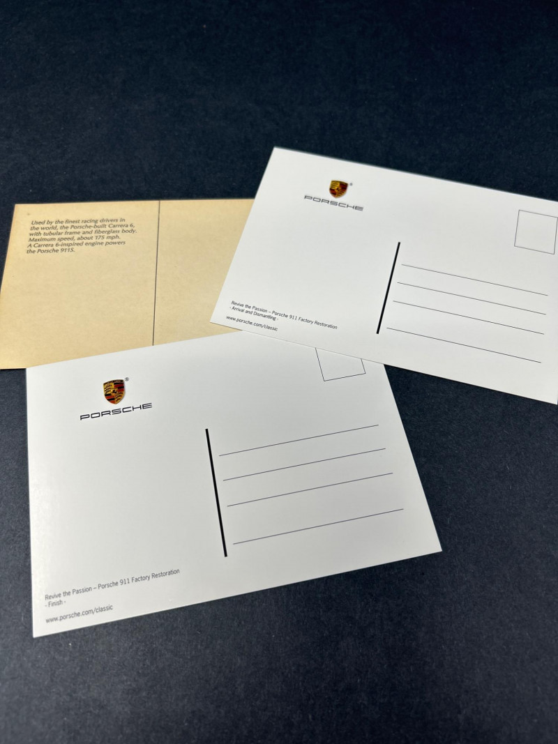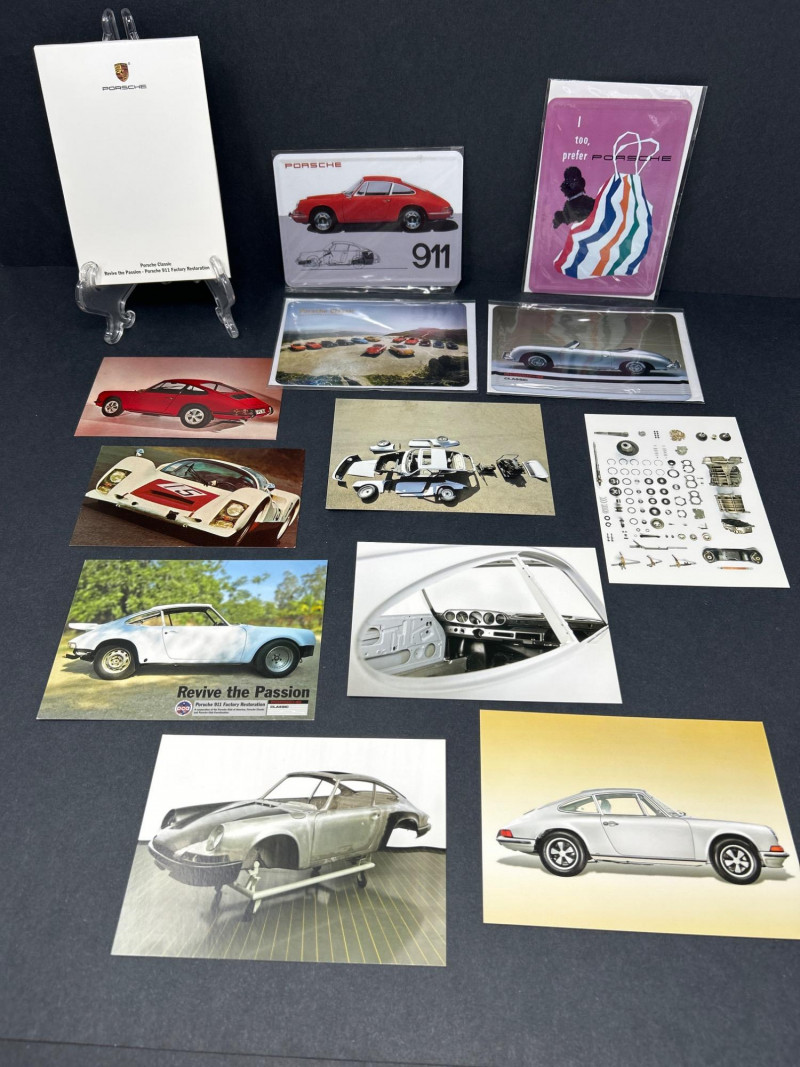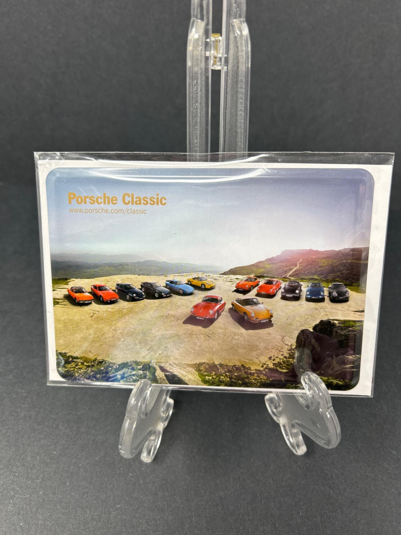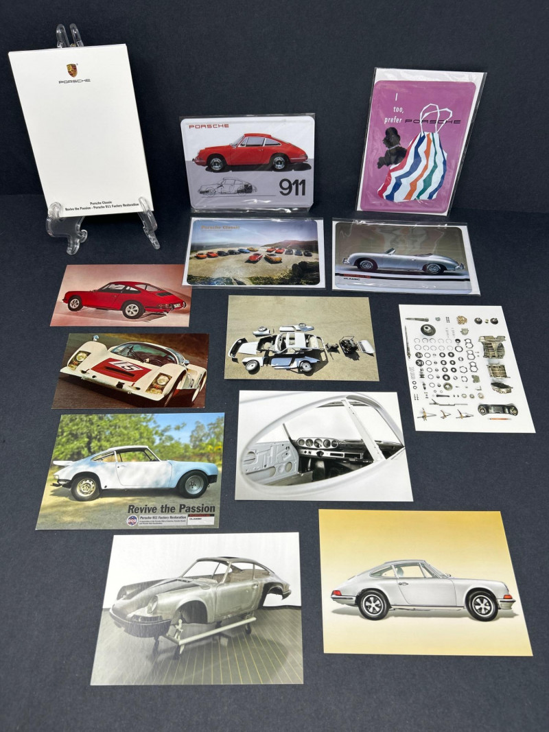 A curated ensemble of Porsche-themed postcards, blending vintage charm, museum-grade visuals, and playful design. This lot includes 8 cardboard and 4 metal pieces, each celebrating a different facet of Porsche’s legacy—from iconic models to brand personality. Highlights include: A Porsche Museum notepad with the official logo A classic red Porsche 911 card A whimsical pink card with the phrase “I like Porsche. And you?” featuring a stylized figure Cards showcasing vintage dashboards, race cars, assembly scenes, and component layouts A sleek silver Porsche model and a blue “Revive the Passion” card that nods to brand revival and emotional connection