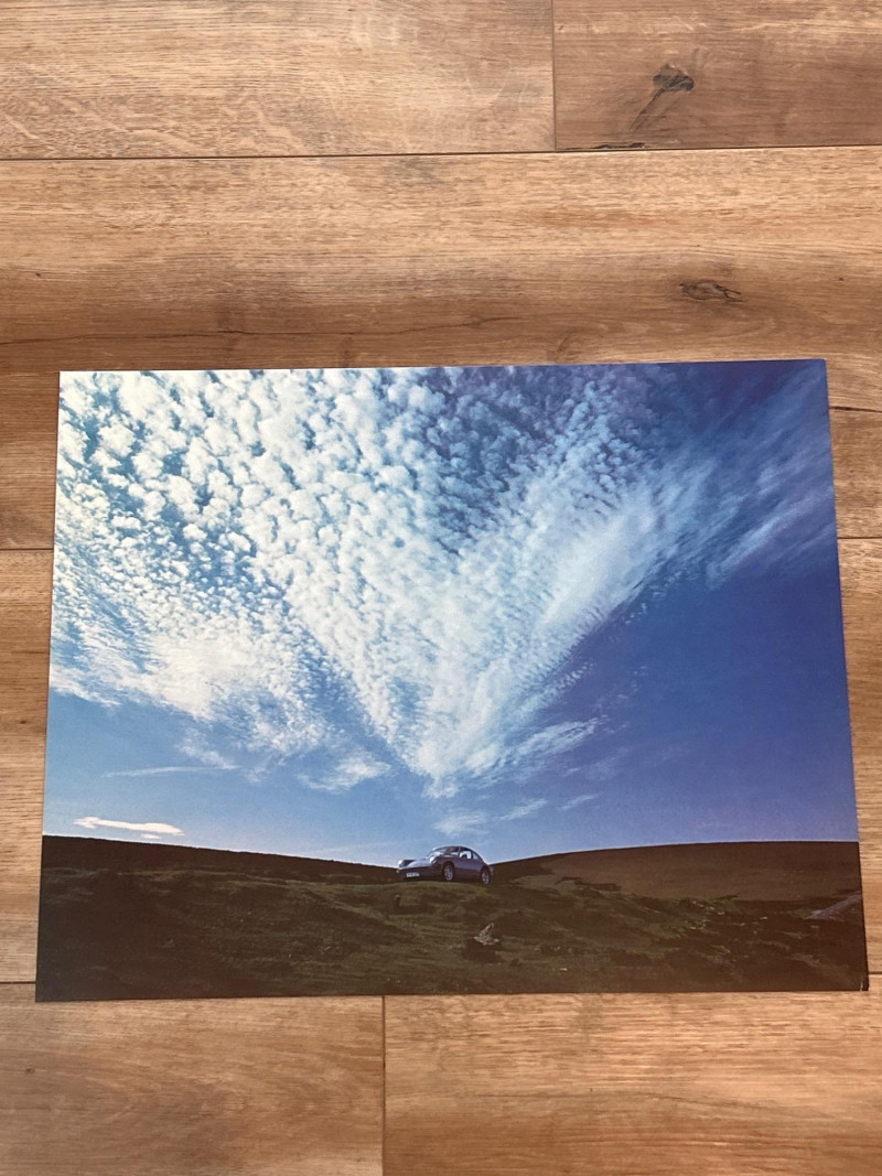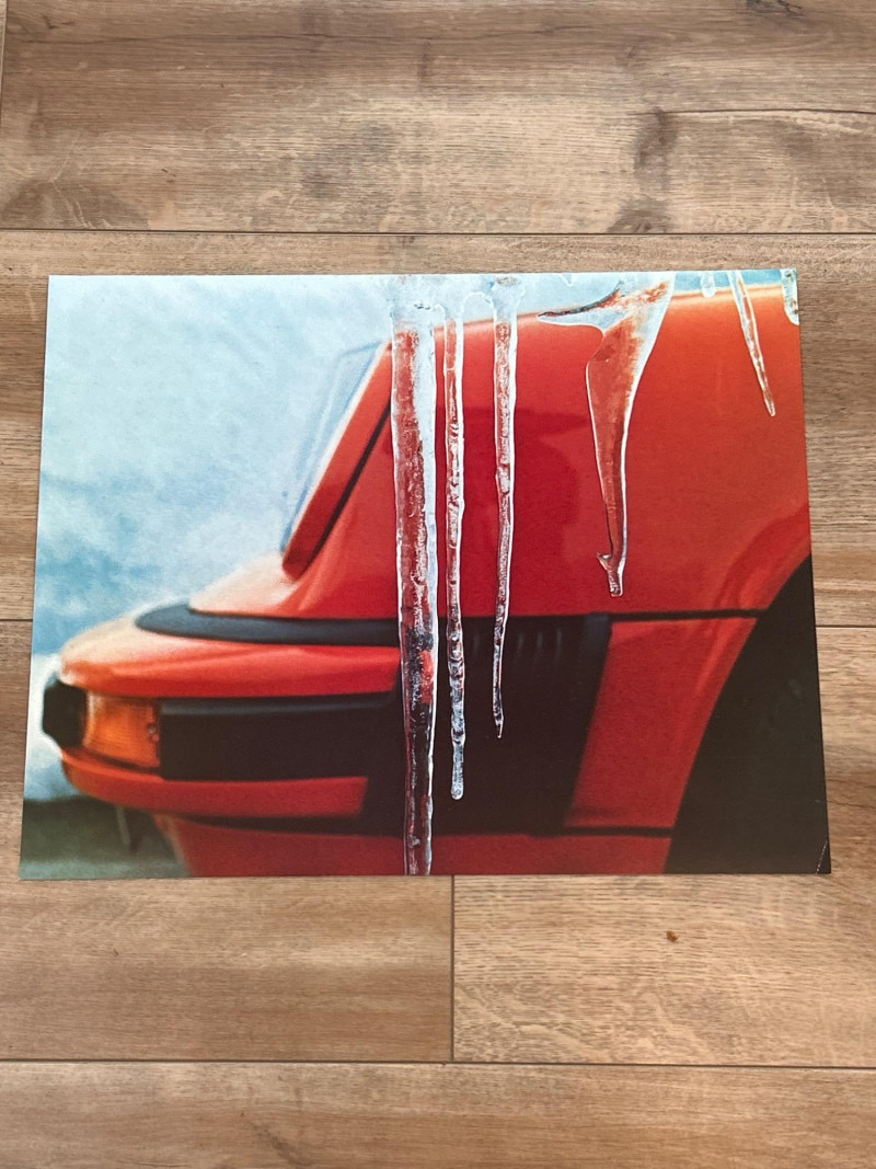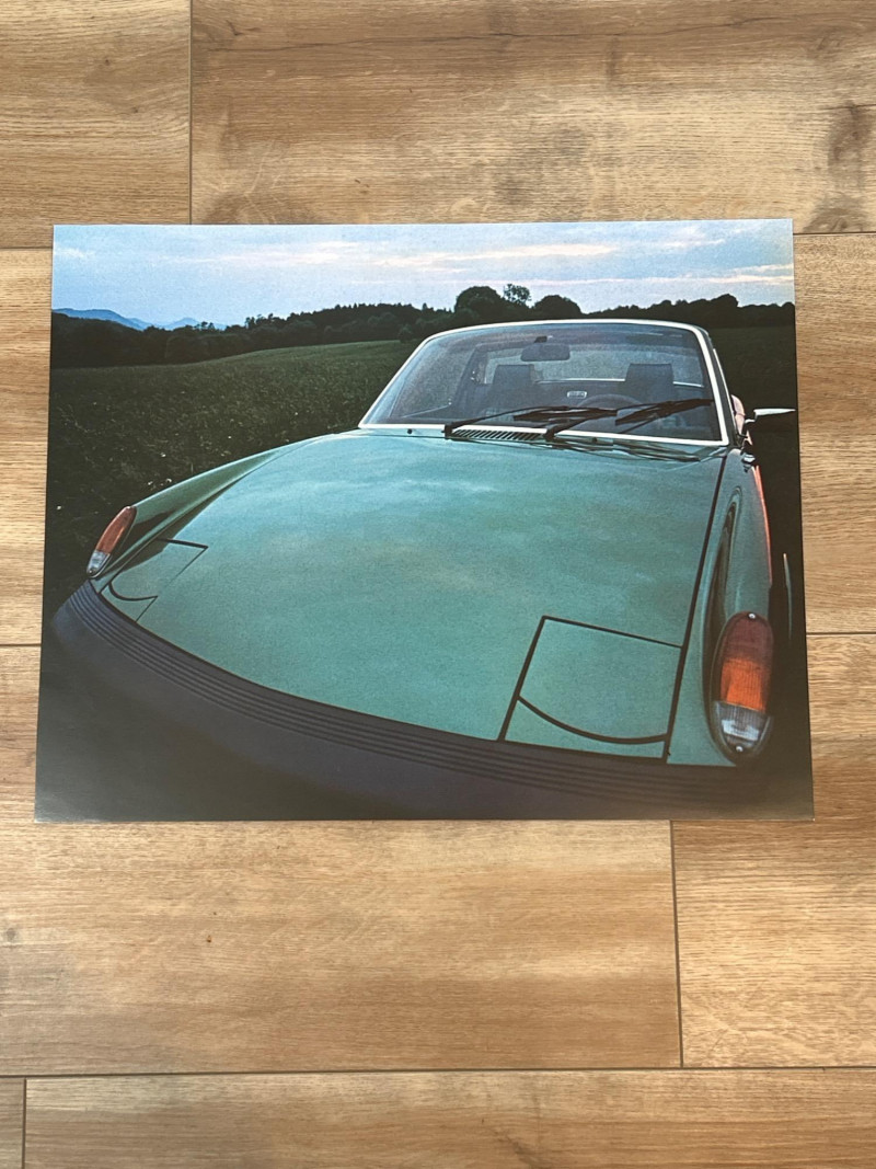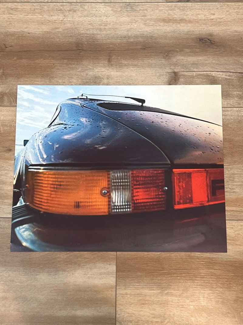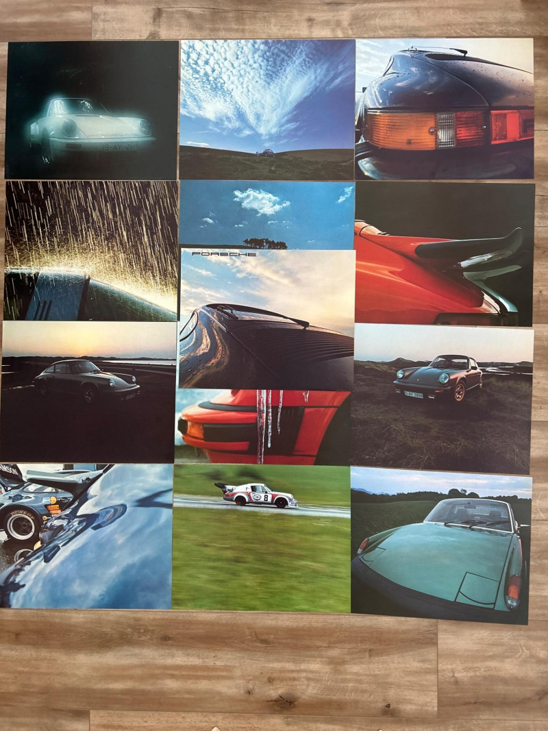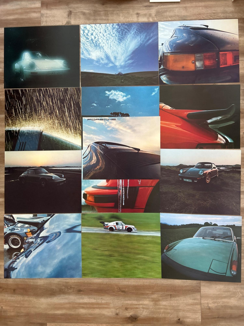 A complete set of twelve unframed photo inserts from Porsche’s 1975 promotional calendar, each featuring the iconic 914 in a distinct visual mood. Measuring 17" x 13.5", these glossy prints capture the cinematic spirit of the 914—rain-slicked roads, glowing headlights, and windswept backdrops that feel lifted from a European film reel. Composition & Condition