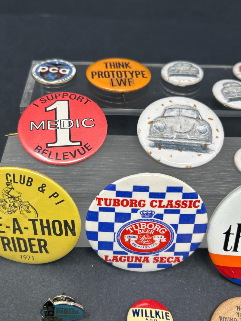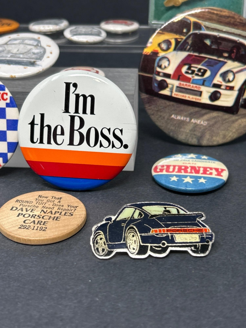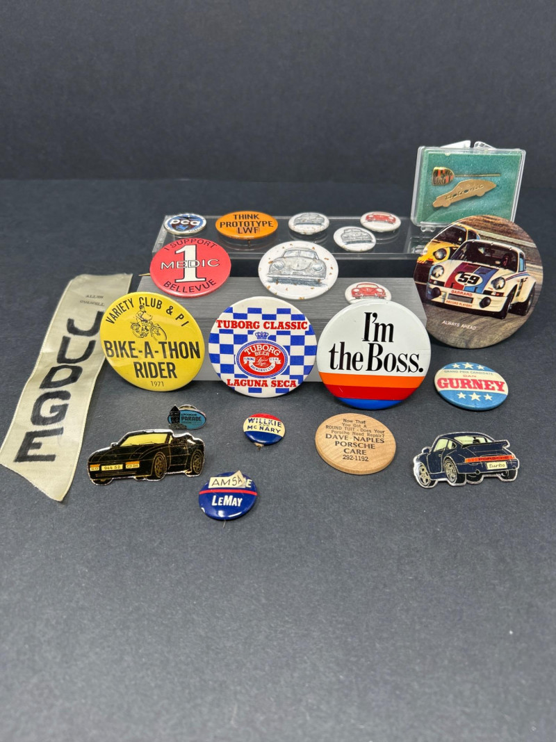 A vibrant and varied collection of vintage racing buttons, patches, and pins, celebrating motorsport legends, events, and enthusiast culture. Highlights include: Support buttons for iconic drivers like Dan Gurney, Phil Hill, Roger Penske, Richie Ginther, Mark Donohue, and many more Event buttons including Tudor Classic Laguna Seca and Bike-a-Thon Rider 1971 (Kiwanis Club) Whimsical slogans like “I’m the Boss” and “1st Medic Delaware” Patches and pins from racing clubs and vintage events, including rare pieces like CUGG and LAMSE LeMAY