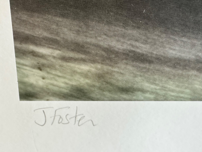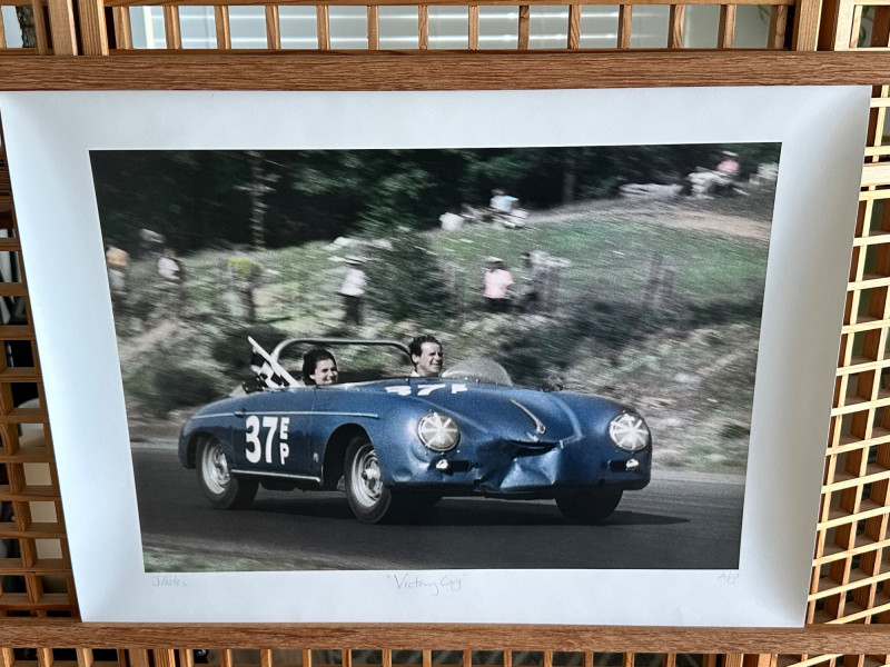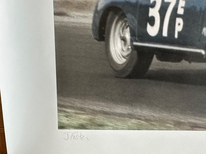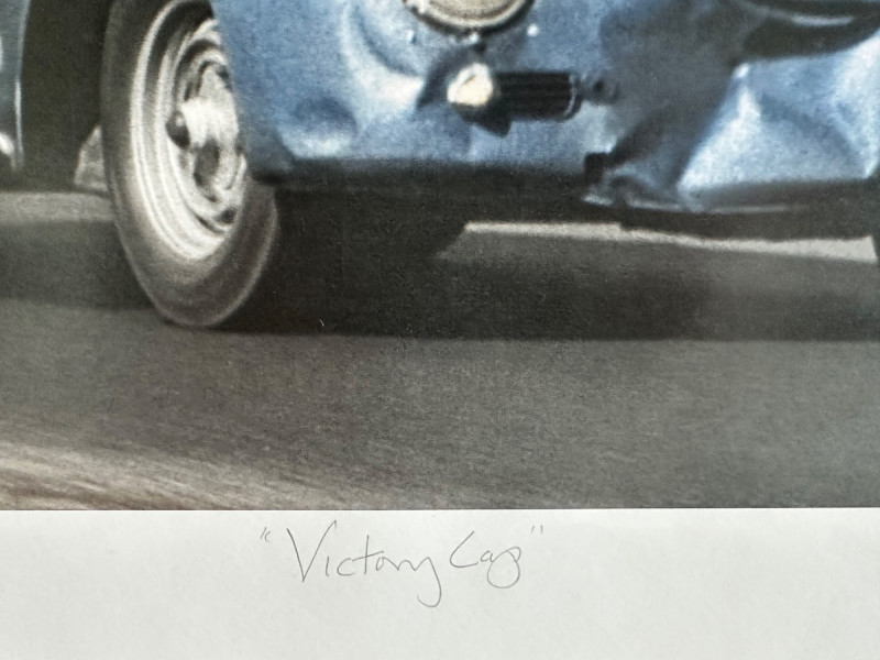 This vintage racing poster captures a jubilant moment mid-race: a classic blue convertible marked “37 E P” speeds past a hillside of spectators, two drivers grinning as they sail through the course. The image is printed on poster stock, not photographic paper, and is hand-signed by J. Foster in the lower margin alongside the handwritten title “Victory Lap” and the name “Jules.” Medium & Presentation