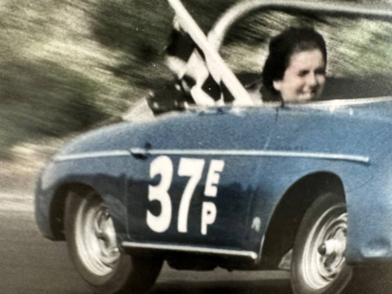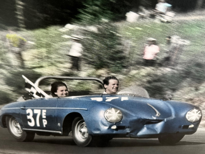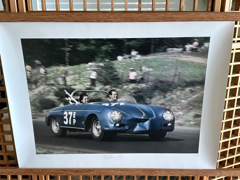Printed on poster-weight paper, unframed. The matte surface and hand-lettered details suggest a limited-run or artist-produced piece, likely from the 1970s–80s. The style blends candid realism with a touch of motorsport romance.