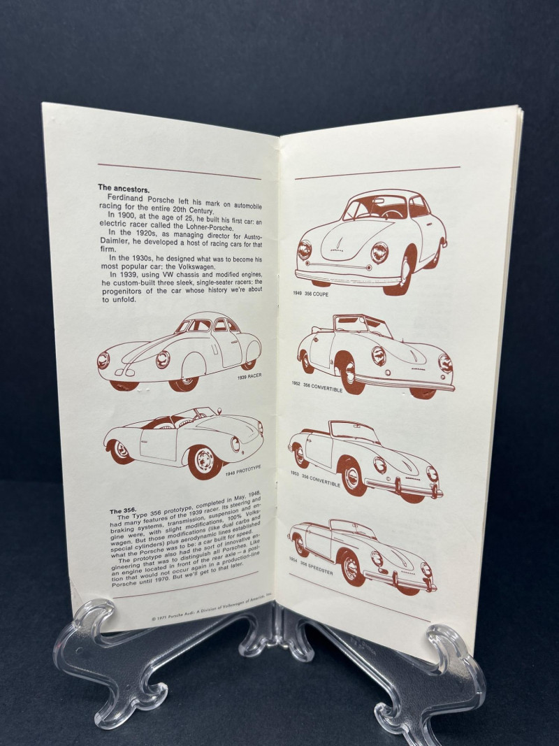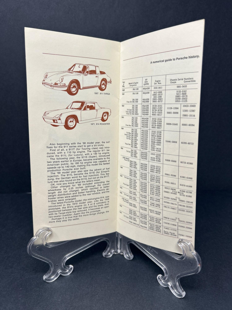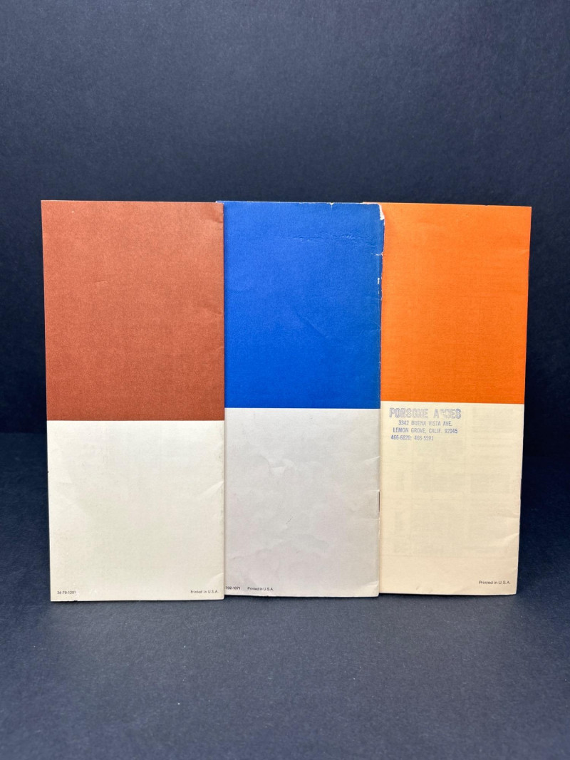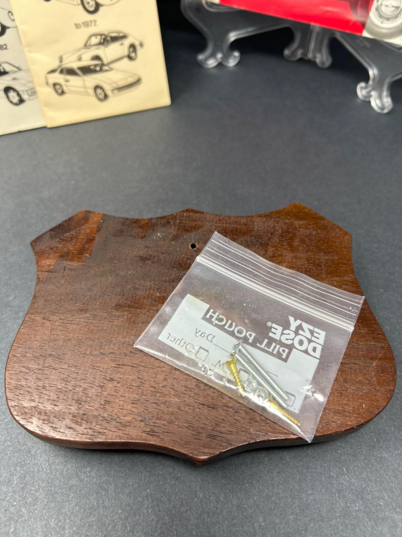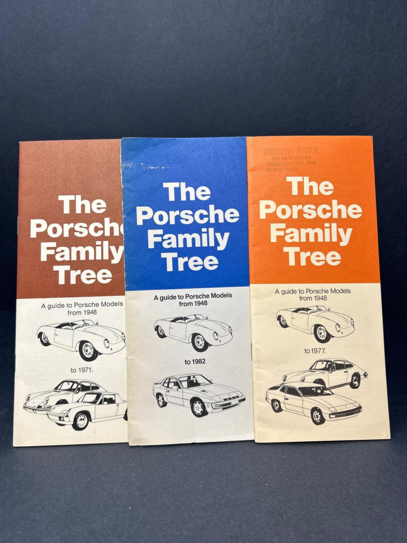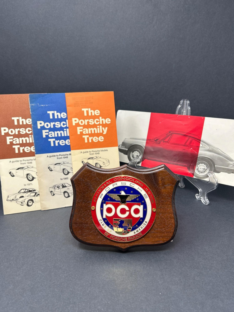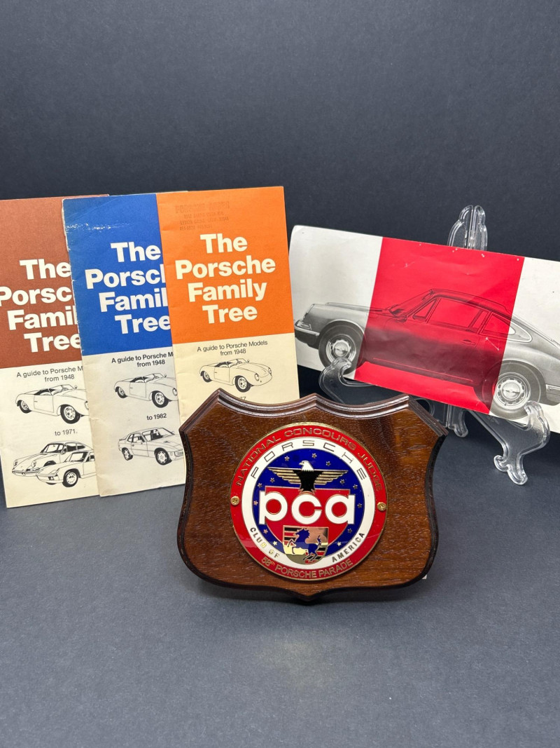 A nostalgic nod to Porsche’s lineage and enthusiast culture, this lot features a trio of “The Porsche Family Tree” guides—each a visual and historical roadmap of Porsche models through the decades: Brown Edition: “to 1971” Blue Edition: “to 1982” Orange Edition: “to 1977" Each booklet is richly illustrated and color-coded by era, offering collectors and restorers a quick-reference guide to Porsche’s evolving design DNA. Ideal for display, research, or gifting to the marque-obsessed. Also included: A vintage Porsche photo or postcard, partially veiled in a red translucent overlay—evocative and display-ready. A shield-shaped wooden plaque from the Original Porsche Club / Porsche Parade, featuring the PCA emblem and a stylized American flag motif. A likely judges’ award or commemorative piece from a club event.