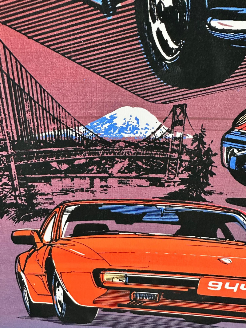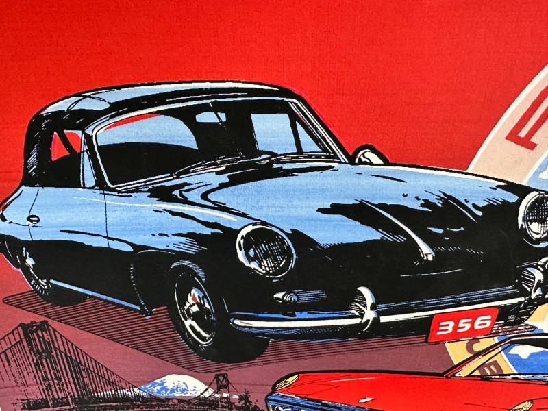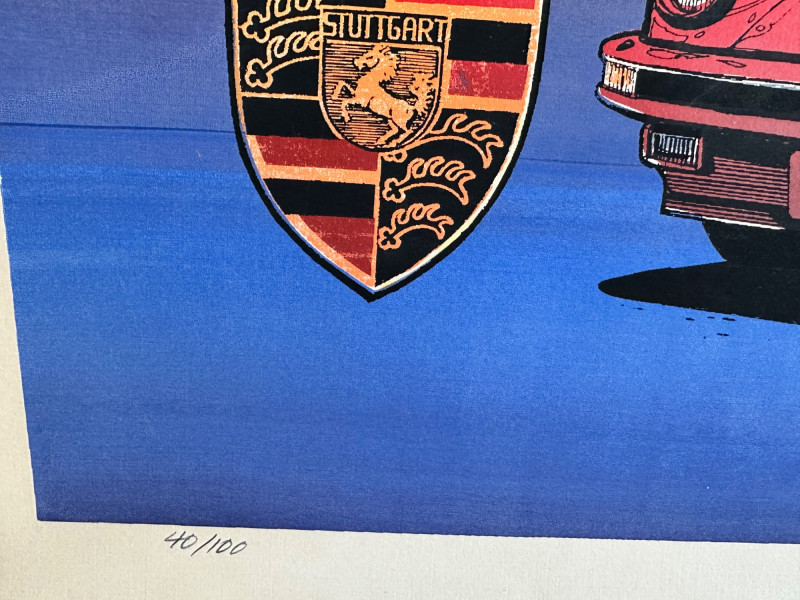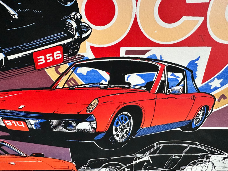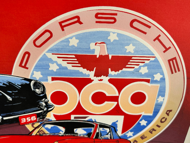 This vibrant, limited edition poster celebrates Porsche’s legacy through bold color blocking and a collage of classic models. Issued by the Porsche Club of America (PCA), the artwork features a dynamic red-and-blue background, anchored by the PCA logo and Porsche crest. Signed and numbered by the artist, this piece blends club pride with collector appeal. Medium & Format