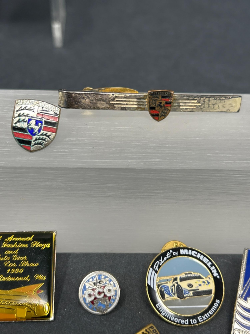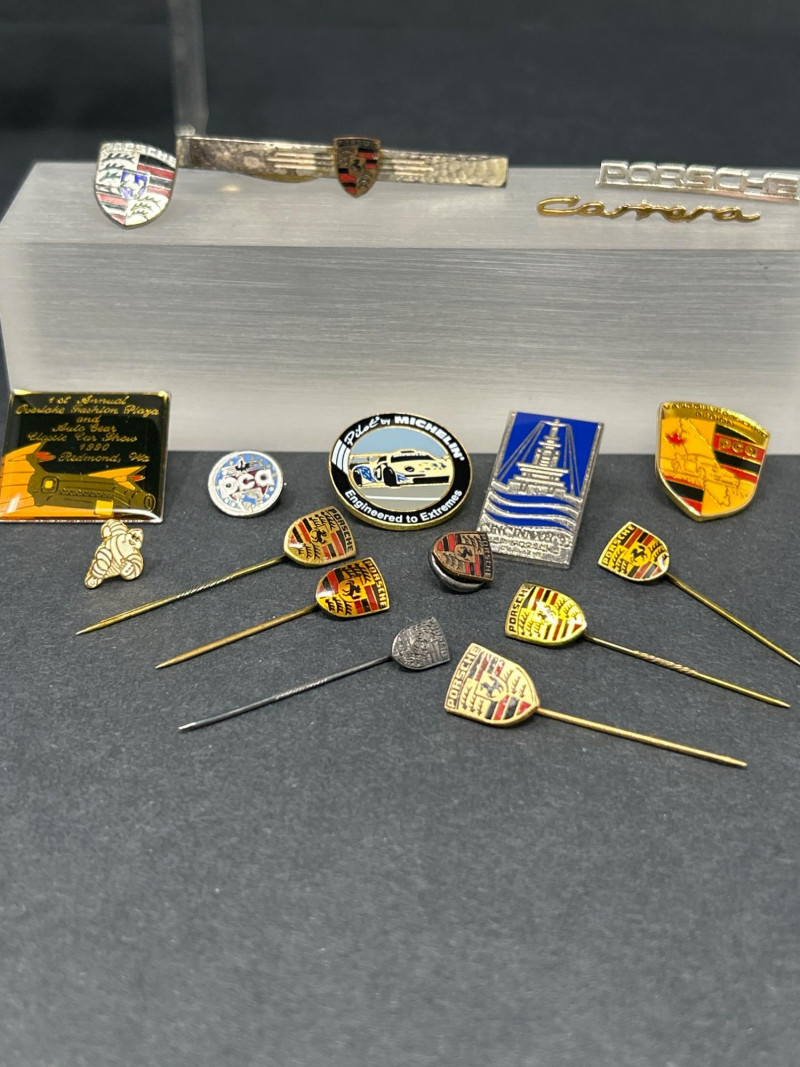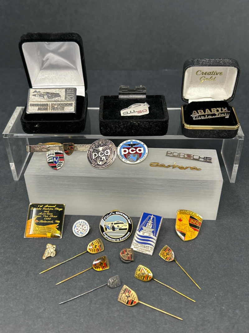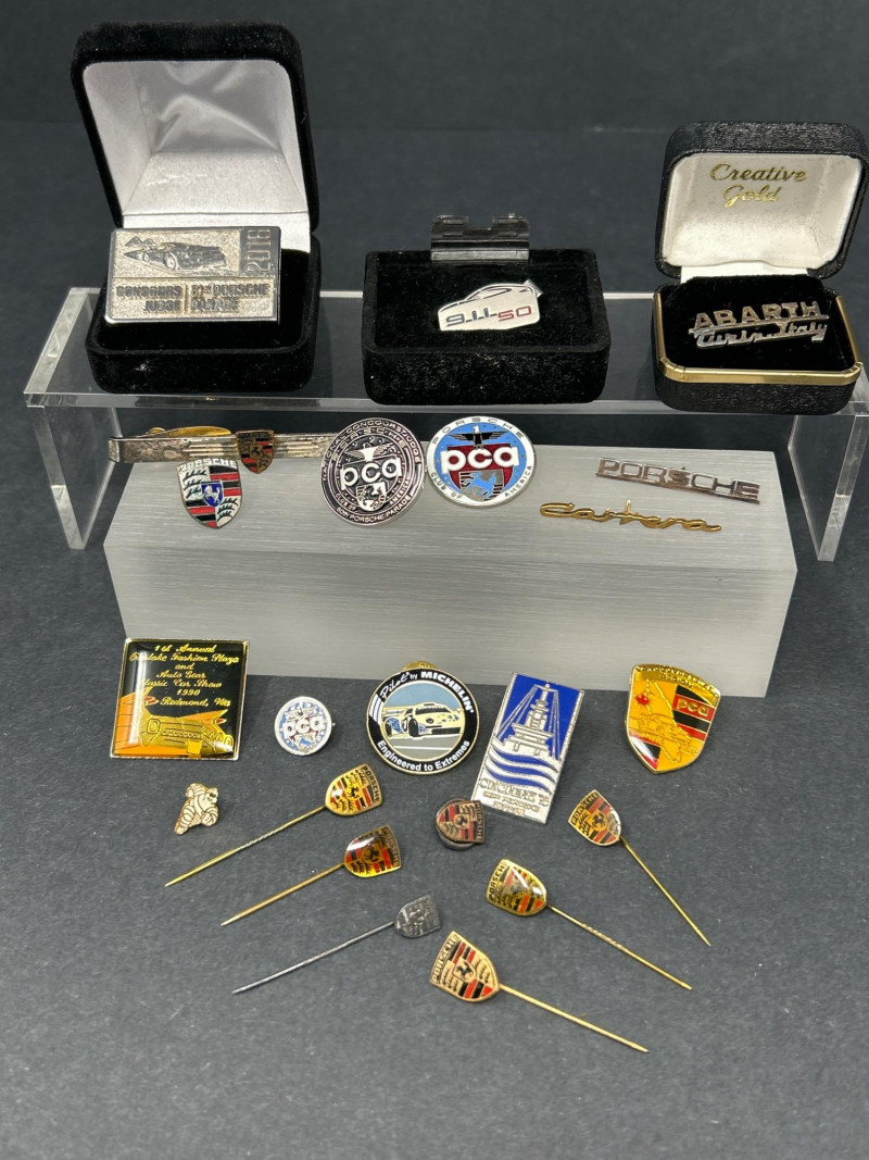Club Crests, Rally Badges & Display Boxes A spirited ensemble of automotive memorabilia, this curated pin collection celebrates the camaraderie, craftsmanship, and club pride of Porsche and Abarth devotees. Displayed on a sleek acrylic stand and black surface, the set includes: Vintage car badge with metallic finish and text “356” badge honoring Porsche’s iconic early model “Creative Gold” badge with stylized branding Porsche crest in classic enamel Two “PCQ” circular badges with distinct designs Carrera script badge in elegant cursive ABARTH World Rally badge with bold red accents Quote badge: “It’s not just the cars, it’s the people” Architectural badge with stylized building motif Porsche Club crest badge with “Club” text Semi-circle of Porsche crest pins, featuring both long and short stems—ideal for display or wearable flair Whether you're outfitting a shadowbox, accessorizing your driving jacket, or gifting a fellow gearhead, this lot offers a rich mix of nostalgia, prestige, and motorsport spirit. Top Row – Display Boxed Pins