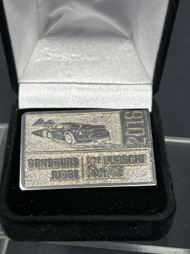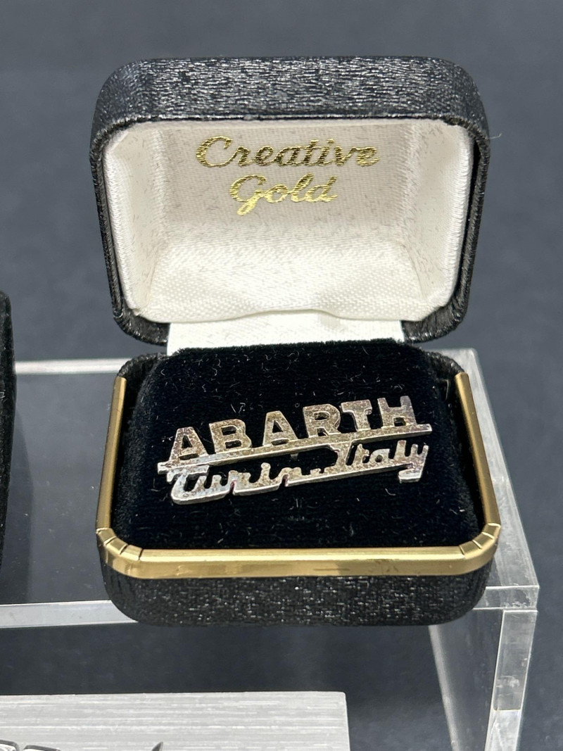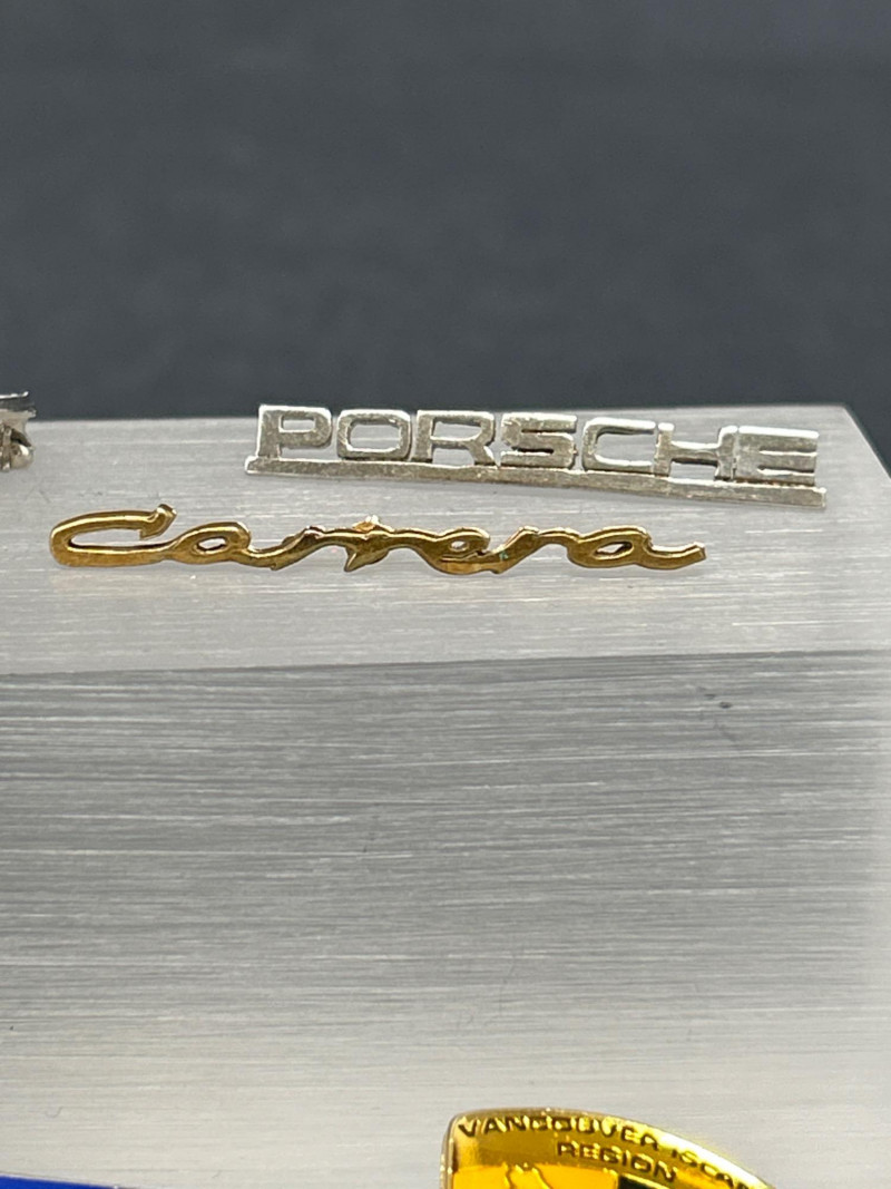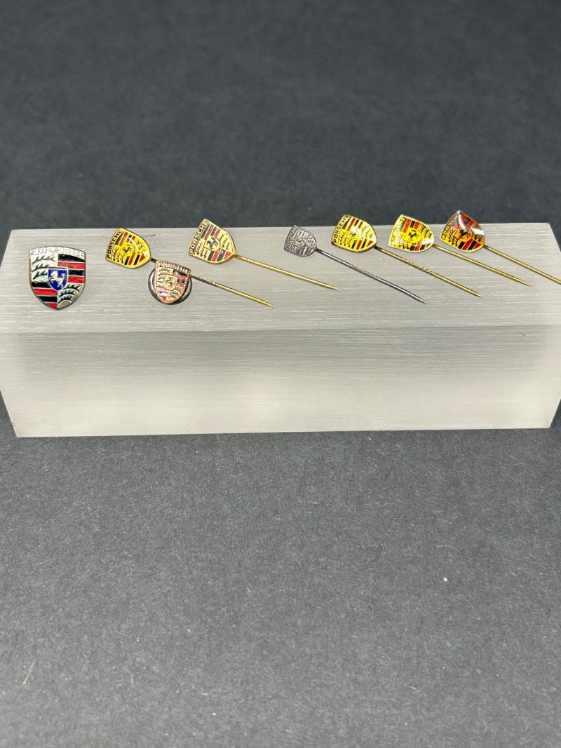 Club Crests, Rally Badges & Display Boxes A spirited ensemble of automotive memorabilia, this curated pin collection celebrates the camaraderie, craftsmanship, and club pride of Porsche and Abarth devotees. Displayed on a sleek acrylic stand and black surface, the set includes: Vintage car badge with metallic finish and text “356” badge honoring Porsche’s iconic early model “Creative Gold” badge with stylized branding Porsche crest in classic enamel Two “PCQ” circular badges with distinct designs Carrera script badge in elegant cursive ABARTH World Rally badge with bold red accents Quote badge: “It’s not just the cars, it’s the people” Architectural badge with stylized building motif Porsche Club crest badge with “Club” text Semi-circle of Porsche crest pins, featuring both long and short stems—ideal for display or wearable flair Whether you're outfitting a shadowbox, accessorizing your driving jacket, or gifting a fellow gearhead, this lot offers a rich mix of nostalgia, prestige, and motorsport spirit. Top Row – Display Boxed Pins