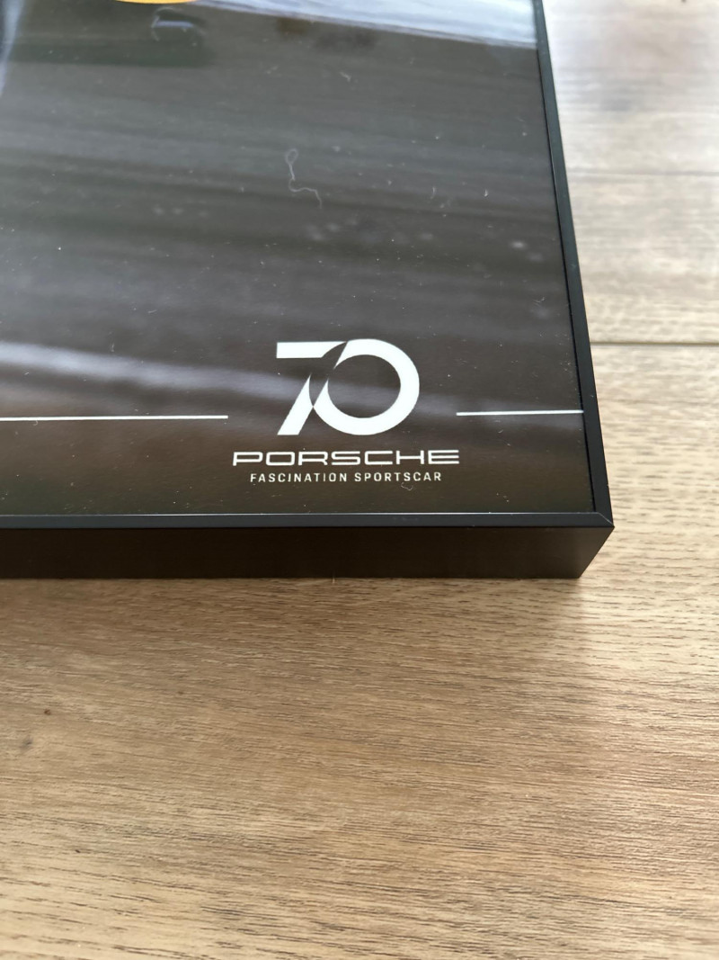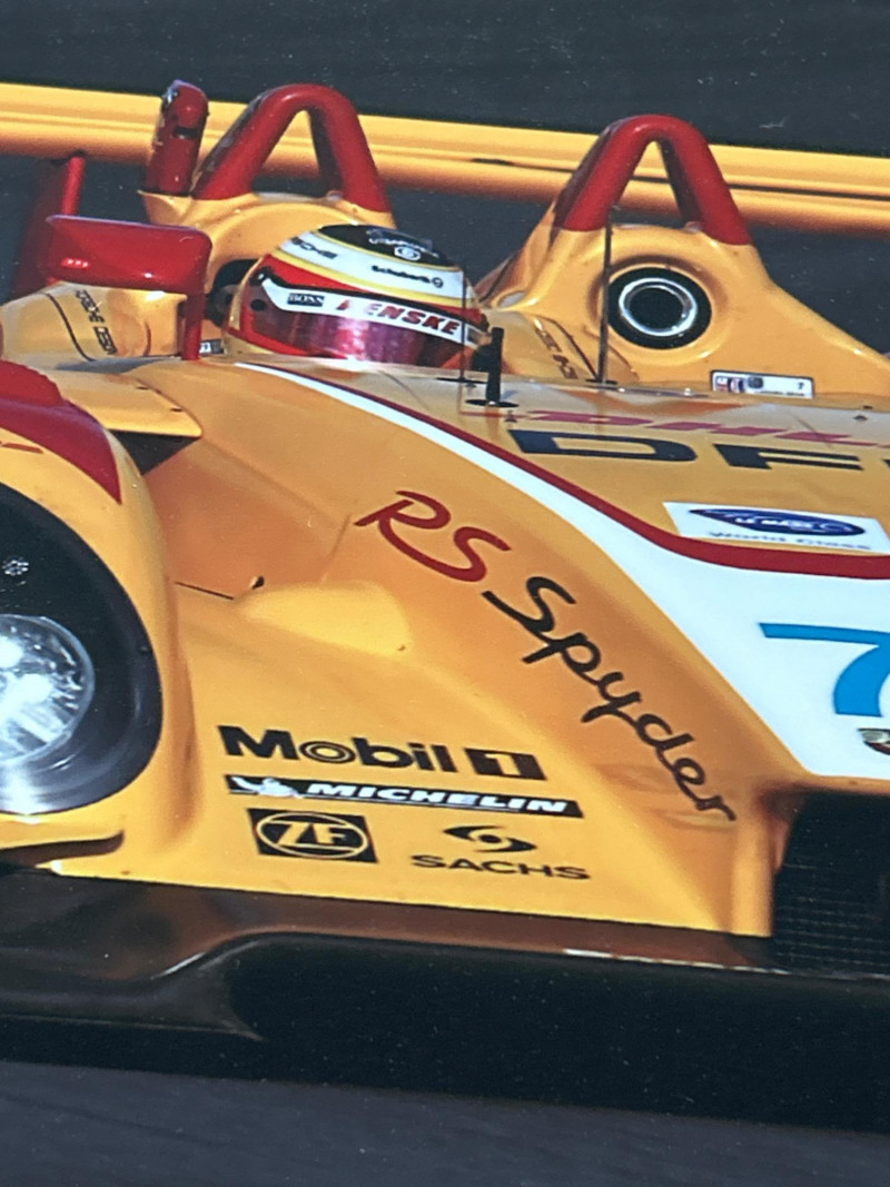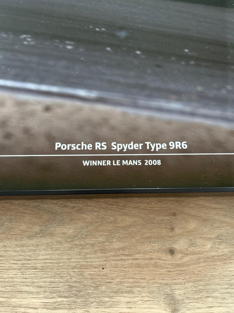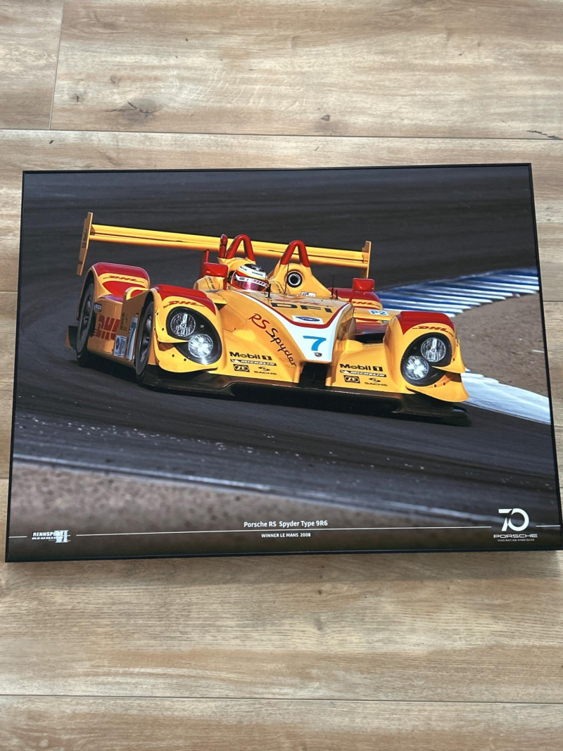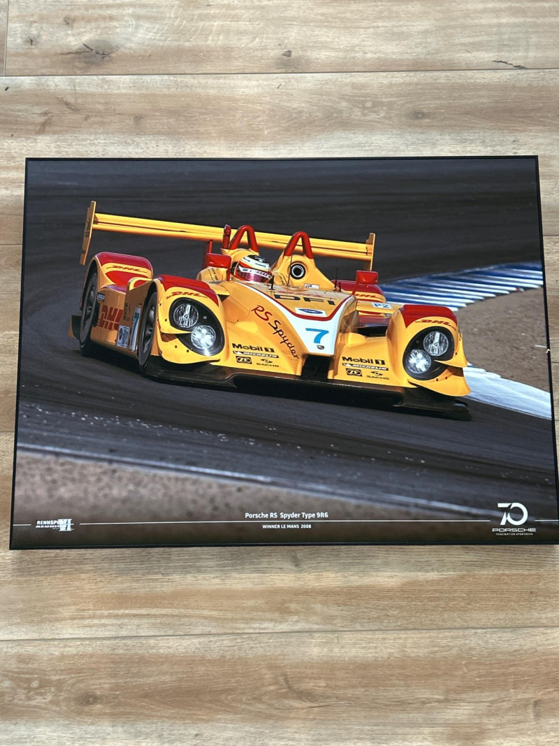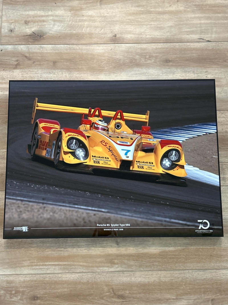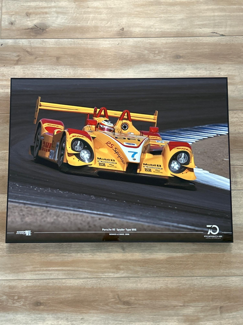 A dynamic tribute to Porsche’s endurance racing legacy, this framed poster captures the RS Spyder Type 9R6 in full tilt—leaning into a turn with tire marks blazing and sponsors flying. Dressed in its iconic DHL/Michelin livery, the #7 car is shown mid-race, a visual symphony of speed, engineering, and aerodynamic precision. Visual Details: Bright yellow and red race livery with sponsor logos: DHL, Michelin, and more Car in motion on a racetrack, curbing and tire marks visible Prominent number “7” on the nose cone Captioned: “Porsche RS Spyder Type 9R6 – Porsche Museum” Presentation: Professionally framed for display Museum-style captioning adds provenance and polish Dimensions: 24 x 18 Condition: Excellent; frame and image show minimal wear Collector Notes: