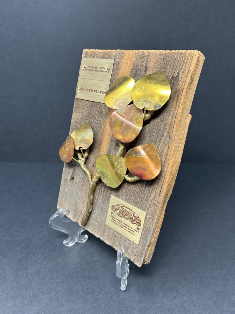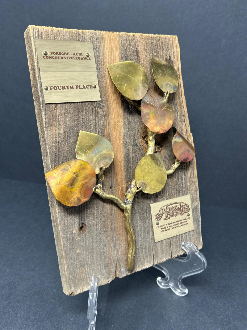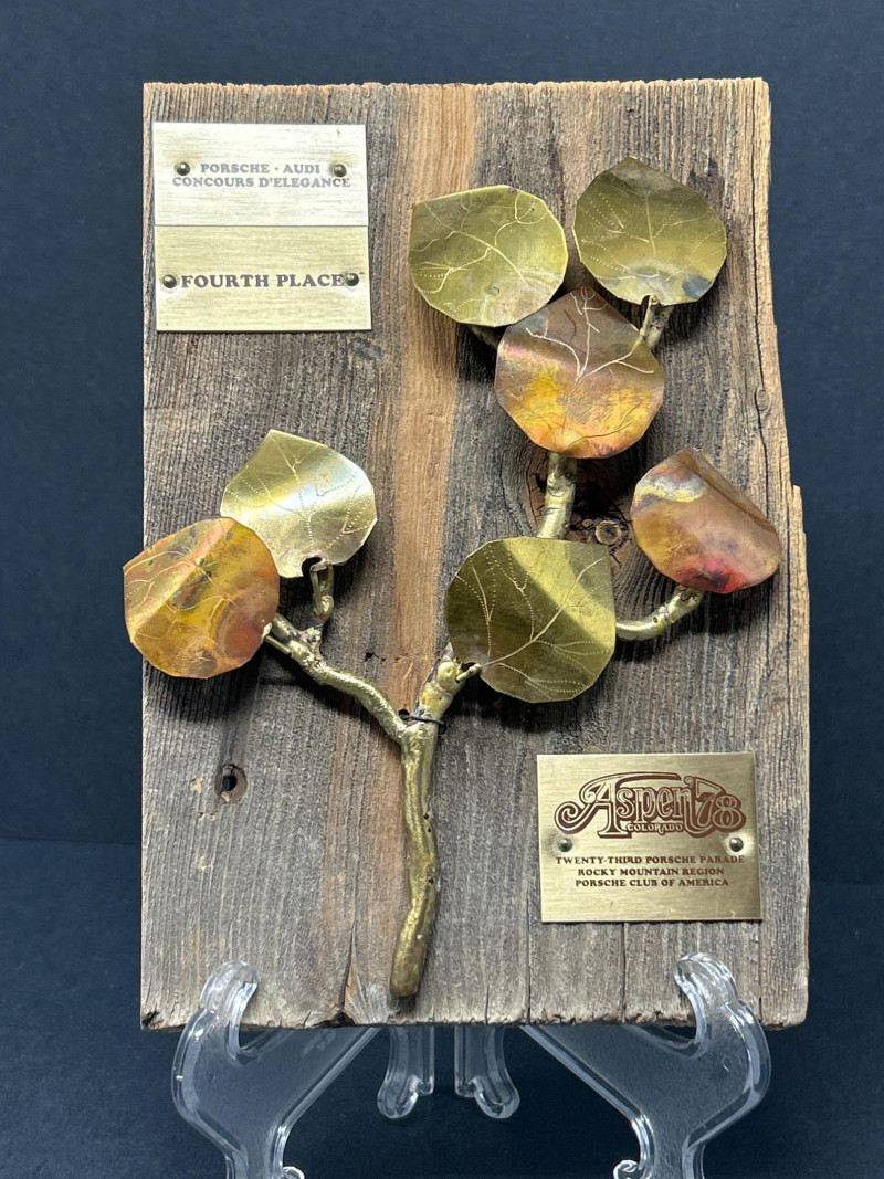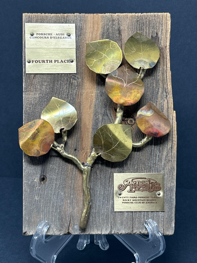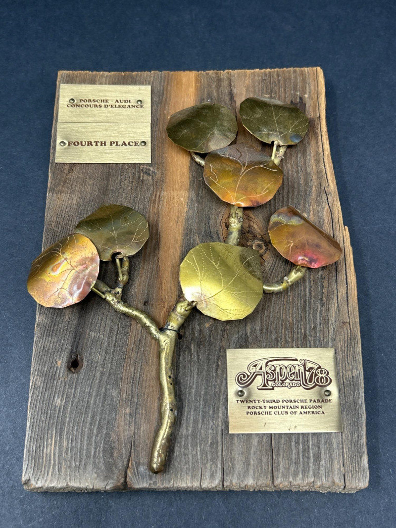 A sculptural salute to vintage Porsche prestige, this 1978 Concours d’Elegance award blends rustic charm with motorsport legacy. Mounted on richly toned wood, the plaque features an artistic spray of metal branches and leaves—evoking Aspen’s alpine elegance and the spirited camaraderie of the Twenty-Third Porsche Parade. Three engraved plates mark its provenance: Top: PORSCHE - AUDI CONCOURS D'ELEGANCE Center: FOURTH PLACE Bottom: ASPEN '78 – TWENTY THIRD PORSCHE PARADE – PORSCHE CLUB OF AMERICA 6 x 9