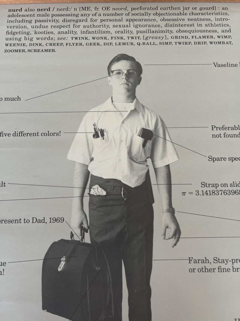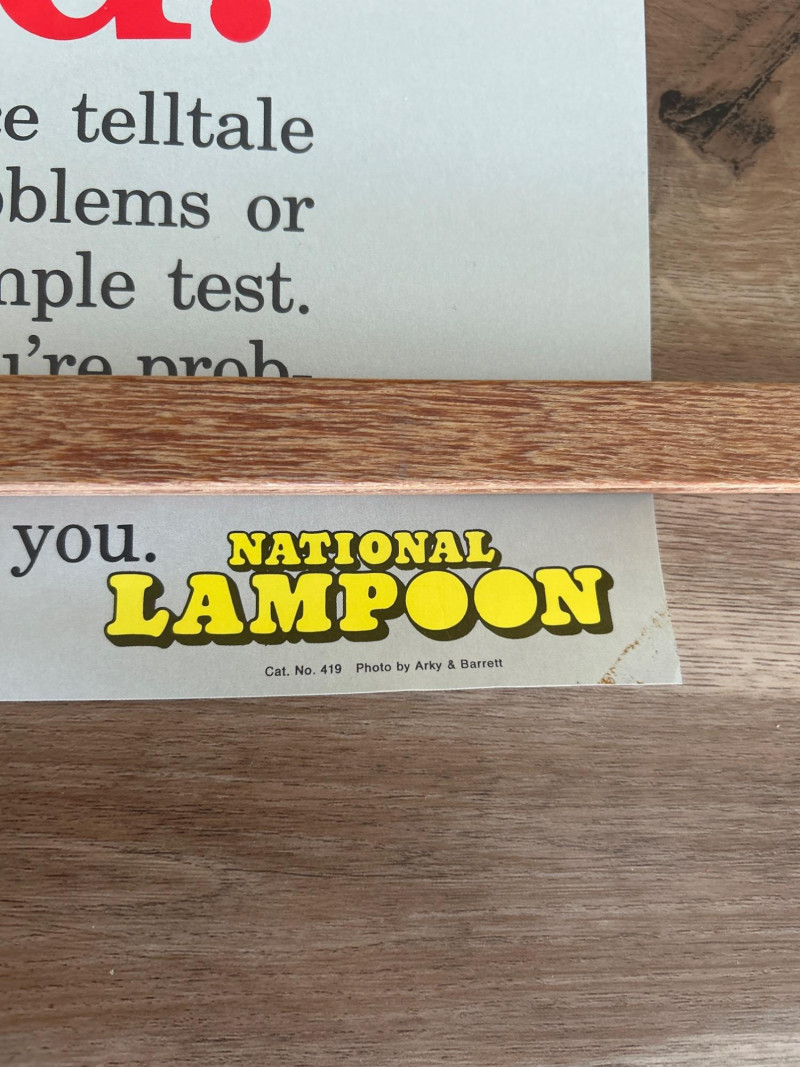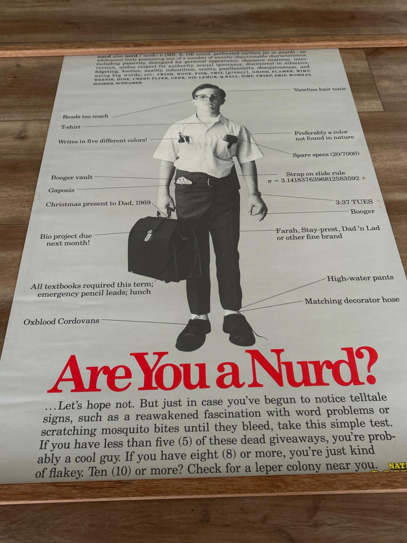 A satirical relic from the golden age of irreverent humor, this oversized poster from National Lampoon asks the eternal question: “Are You a Nurd?” Featuring a bespectacled youth in peak nerd regalia—slide rule case, Vaseline hair tonic, high-water pants, and a booger vault (yes, really)—each element is hilariously annotated in classic Lampoon style. Originally published in the 1970s, this piece skewers stereotypes with a wink and a wince, making it a perfect addition to any retro media collection, dorm wall revival, or shrine to vintage absurdity.
