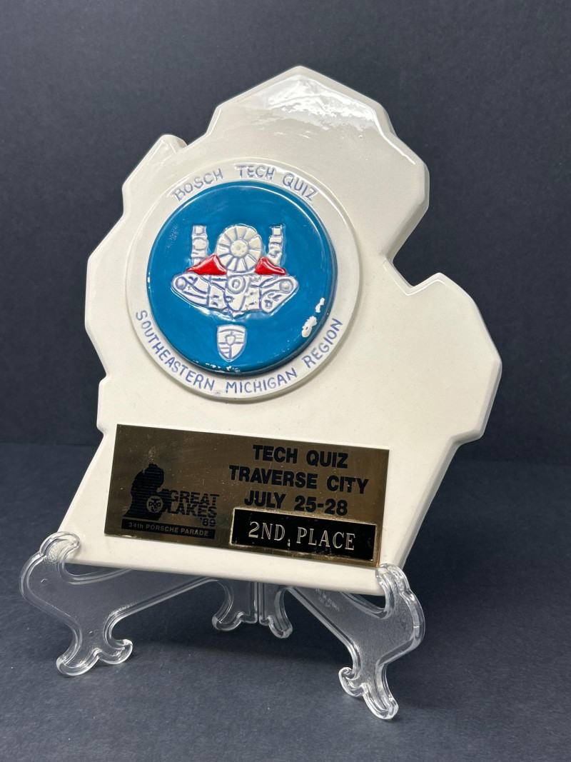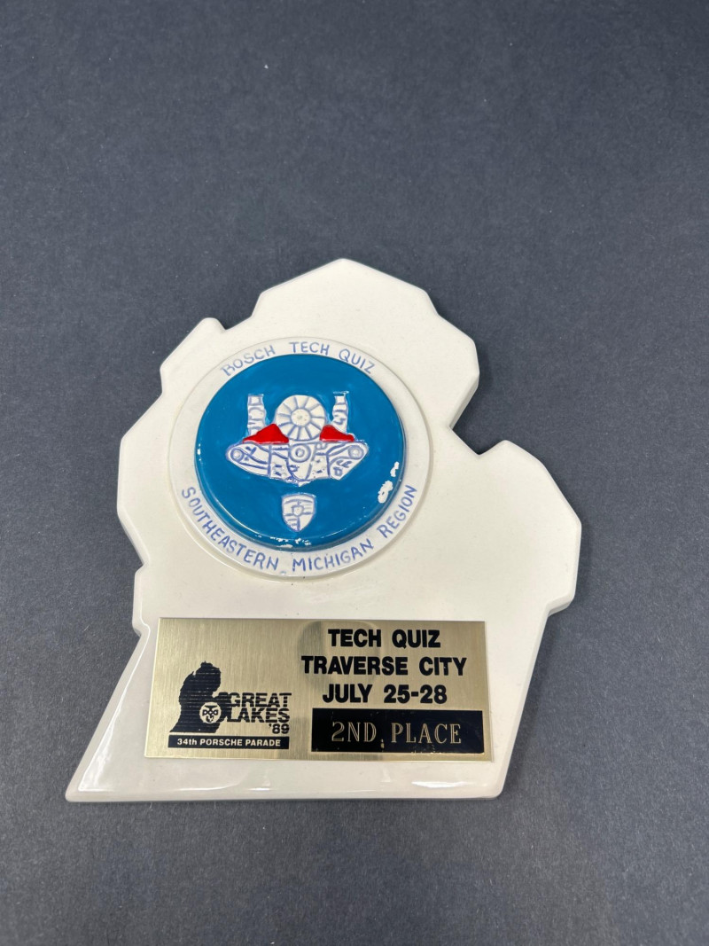 Southwestern Michigan College – Tech Quiz & Driving Event- Porsche Parade Traverse City Automotive Trophies Celebrate the grit and glory of grassroots competition with this pair of Michigan-shaped trophies, awarded at a July 25–28 event in Traverse City. Each piece honors a distinct achievement in automotive skill and knowledge, hosted by Southwestern Michigan College. Circular emblem featuring engine tools and “BOSCH TECH QUIZ” Plaque reads: