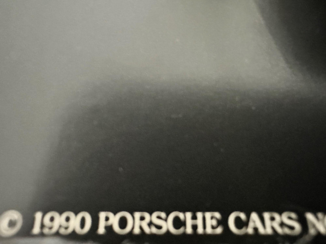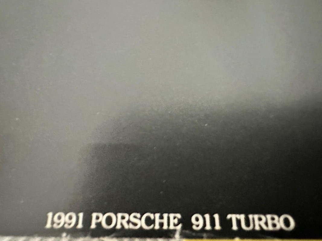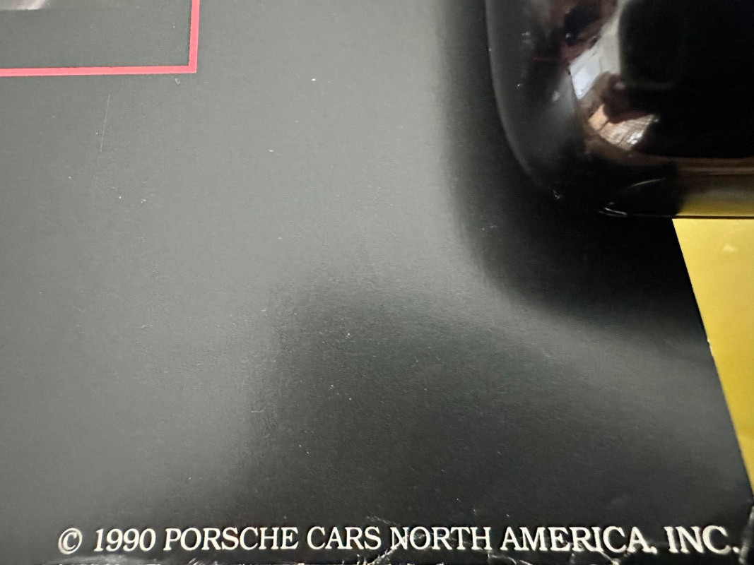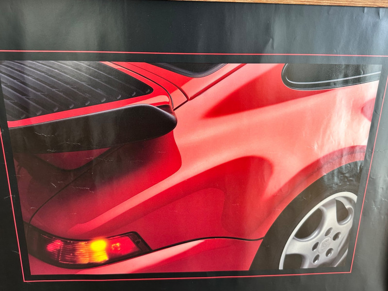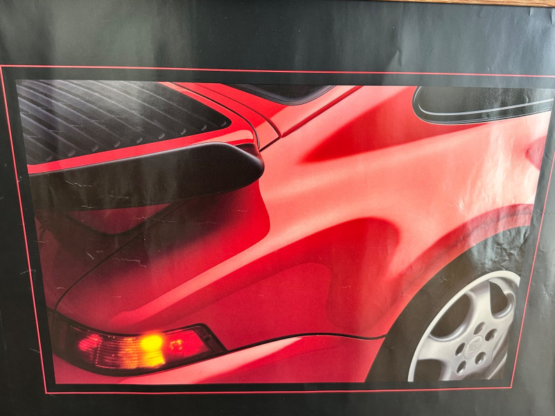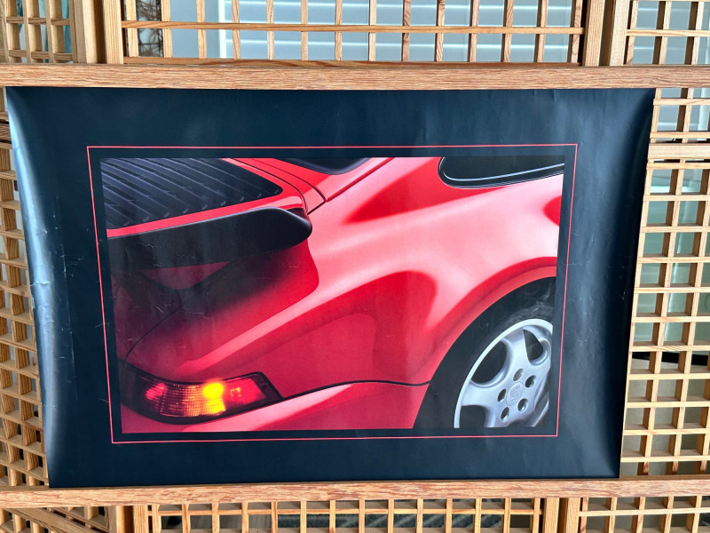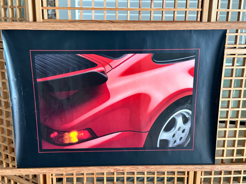 This framed promotional poster features the rear quarter view of a 1991 Porsche 911 Turbo, showcasing its iconic wide stance, integrated spoiler, and signature tail light design. Issued by Porsche Cars North America in 1990, the image captures the bold curves and engineering precision that defined the 964-era Turbo. The composition is bordered in red and mounted on a black background, emphasizing the car’s silhouette and performance pedigree. Dimensions: 18" L × 23" W (framed) Model Featured: 1991 Porsche 911 Turbo (Type 964) Publisher: Porsche Cars North America, Inc. – 1990 issue Design: Rear quarter view with red border, black matte background Condition: Light vintage wear; frame intact; ready to hang Background: This poster was part of Porsche’s early-’90s showroom and dealer promotional materials, celebrating the launch of the 964 Turbo—a model revered for its air-cooled engine, aggressive styling, and motorsport lineage.