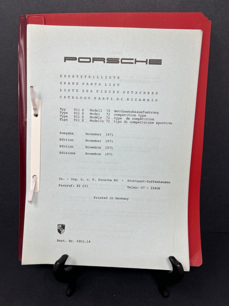 • Typ 911 Modell S 73 Tipo di competizione sportivo Edition Date: November 1971 Issued By: Dr.-Ing. h.c. F. Porsche KG – Stuttgart-Zuffenhausen Document Number: Best. Nr. 6801.14 Format: Multi-language bound catalog with metal fasteners; displayed on stand with red folder