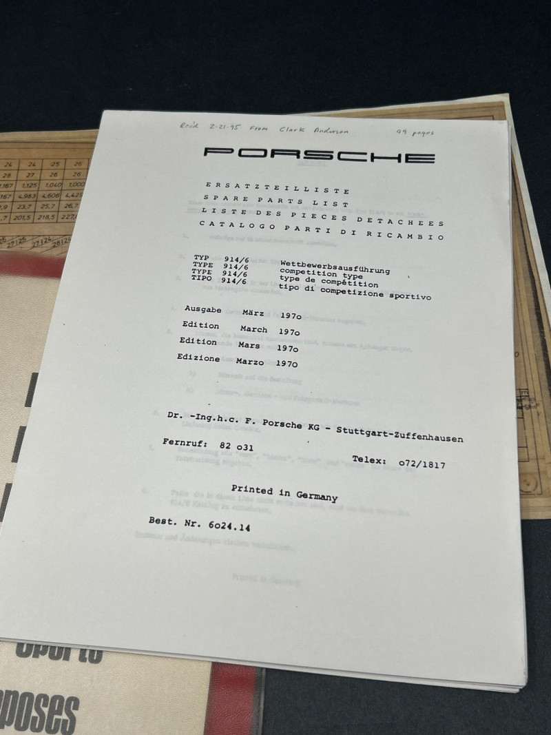 This rare trio of vintage Porsche documents offers a deep dive into the factory-issued specifications and performance data for the 1970 model year, with a focus on the 911 S and 914/6 models used in motorsport applications. Issued by Dr.-Ing. h.c. F. Porsche KG, Stuttgart-Zuffenhausen, the set includes 'Sport Purpose' catalog, laminated gear charts, homologation paperwork, and internal sale listings—ideal for collectors, historians, and restoration purists. Includes: