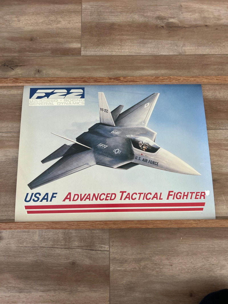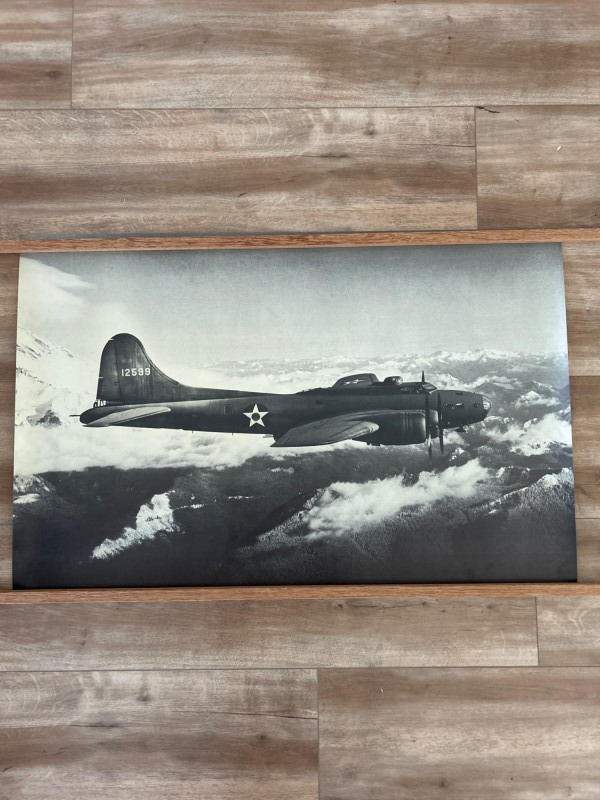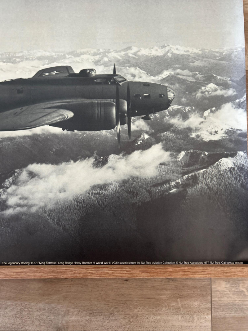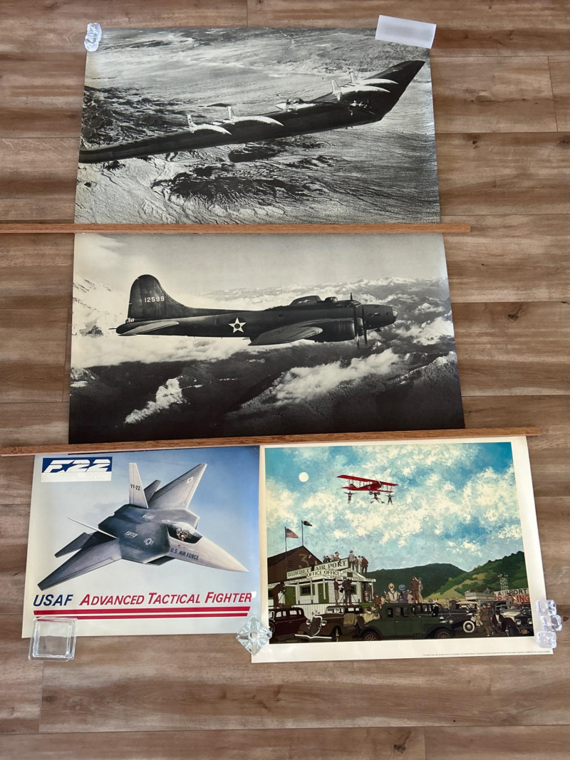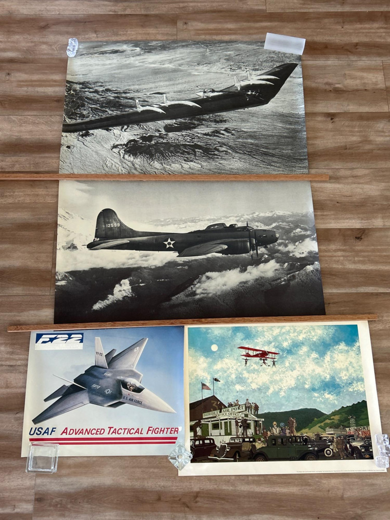 A striking quartet of aviation-themed prints spanning mid-century military might to modern fighter innovation: B-17 Flying Fortress (B&W) – A classic WWII bomber in flight, captured in crisp grayscale with U.S. military insignia. B-36 Peacemaker (B&W) – Monumental Cold War bomber soaring over rugged terrain—massive wingspan, haunting silhouette. F-22 Lockheed Tactical Fighter (Color) – Sleek, angular, and futuristic—an official USAF concept print from the Advanced Tactical Fighter program. Vintage Biplane Celebration Scene (Color) – A nostalgic illustration featuring a biplane above a festive crowd, vintage automobile, and flag-draped building—aviation meets Americana. Dimensions: Vary slightly; all suitable for framing. Largest Measures- 24 x 36 Smallest- 14 x 25
