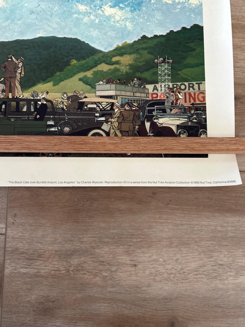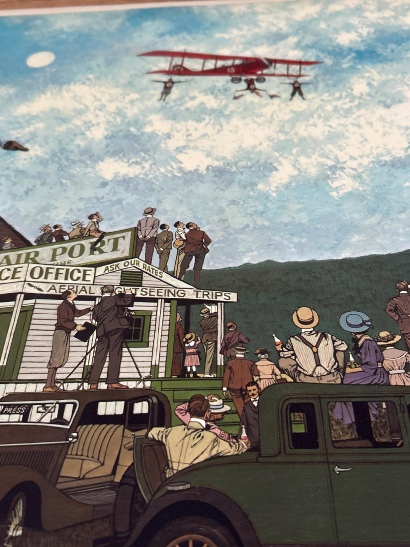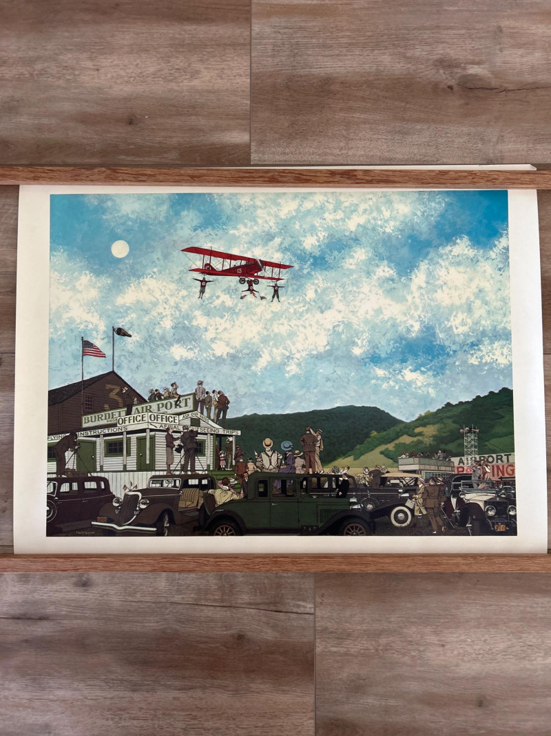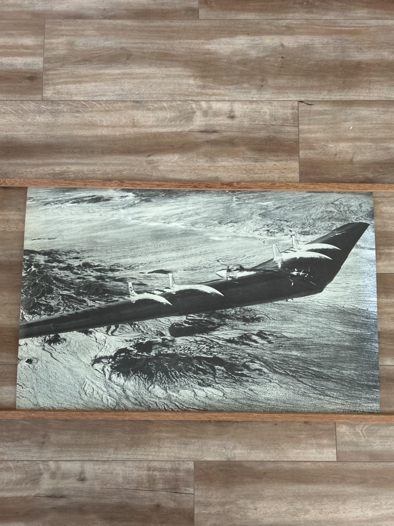 A striking quartet of aviation-themed prints spanning mid-century military might to modern fighter innovation: B-17 Flying Fortress (B&W) – A classic WWII bomber in flight, captured in crisp grayscale with U.S. military insignia. B-36 Peacemaker (B&W) – Monumental Cold War bomber soaring over rugged terrain—massive wingspan, haunting silhouette. F-22 Lockheed Tactical Fighter (Color) – Sleek, angular, and futuristic—an official USAF concept print from the Advanced Tactical Fighter program. Vintage Biplane Celebration Scene (Color) – A nostalgic illustration featuring a biplane above a festive crowd, vintage automobile, and flag-draped building—aviation meets Americana. Dimensions: Vary slightly; all suitable for framing. Largest Measures- 24 x 36 Smallest- 14 x 25