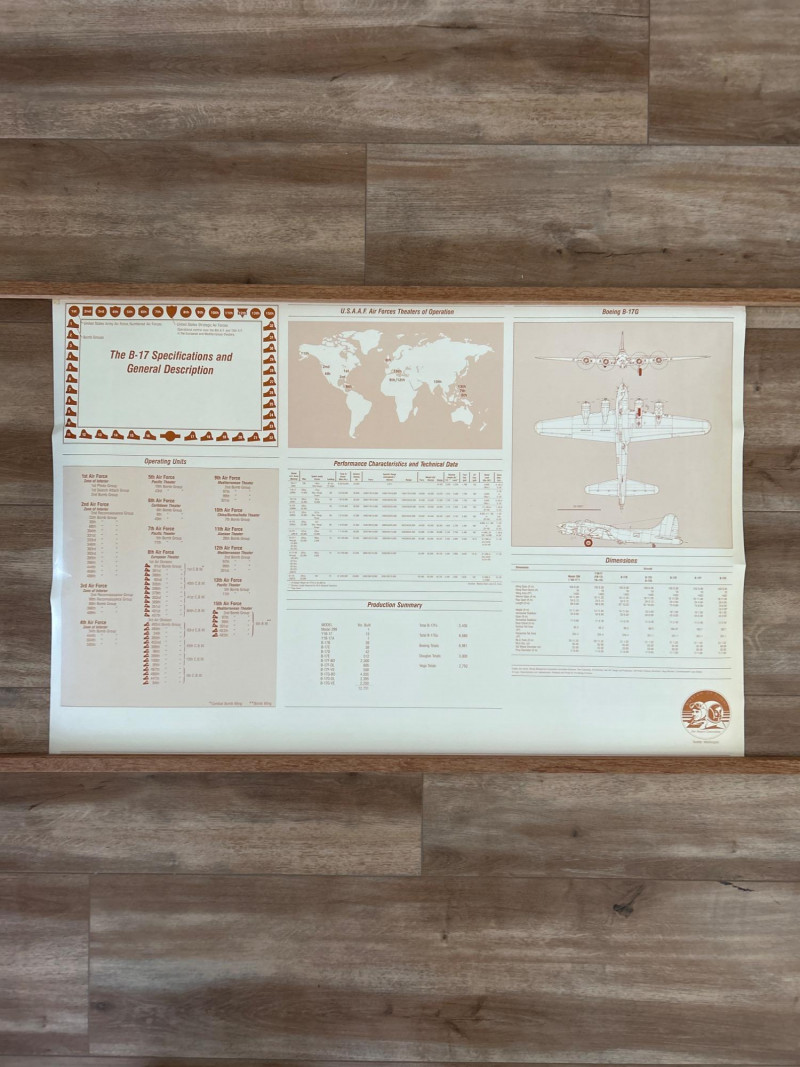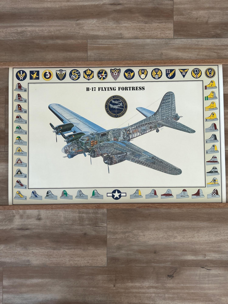 From WWII bombers to Cold War stealth—three icons in print. This set of three aviation-themed posters offers a visual tribute to two of the most legendary aircraft in U.S. military history. Ideal for collectors, veterans, or aviation buffs, each piece blends technical detail with historical reverence. Detailed cutaway illustrations of the B-17 Flying Fortress, revealing internal crew positions, armament, and structural components. Surrounding the aircraft are unit insignias and emblems representing various squadrons. Style: Technical illustration with labeled interior views Dimensions: Approx. 34" × 24" each 🧾 Condition: Light wear; strong color retention A black-and-white montage featuring the SR-71 Blackbird, the legendary Cold War reconnaissance aircraft. Includes tarmac portrait with crew, in-flight imagery, and dynamic angles showcasing its sleek design. Aircraft: Lockheed SR-71 Blackbird Style: Photographic collage Dimensions: Approx. 34" × 24" Condition: Light wear; crisp photographic detail B17. 34x24B-17 Flying Fortress Cutaway Posters (2 identical prints)