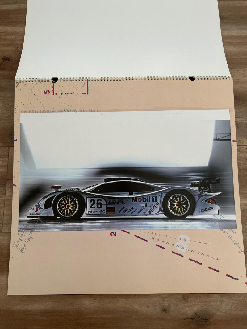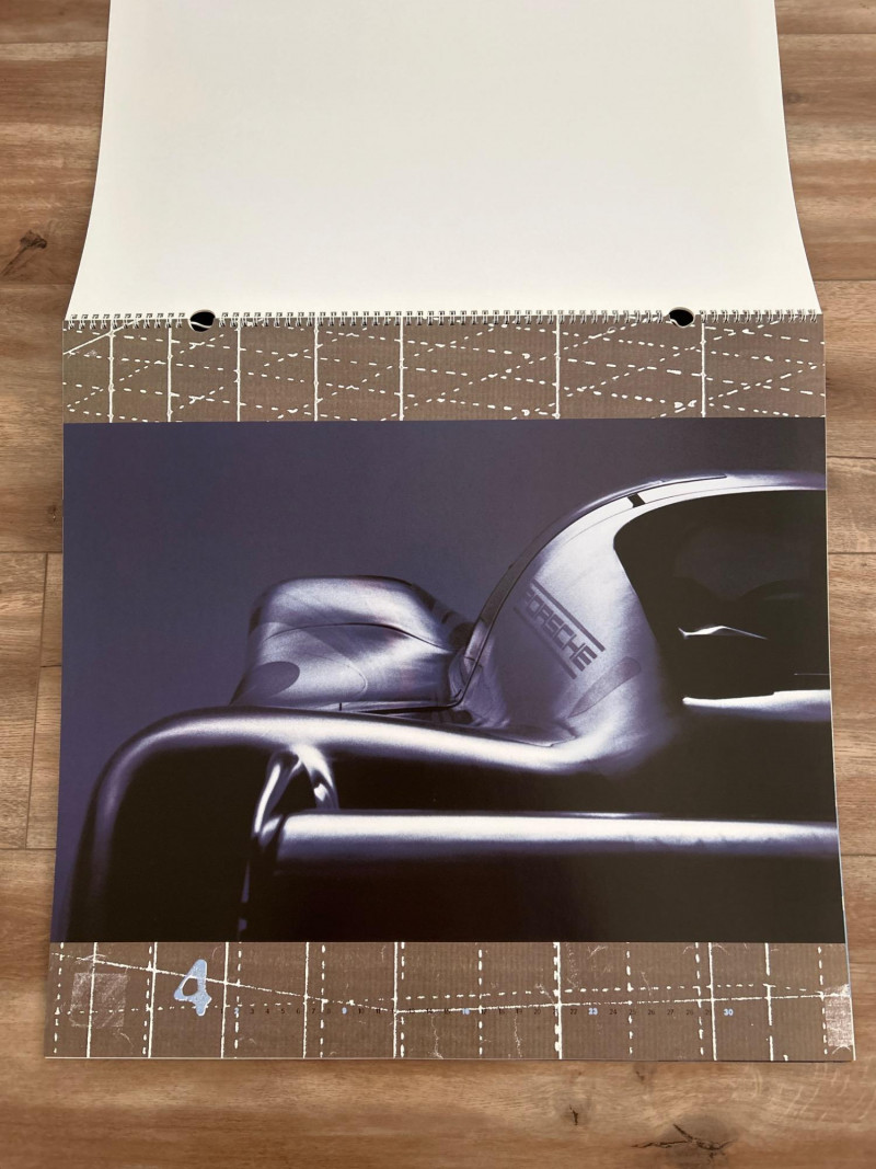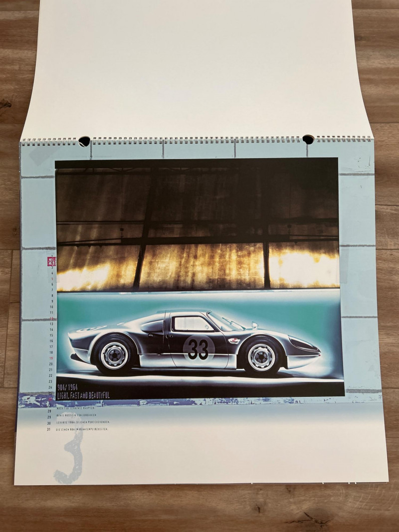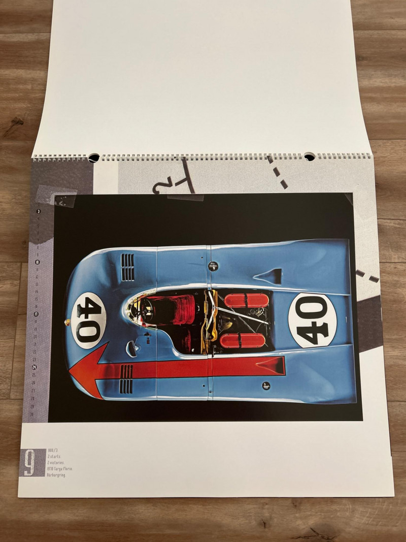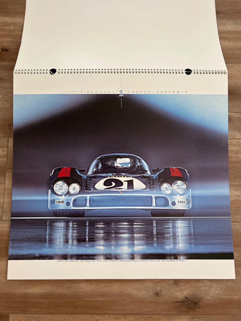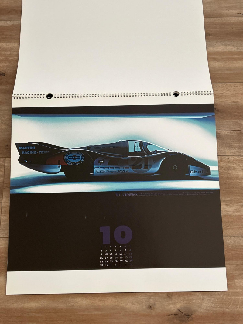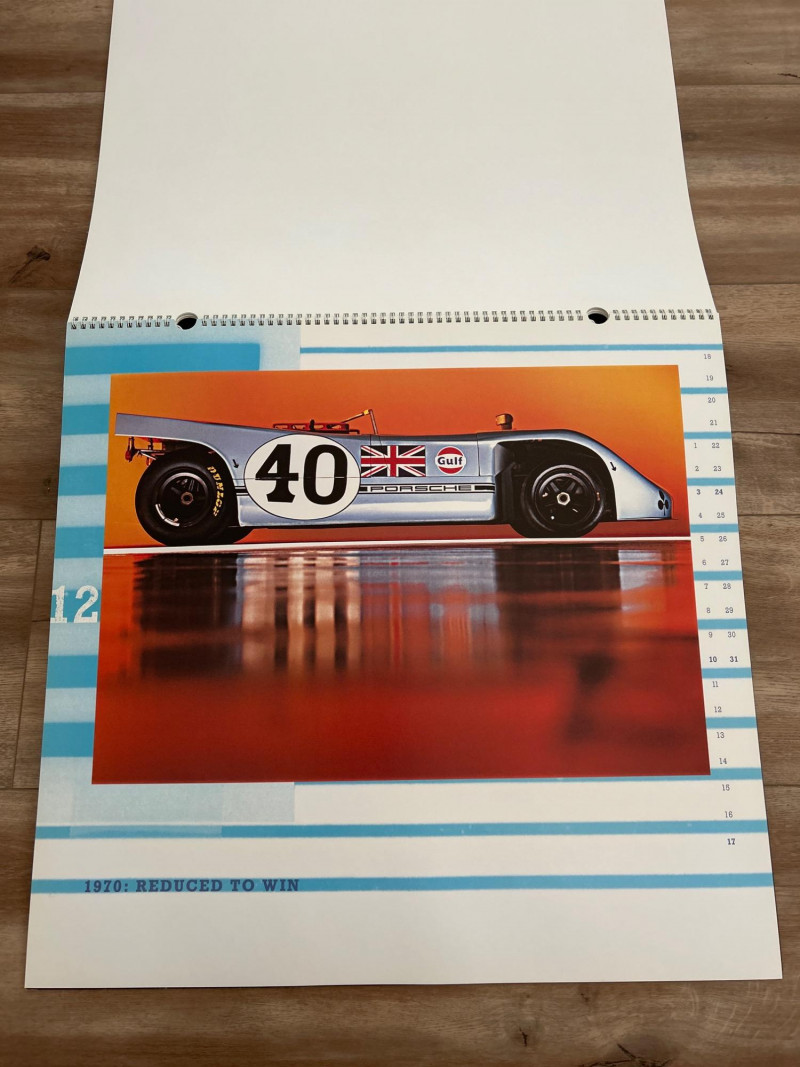 A richly styled tribute to Porsche’s racing heritage, this full-format calendar blends vintage aesthetics with bold design. The October page features a profile shot of the iconic #46 Porsche—painted in deep red, set against a warm sepia gradient, and titled “Historics Air Stream.” Design Details: Horizontal pastel stripes and stylized typography give each page a retro-modern feel, ideal for framing or display. Complete Calendar: Measures 23" x 24", with all months intact. Collector’s Note: A visual celebration of Porsche’s legacy—perfect for motorsport enthusiasts, vintage décor lovers, or anyone who appreciates the art of speed.