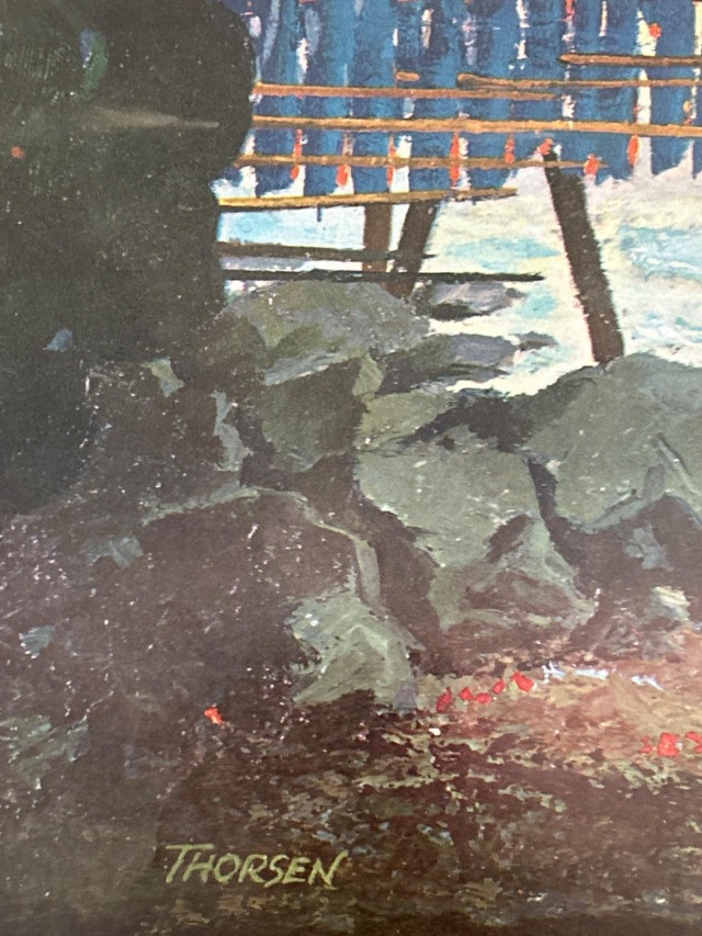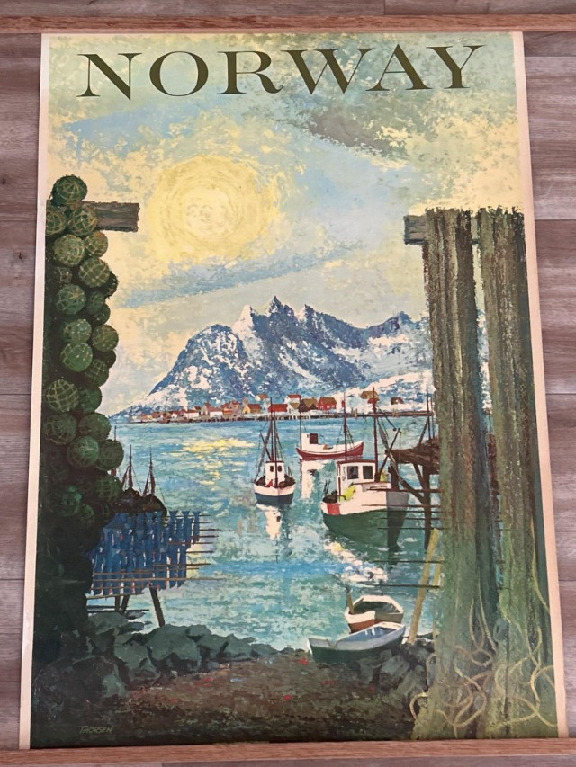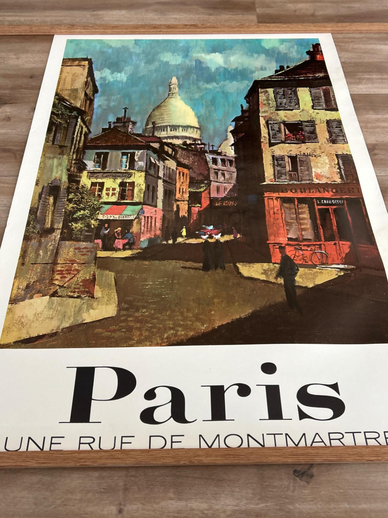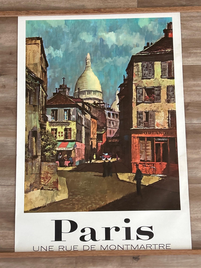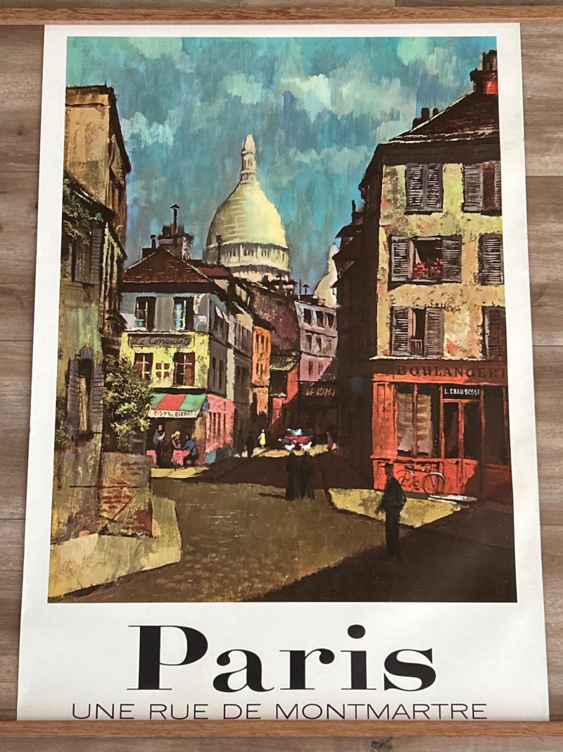 A charming pair of vintage-style travel prints celebrating two iconic destinations—one romantic, one rugged. Paris – “Une Rue de Montmartre”: A nostalgic street scene from the heart of Montmartre, with cobblestone paths, colorful facades, and the Sacré-Cœur dome rising in the distance. A classic mid-century rendering full of Parisian warmth and charm. Norway – Lars Thorsen Coastal View (1940s): A serene fjord-side tableau with boats docked near a wooden pier, lush greenery, and mountainous terrain under a bright Nordic sky. Signed by artist Lars Thorsen, this piece captures the quiet majesty of Norway’s natural beauty. Dimensions: Not specified; both suitable for framing Collector’s Note: A beautifully balanced duo—ideal for travel enthusiasts, vintage décor lovers, or anyone curating a wall of wanderlust.