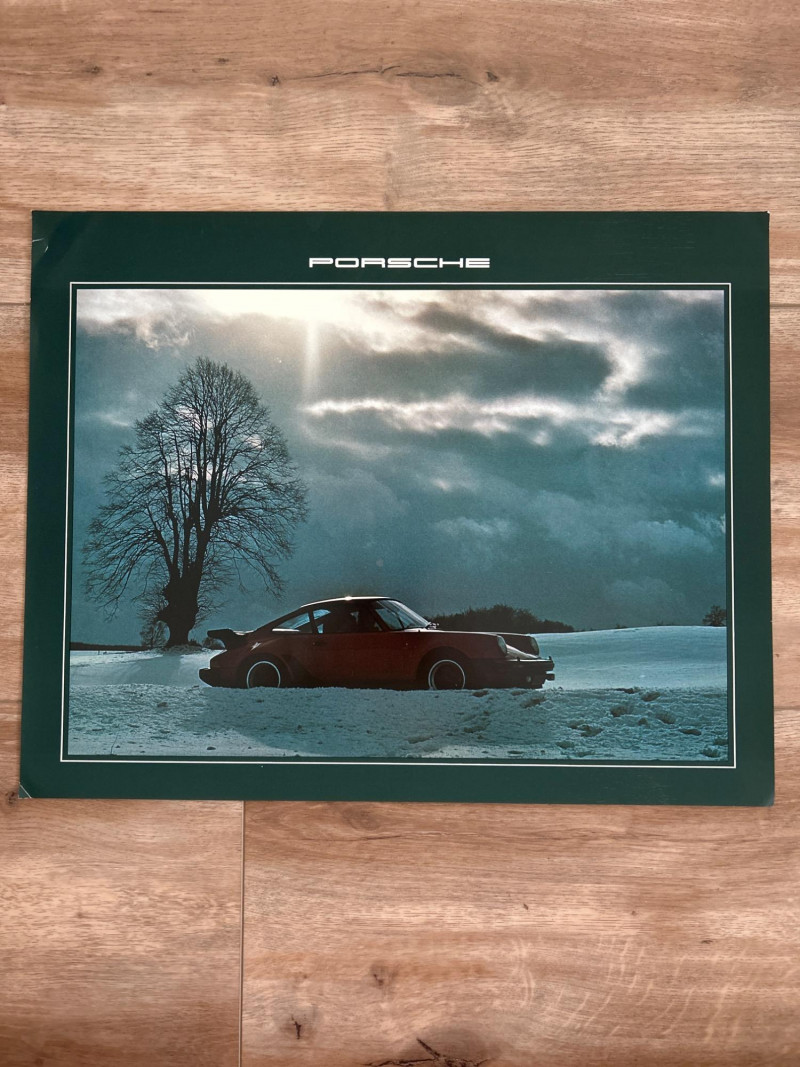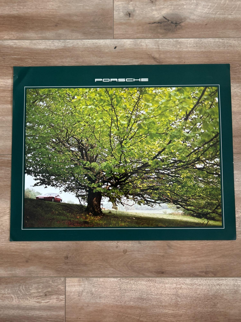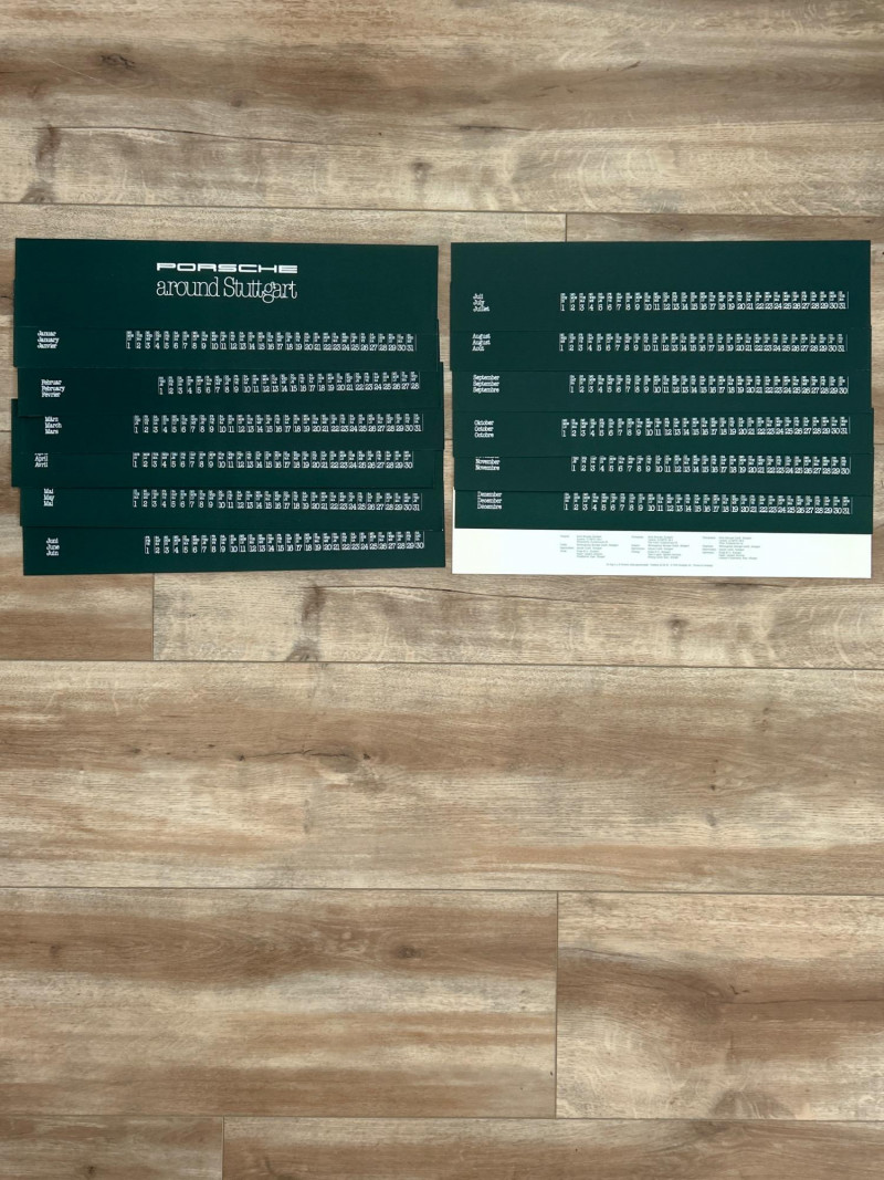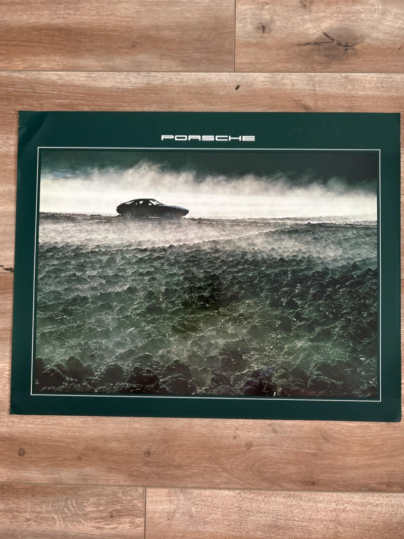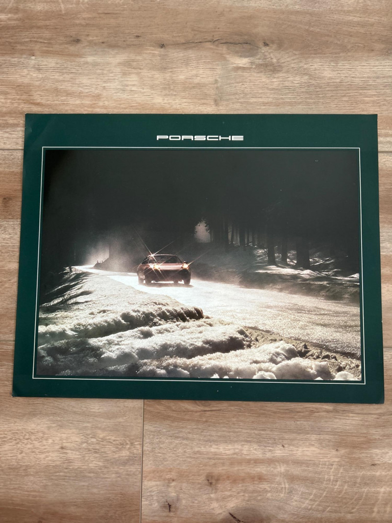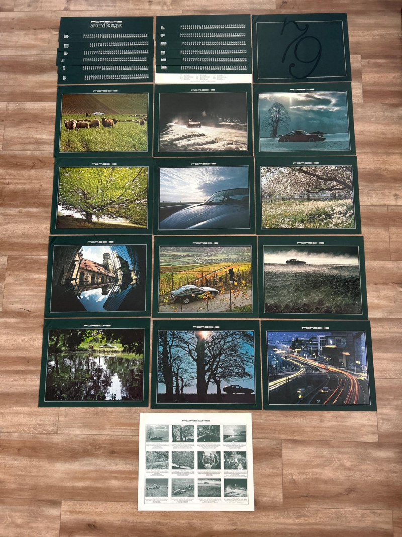 A visually engaging set of 18" x 14.5" calendar inserts from Porsche’s 1979 promotional series, blending automotive imagery with environmental and infrastructural themes. Photographic Range: Includes 12 vivid prints featuring Porsche vehicles in diverse settings—foggy roads, snowy forests, urban tunnels, and scenic landscapes. Environmental Contexts: Cows in pasture, boats on water, bare trees, and rocky terrain suggest a broader narrative of motion through nature and infrastructure. Supplemental Pages: Includes black-and-white index sheet and two black pages with white tabulated data—likely technical specs or thematic notes. Collector’s Note: A rare and eclectic Porsche calendar set with educational flair—ideal for framing, studio inspiration, or collectors of automotive ephemera with a conceptual twist.
