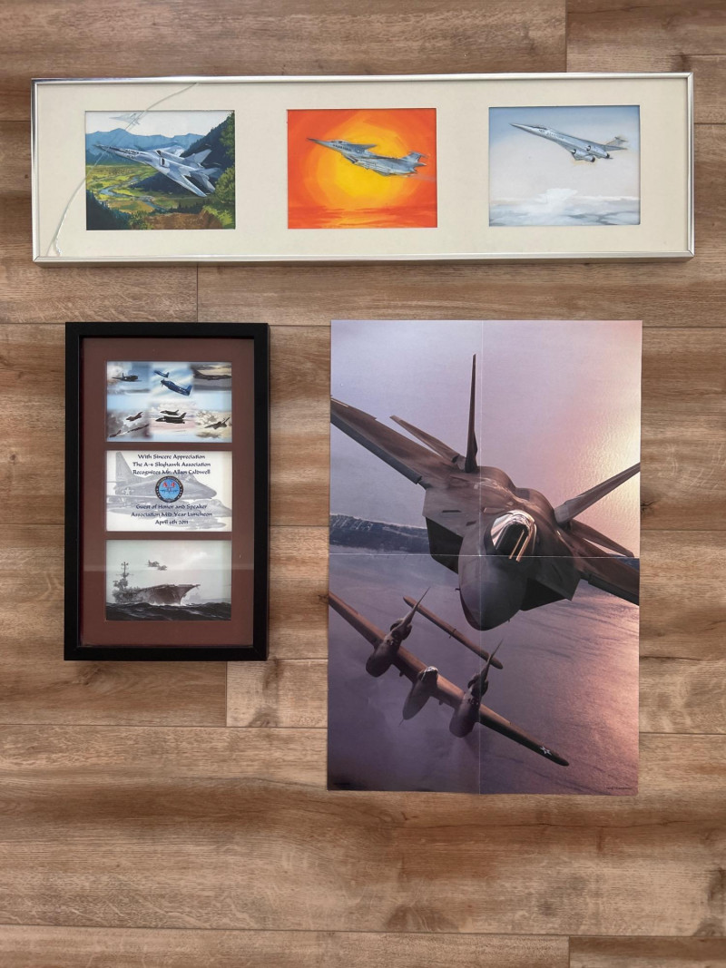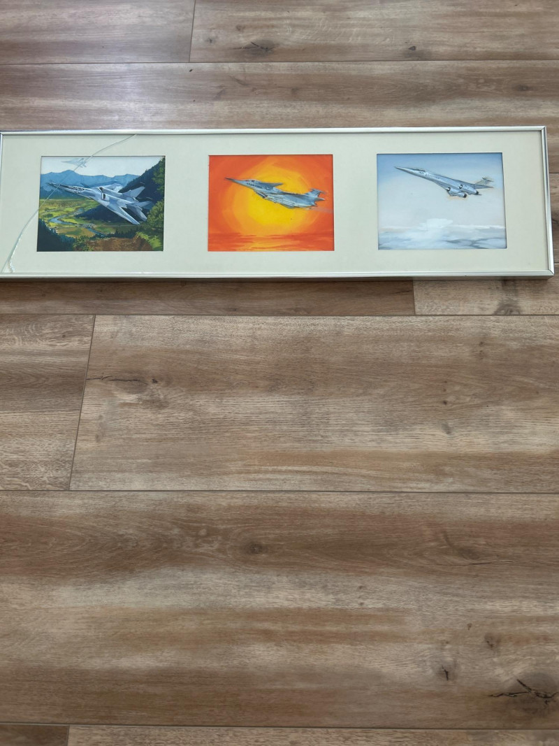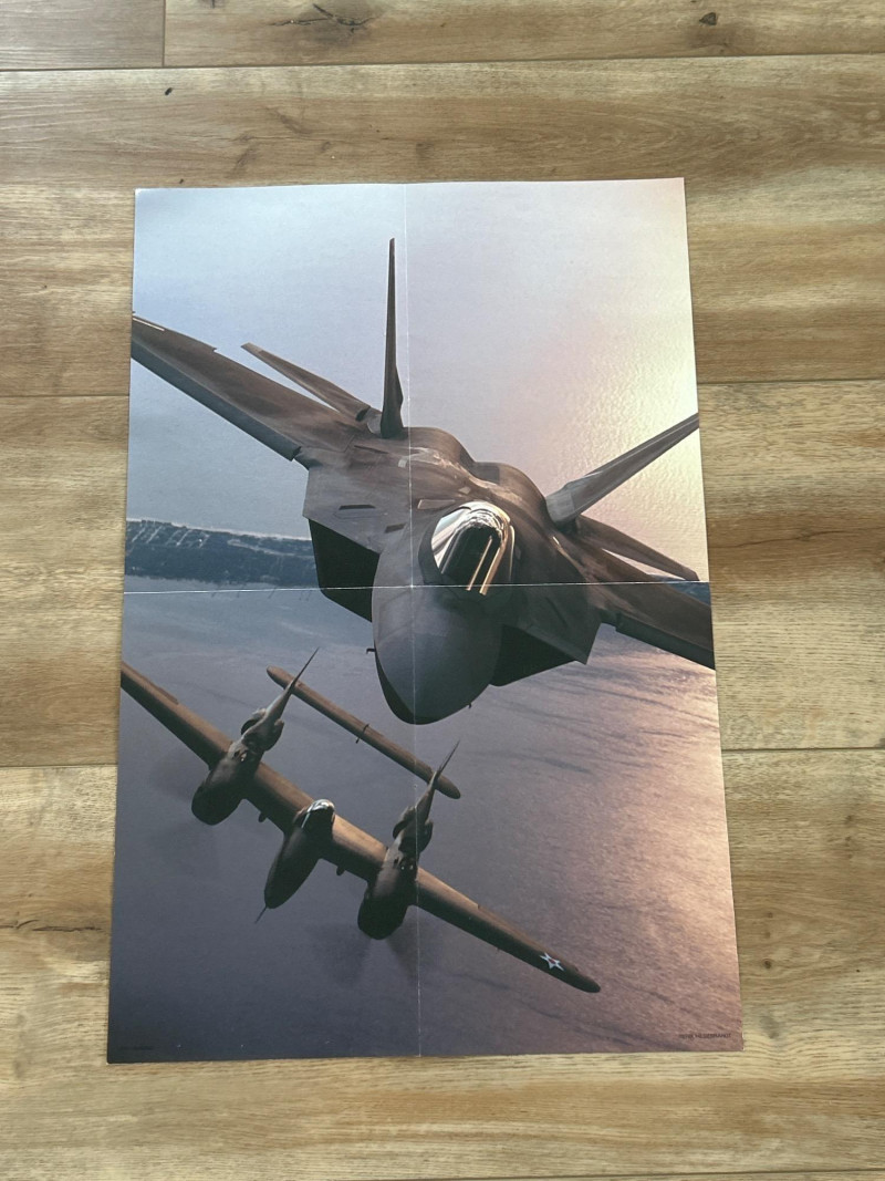 Top Frame (29" x 8", cracked glass): A panoramic triptych of fighter jets in motion—one slicing through alpine peaks, another silhouetted against a blazing sunset, and a third ghosting through cloud cover. Left Frame (9" x 15"): A commemorative display honoring the first carrier arrested landing of the F/A-18E Super Hornet aboard the USS John C. Stennis (CVN 74), dated January 18, 1997. Includes a flight photo, carrier image, and official plaque. Fold-Out Poster (21.5" x 14"): A dramatic close-up of a stealth fighter jet in flight, with a second aircraft trailing below—evoking the thrill of high-stakes maneuvers over water and mountainous terrain. Condition Note:
