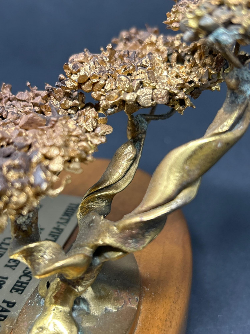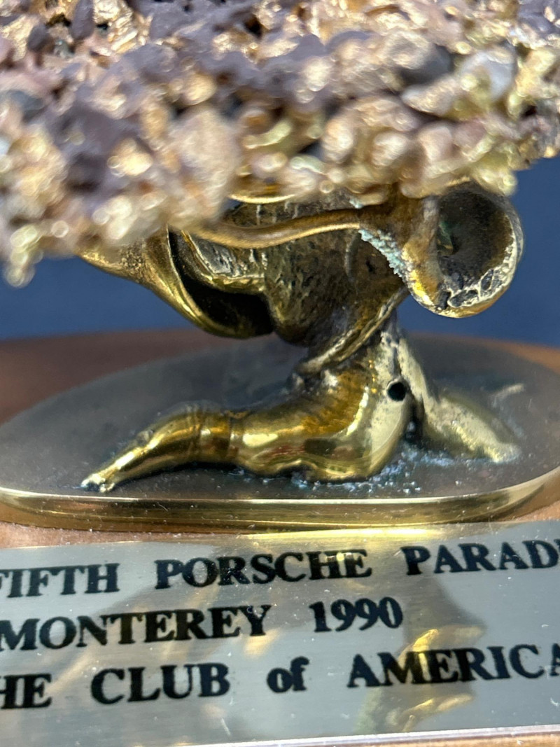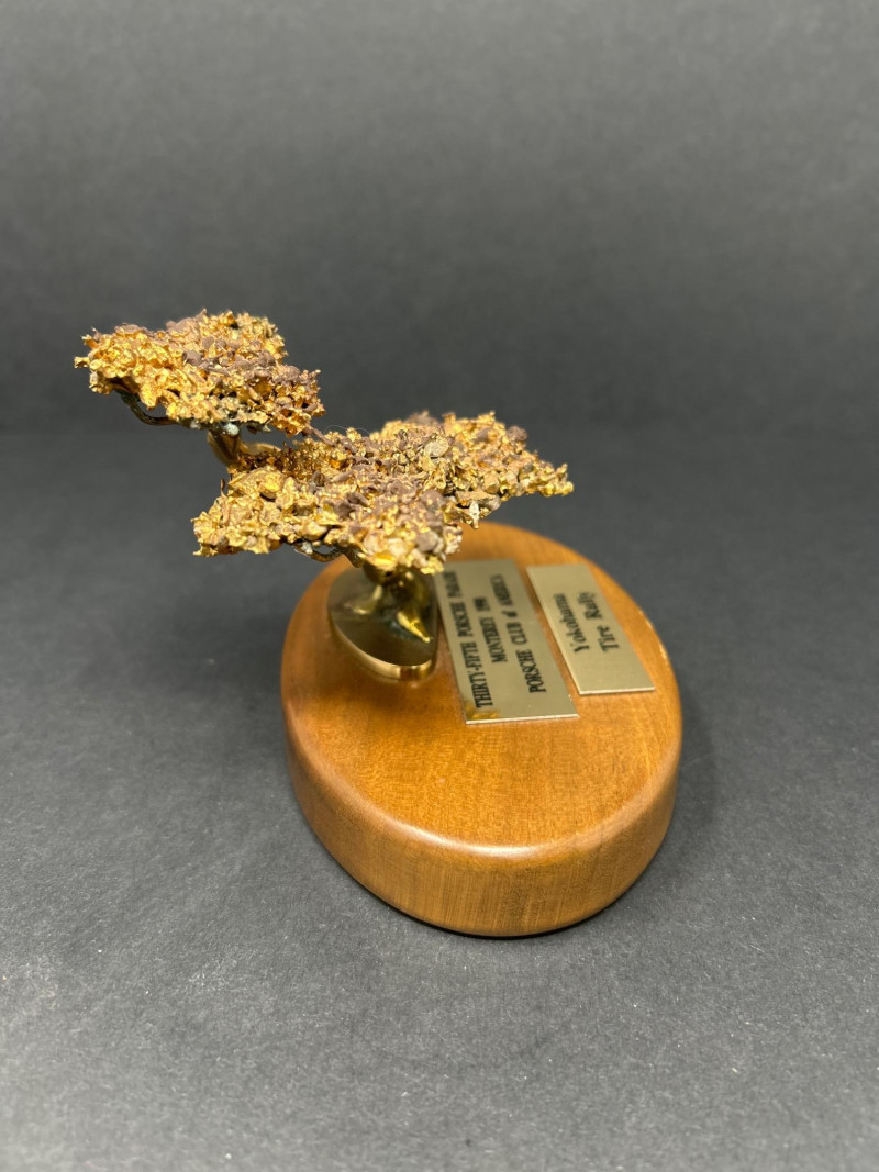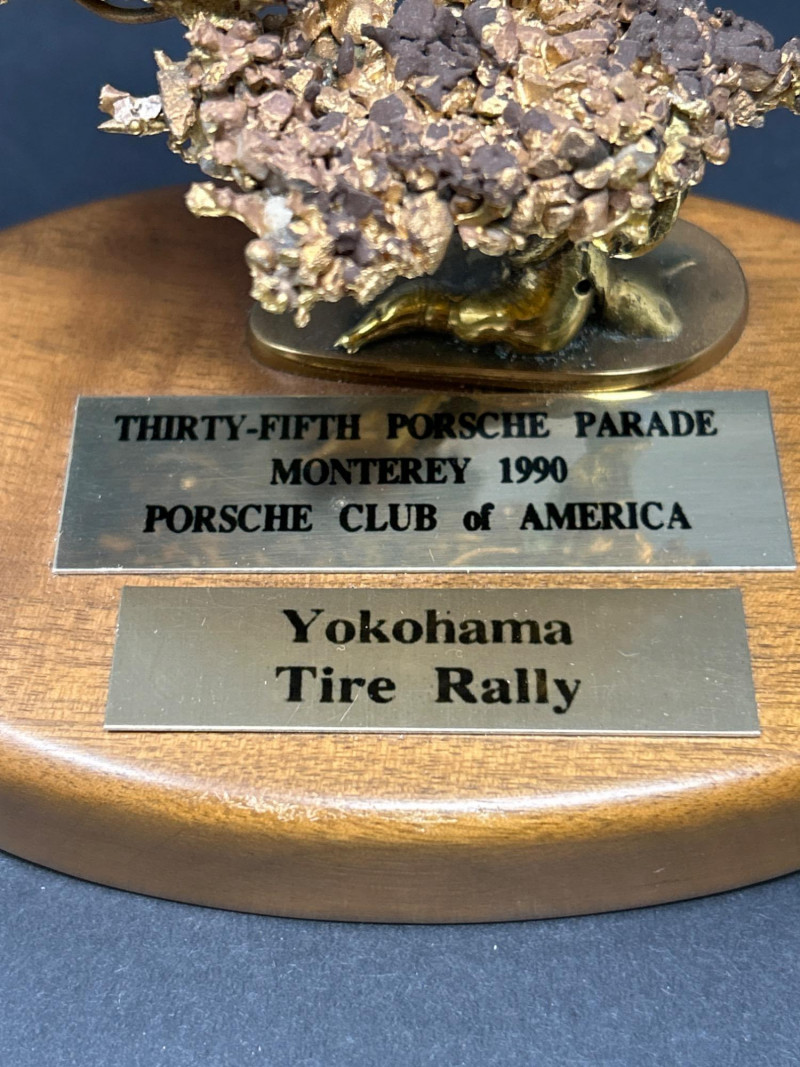 A rare and artful award from the Thirty-Fifth Porsche Parade, held in Monterey in 1990, this sculptural trophy commemorates the Yokohama Tire Rally—a sponsored event within the Porsche Club of America’s prestigious annual gathering. Design: A finely crafted Lone Cypres sculpture, rendered in metal with intricate foliage and branching detail, mounted on a polished wooden base. Engraving: Three plaques adorn the base, including: “THIRTY-FIFTH PORSCHE PARADE / MONTEREY 1990 / PORSCHE CLUB OF AMERICA” “Yokohama / Tire Rally” 6 W x 4" Tall x 3.5 D