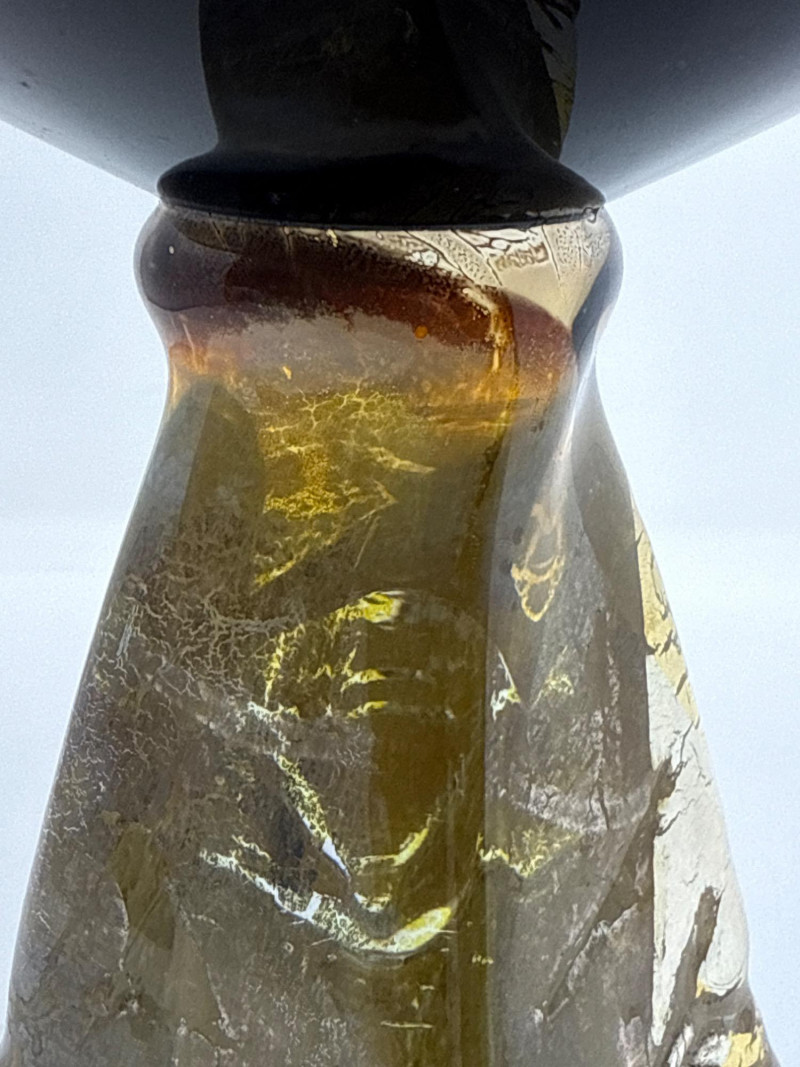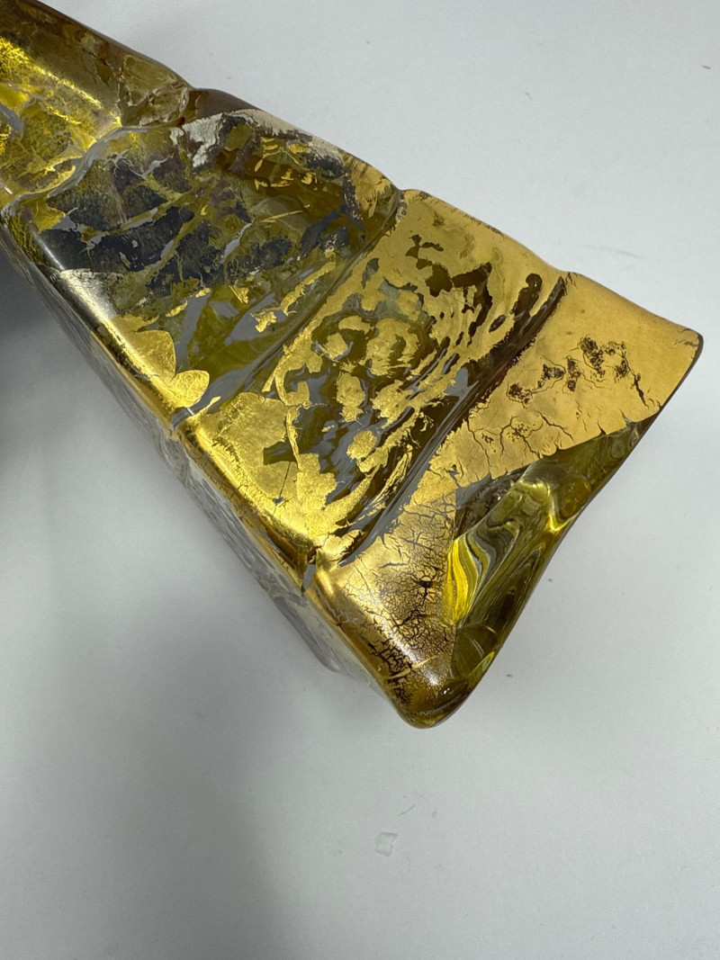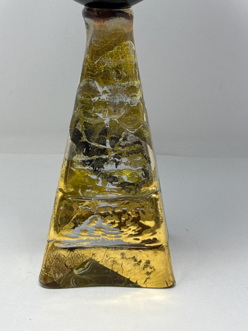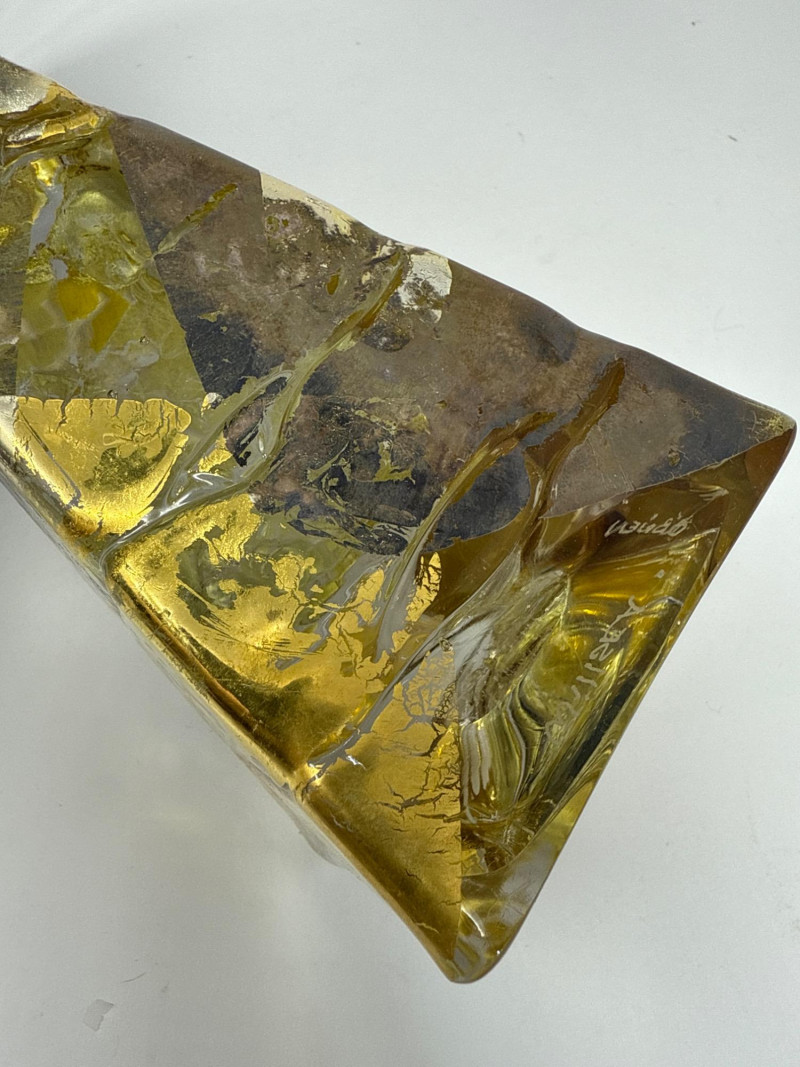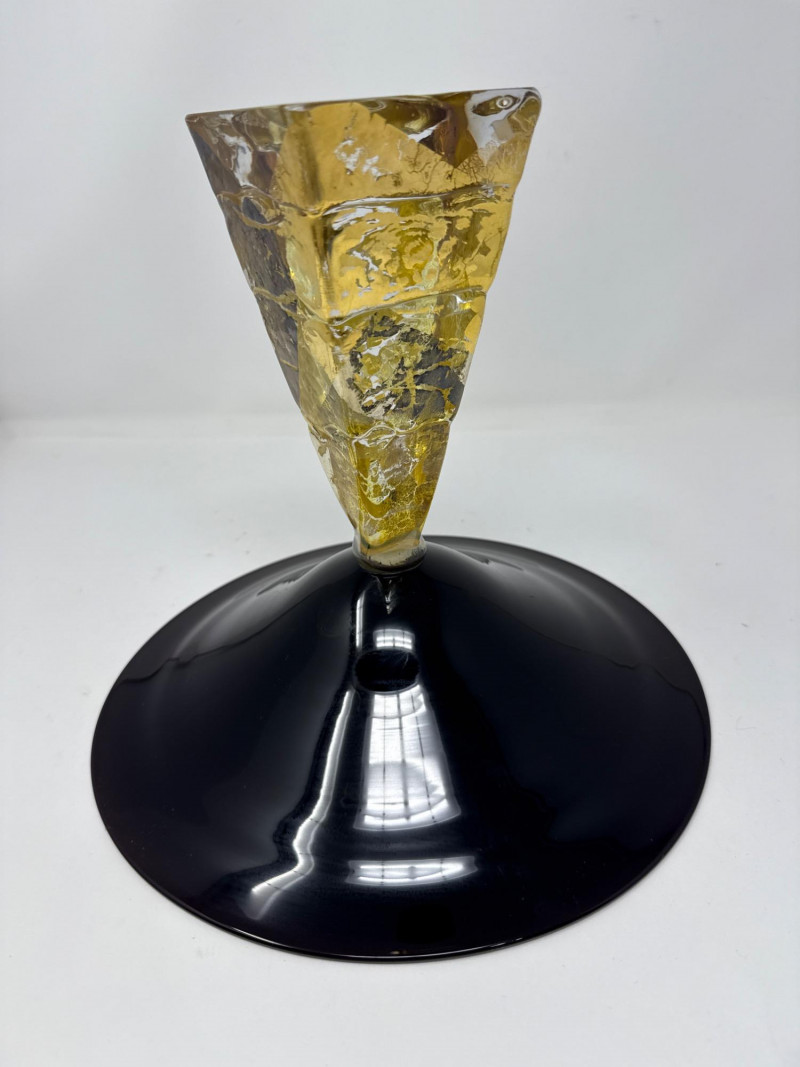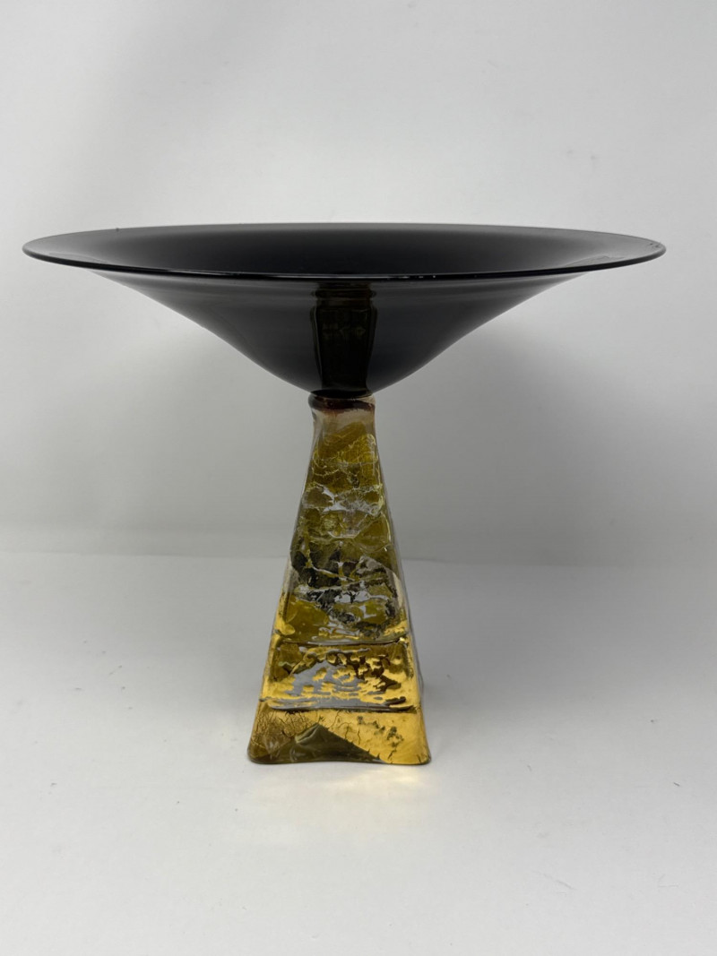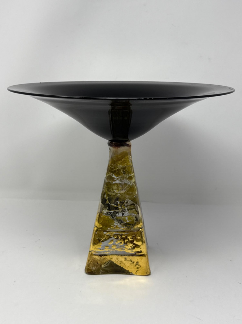 A bold fusion of sculptural geometry and studio glass artistry, this Willsea O’Brien pedestal bowl is a masterclass in contrast and form. The shallow, wide-rimmed basin is crafted from deep black glass with a mirror-like polish, flaring outward in a smooth, uninterrupted curve that catches light along its edge like a halo. Anchoring the bowl is a dramatic triangular pedestal—formed from clear glass infused with gold leaf and veined metallic texture. The base’s pyramid shape tapers upward with rounded corners and a slender neck, creating a striking architectural silhouette. The gold leaf appears suspended within the glass, giving the pedestal a luminous, crackled effect that evokes molten metal or gilded stone. Dimensions: 11" W × 10" H